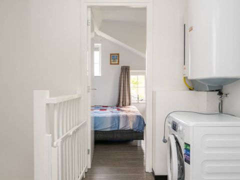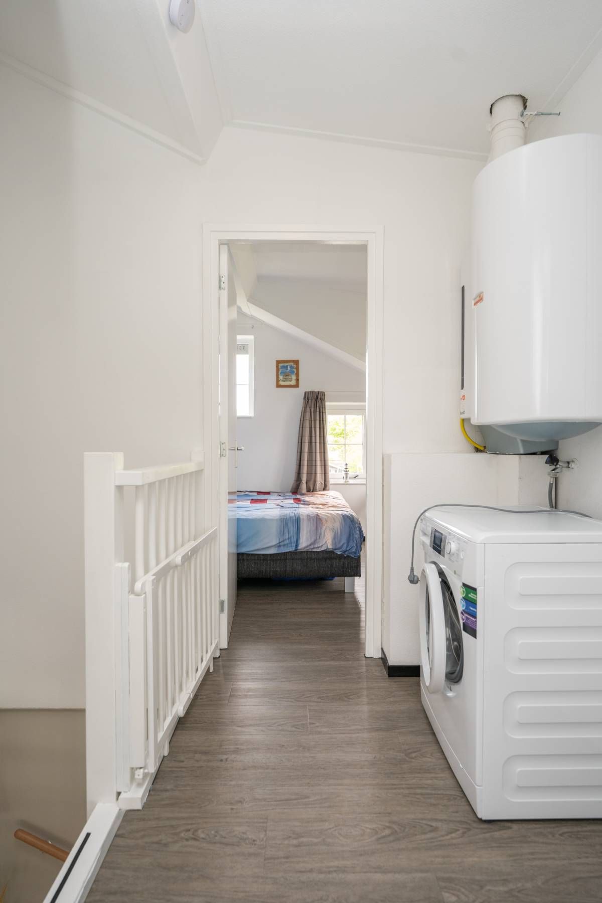 1e verdieping | Via de trapopgang bereikt u de overloop. Hier bevindt zich de opstelplaats voor de wasmachine en de cv.