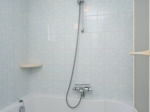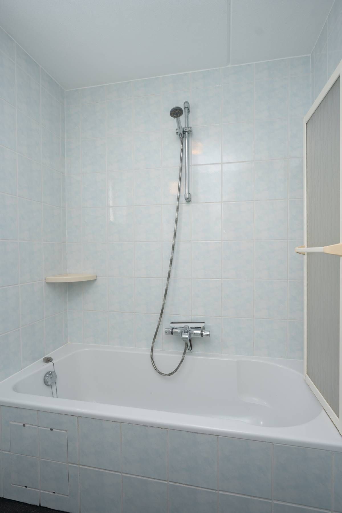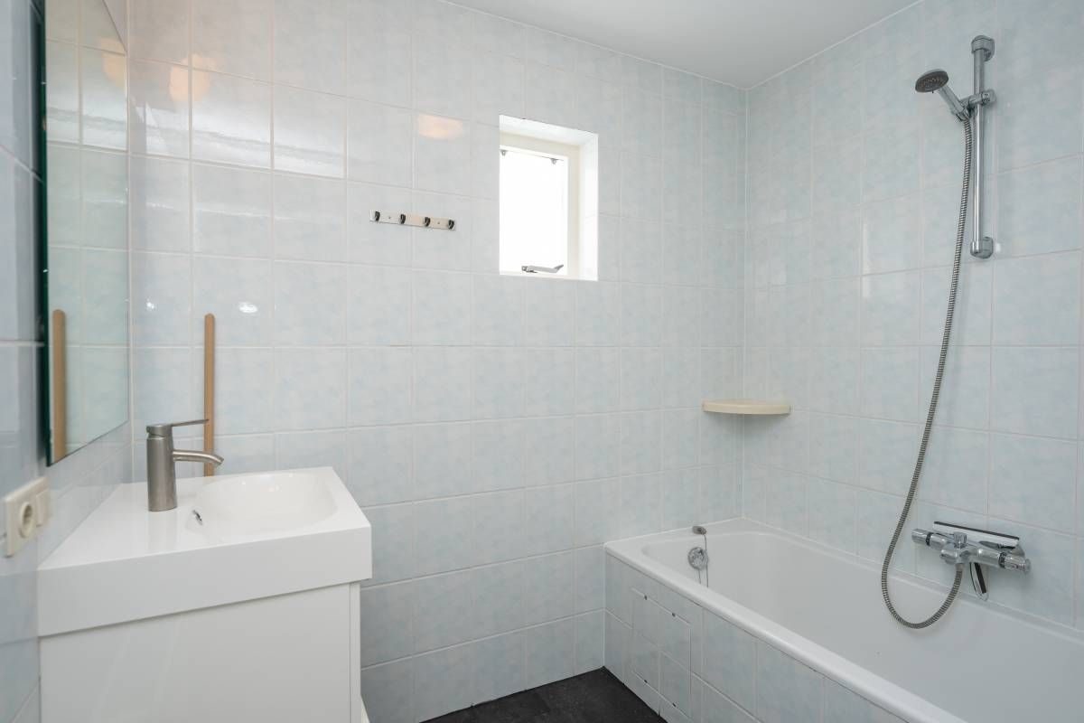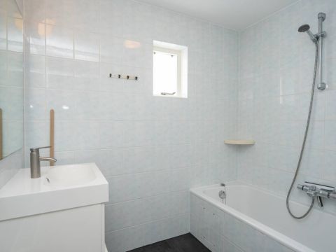De nette badkamer op de begane grond is voorzien van een wastafelmeubel en een compact ligbad met douche.