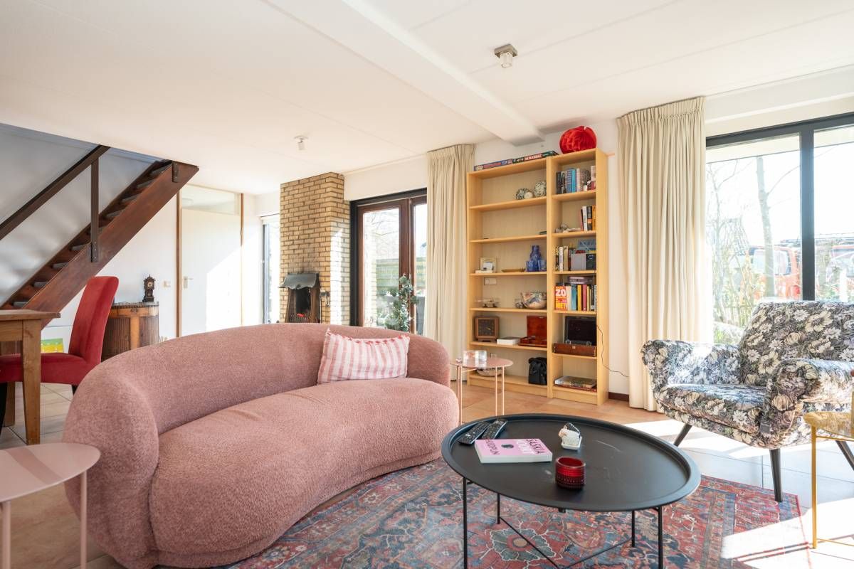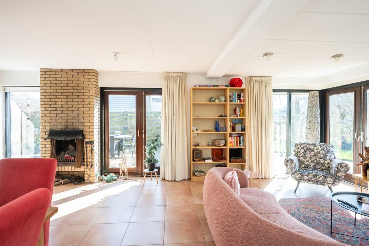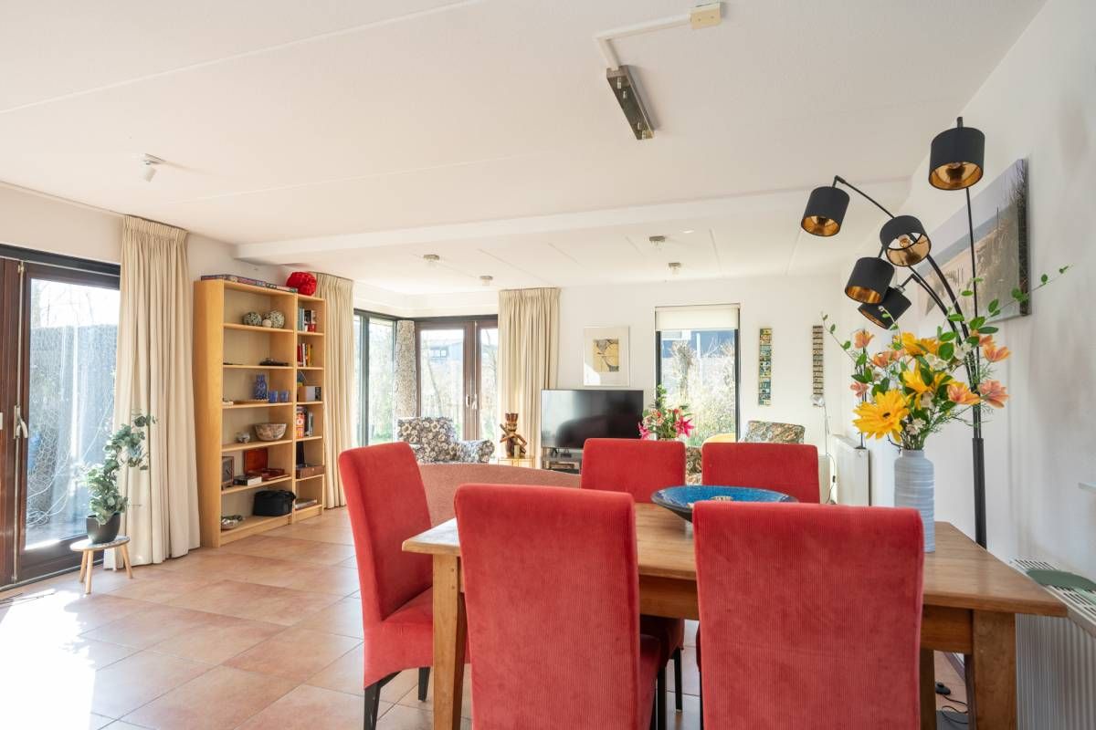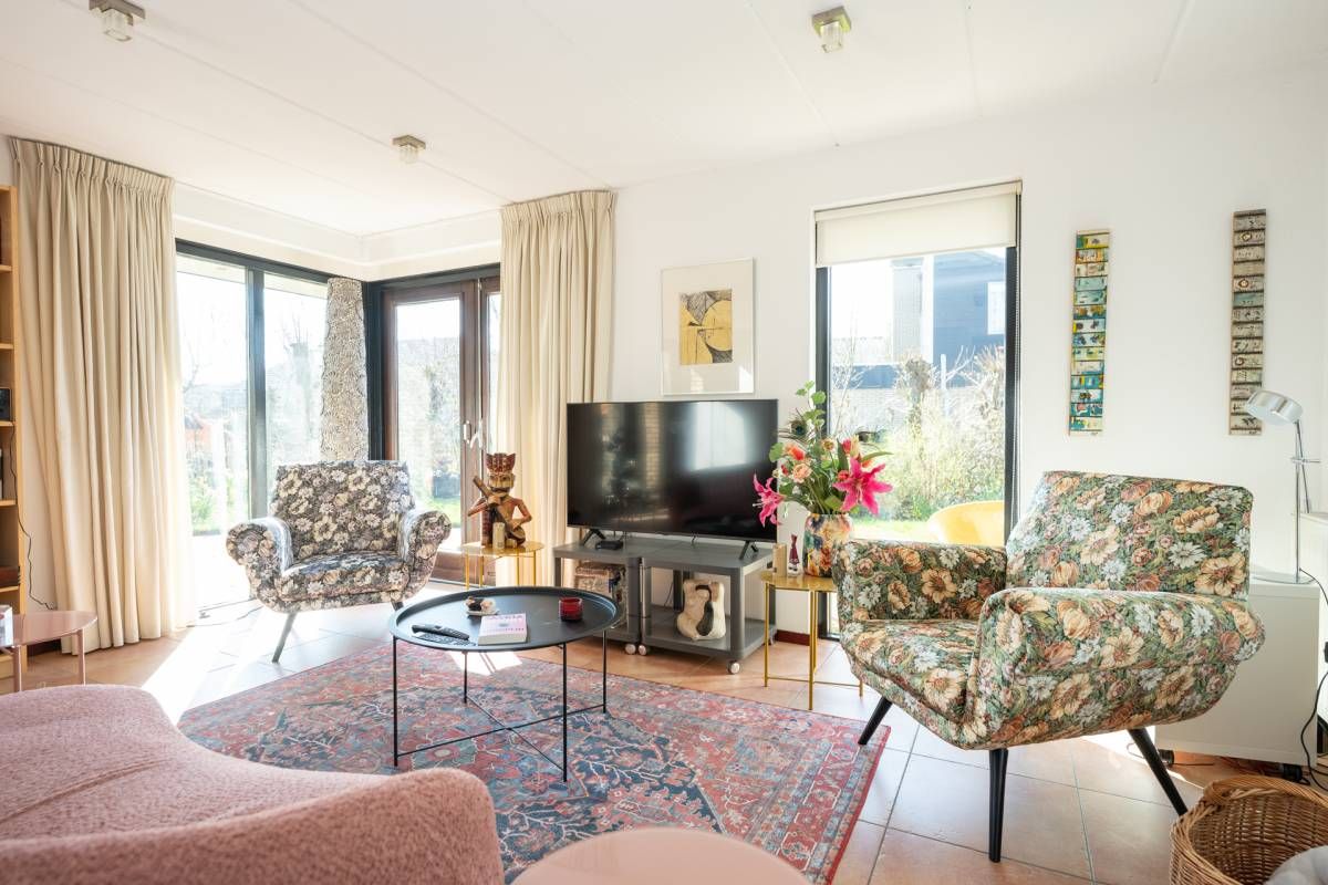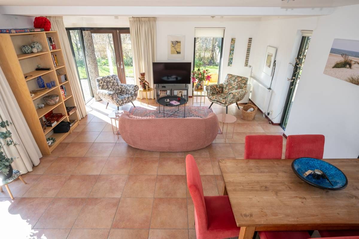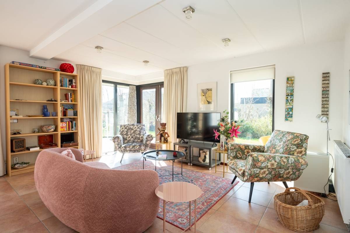 De woning verwelkomt u met een lichte en sfeervolle woonkamer, waarin grote ramen een prachtig uitzicht bieden op de tuin.