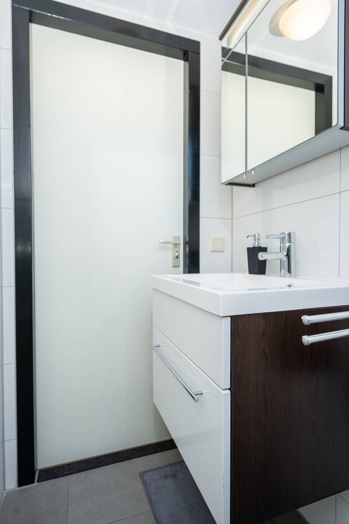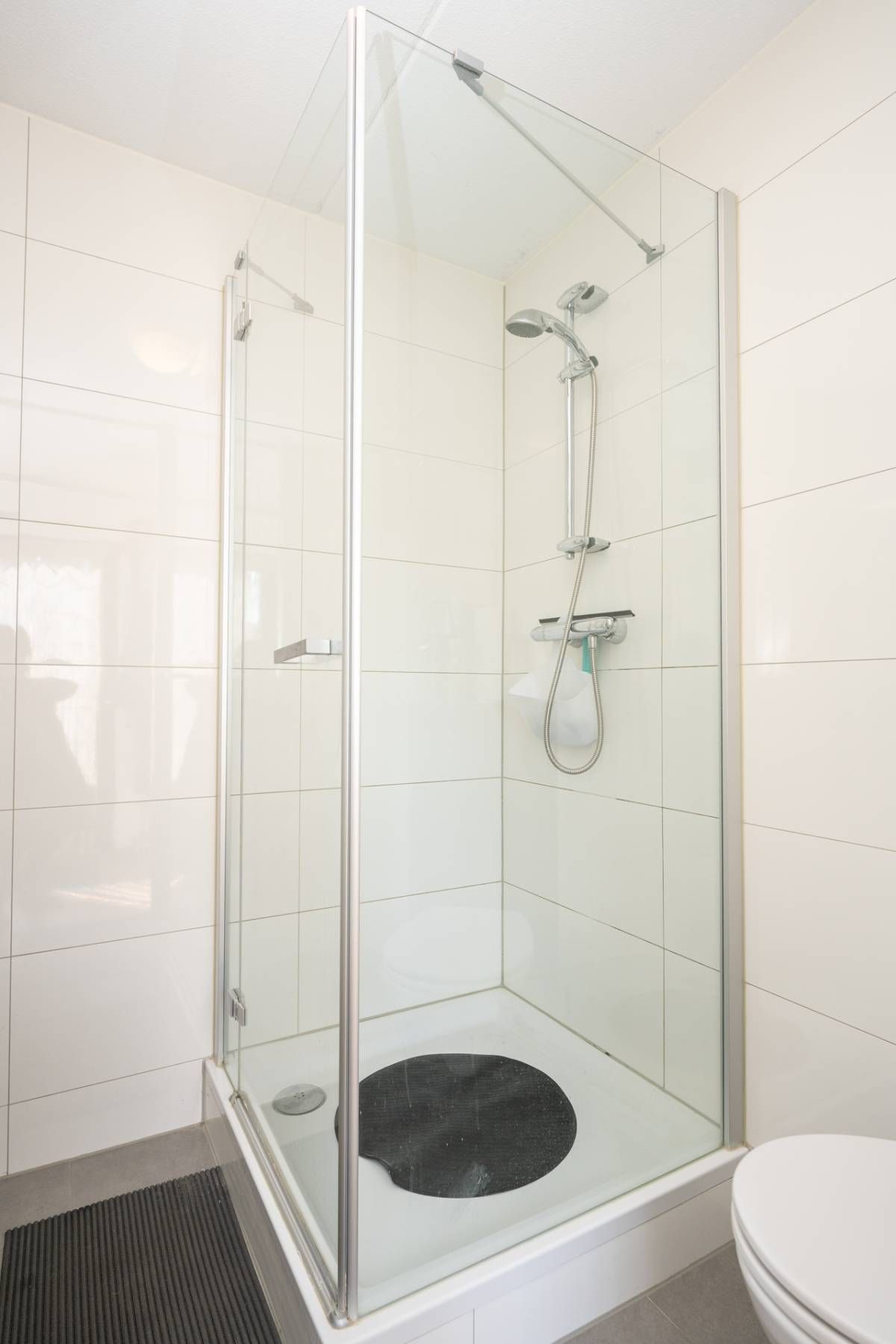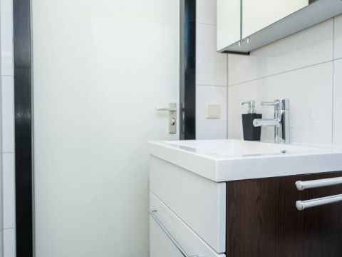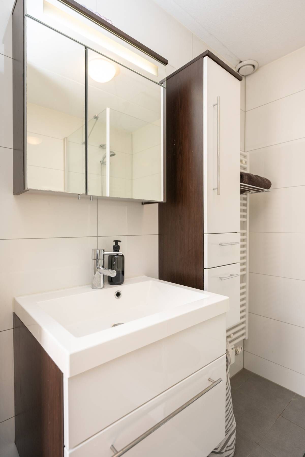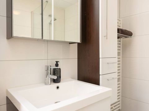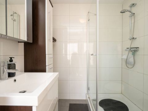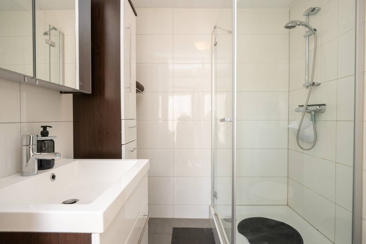 De moderne badkamer is voorzien van een douche, wastafelmeubel mét voldoende opbergruimte en een toilet.