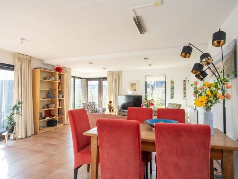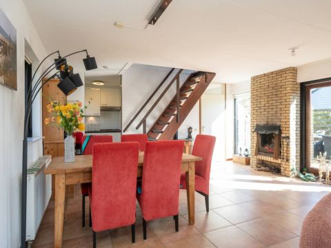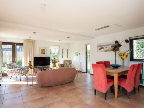 De living beschikt over een knusse open haard. Via de openslaande deuren loopt u gemakkelijk naar de beschutte patio, voorzien van een prettig terras waar u in alle rust van de zon kunt genieten.