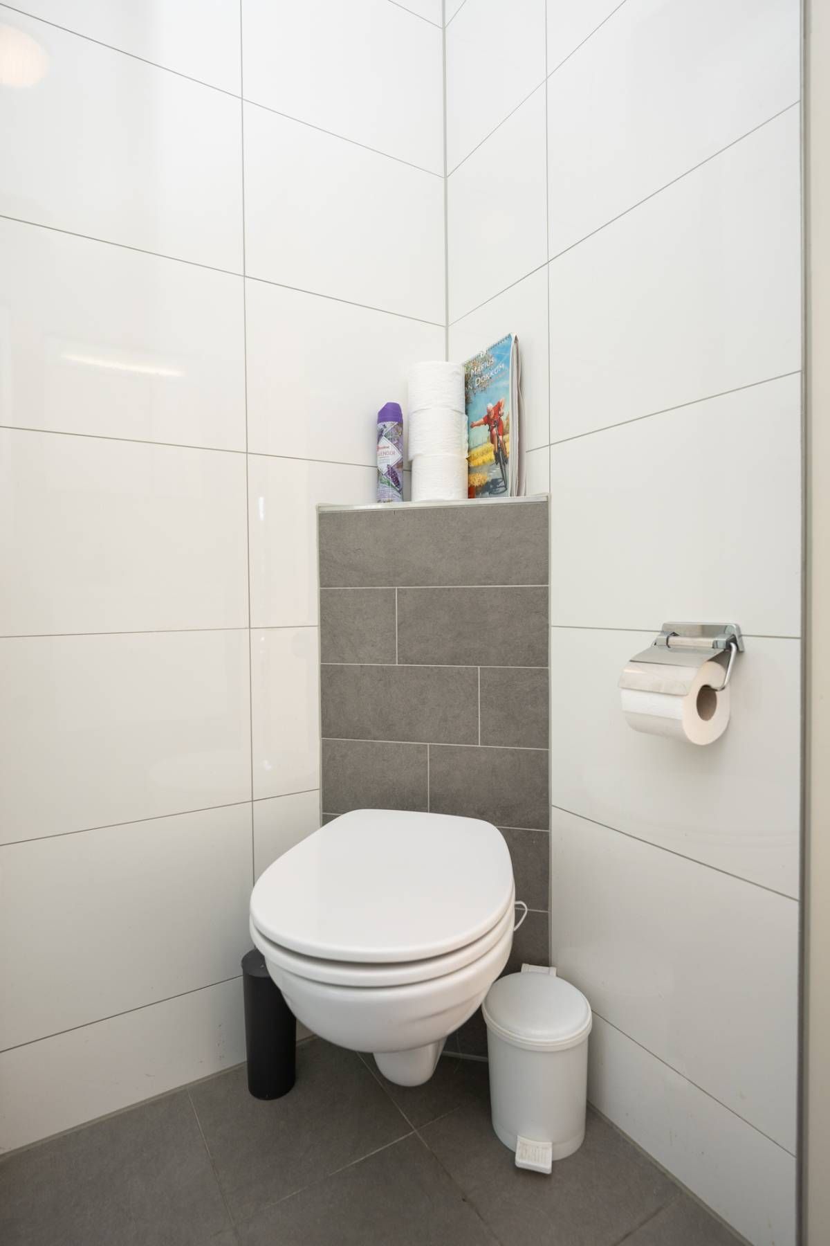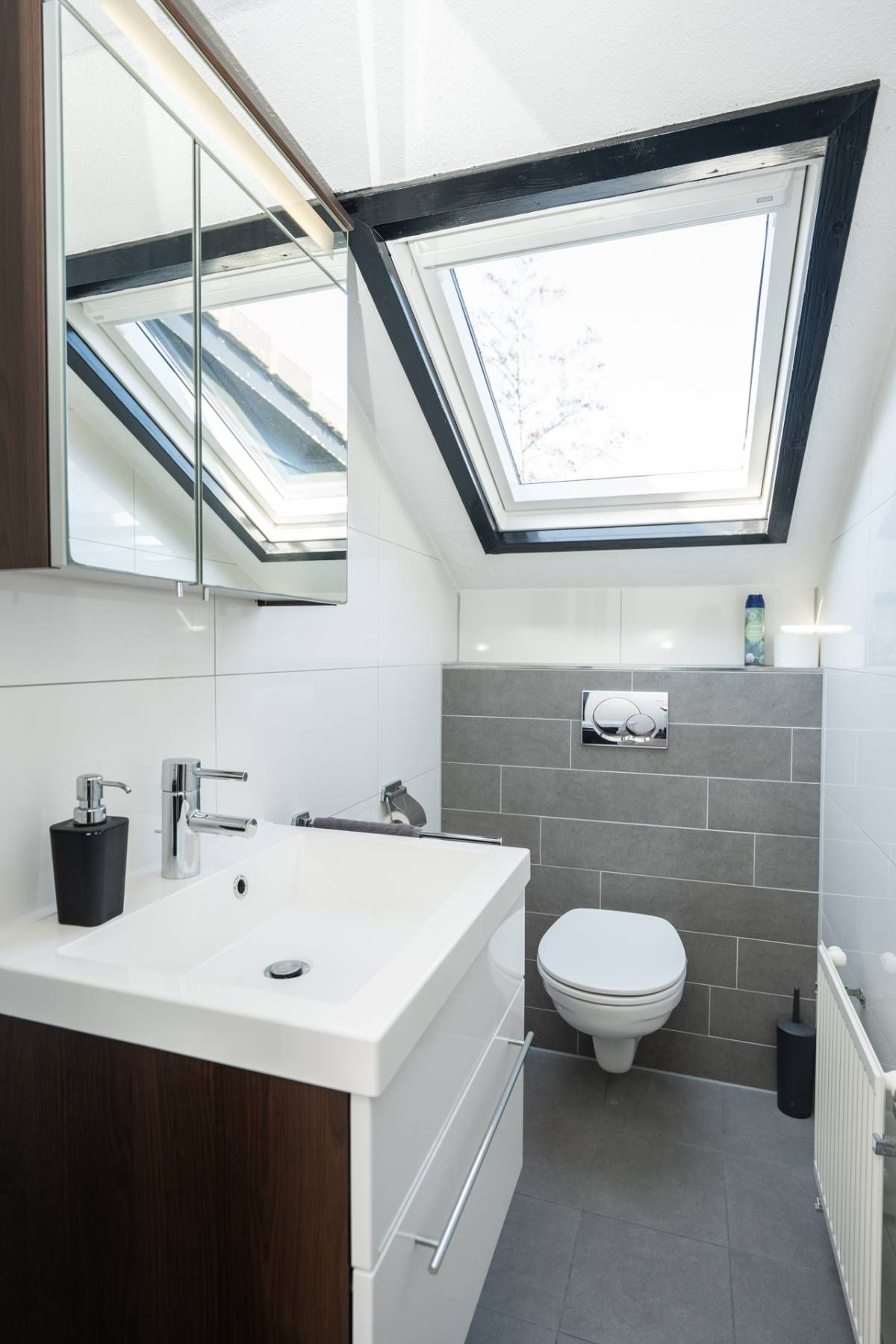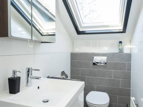 Op de verdieping bevindt zich nog een keurige toiletruimte met een wastafelmeubel en dakraam.