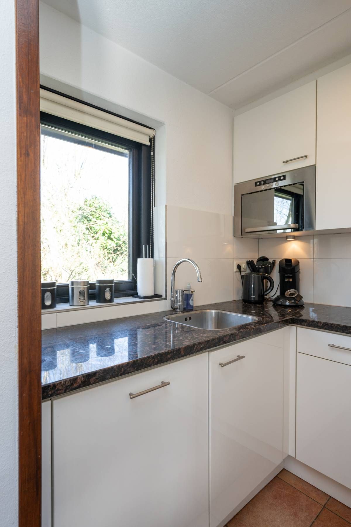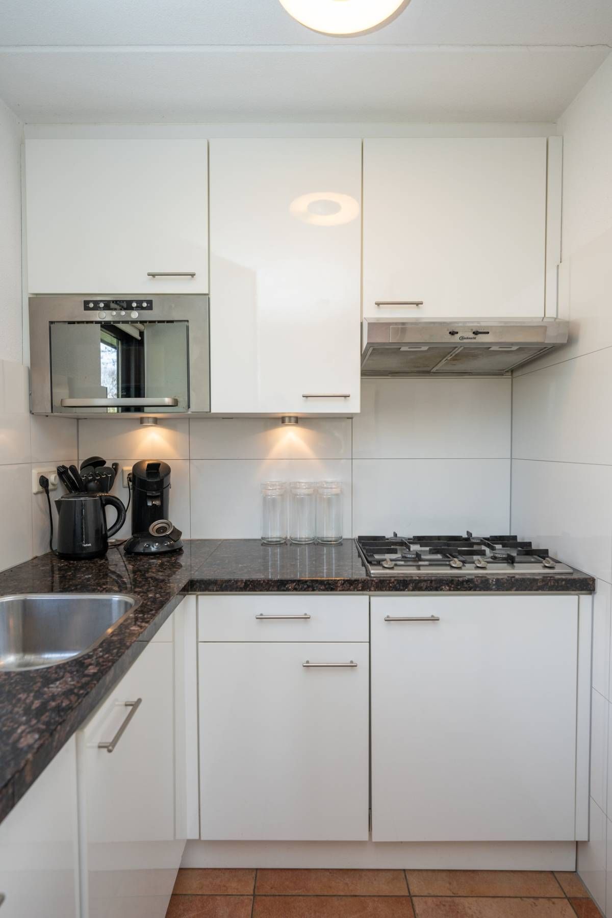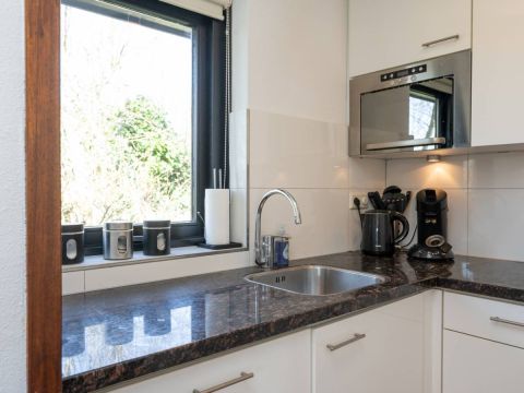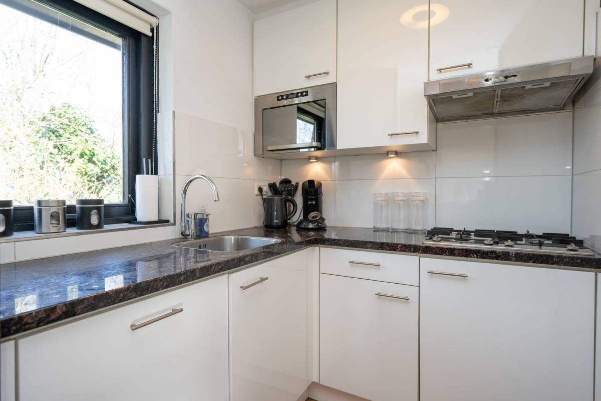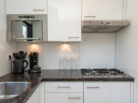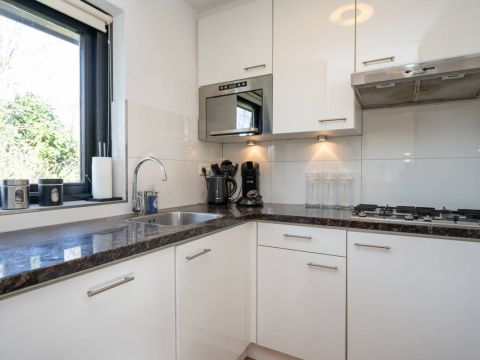 De keurige keuken is voorzien van inbouwapparatuur, waaronder een vaatwasmachine, koelkast, magnetron, gaskookplaat met afzuigkap en verder voldoende opbergruimte.