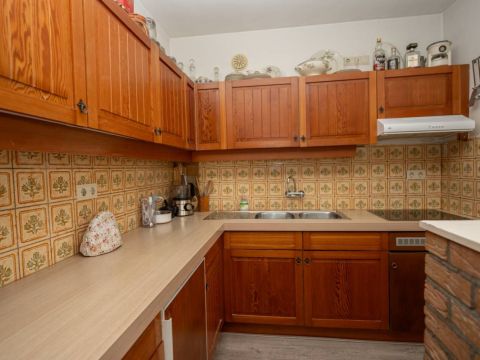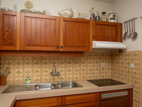 De hoekkeuken is praktisch ingedeeld en verkeert in een eenvoudige maar prima onder houden staat.