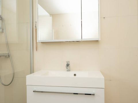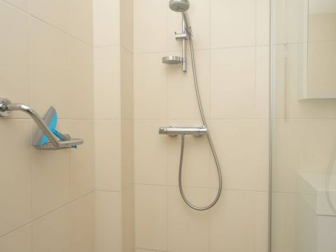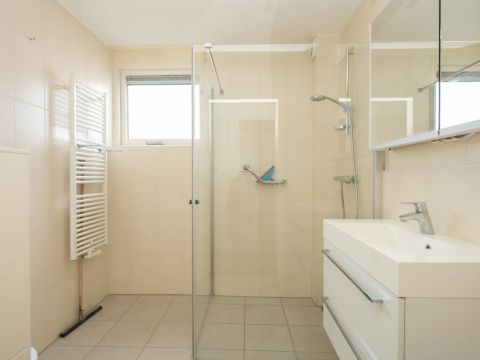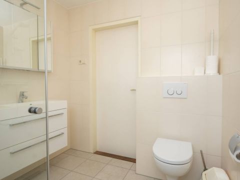 De badkamer is compleet uitgevoerd met een inloopdouche, toilet en een wastafelmeubel.