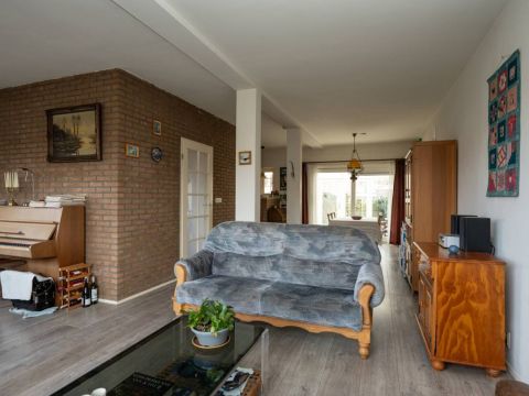 De lichte en fijne woonkamer vormt het hart van het huis. Dankzij de diverse raampartijen is er veel natuurlijk daglicht en heerst er een prettige, open sfeer.