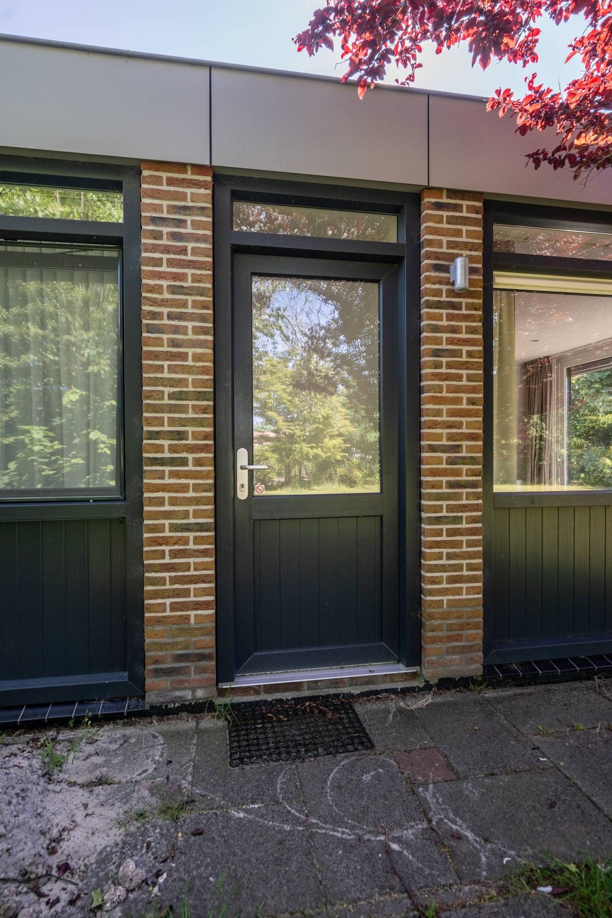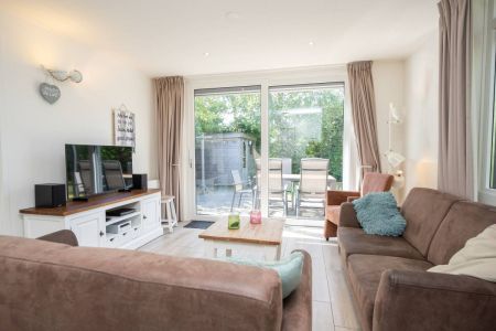 De knusse zithoek biedt uitzicht op de tuin en via de schuifpui heeft u direct toegang tot het terras en de riante, groene tuin. De drempelvrije vloer met onderhoudsvriendelijke plavuizen geeft het geheel een strakke en praktische afwerking.