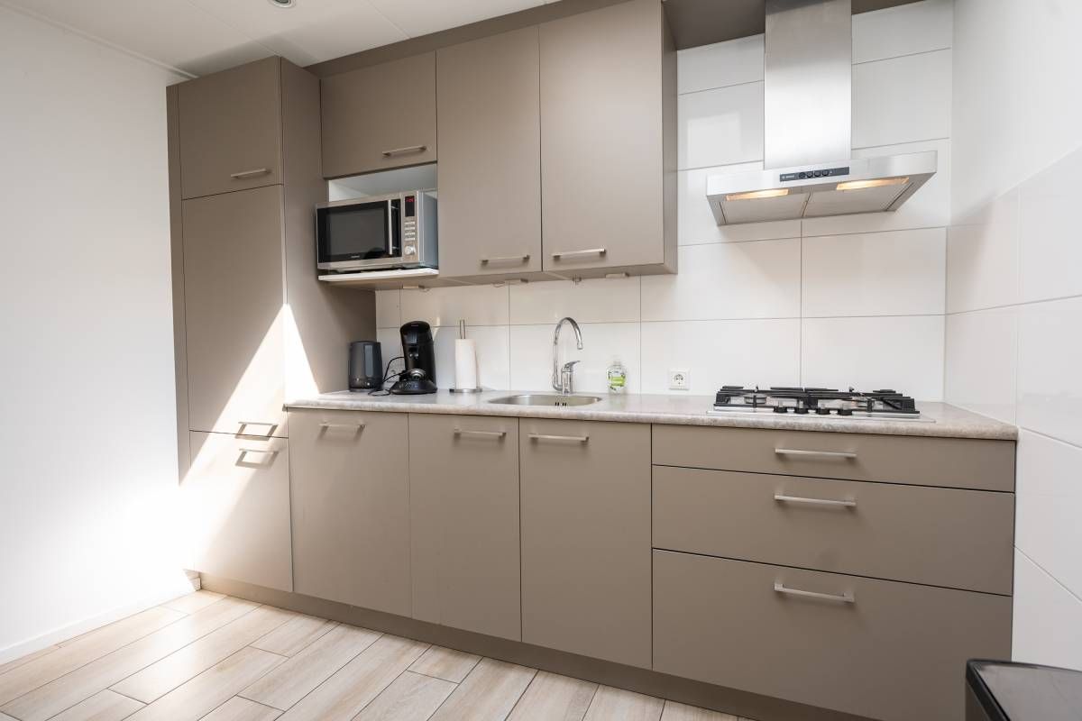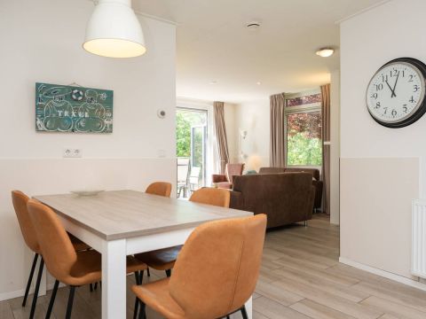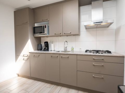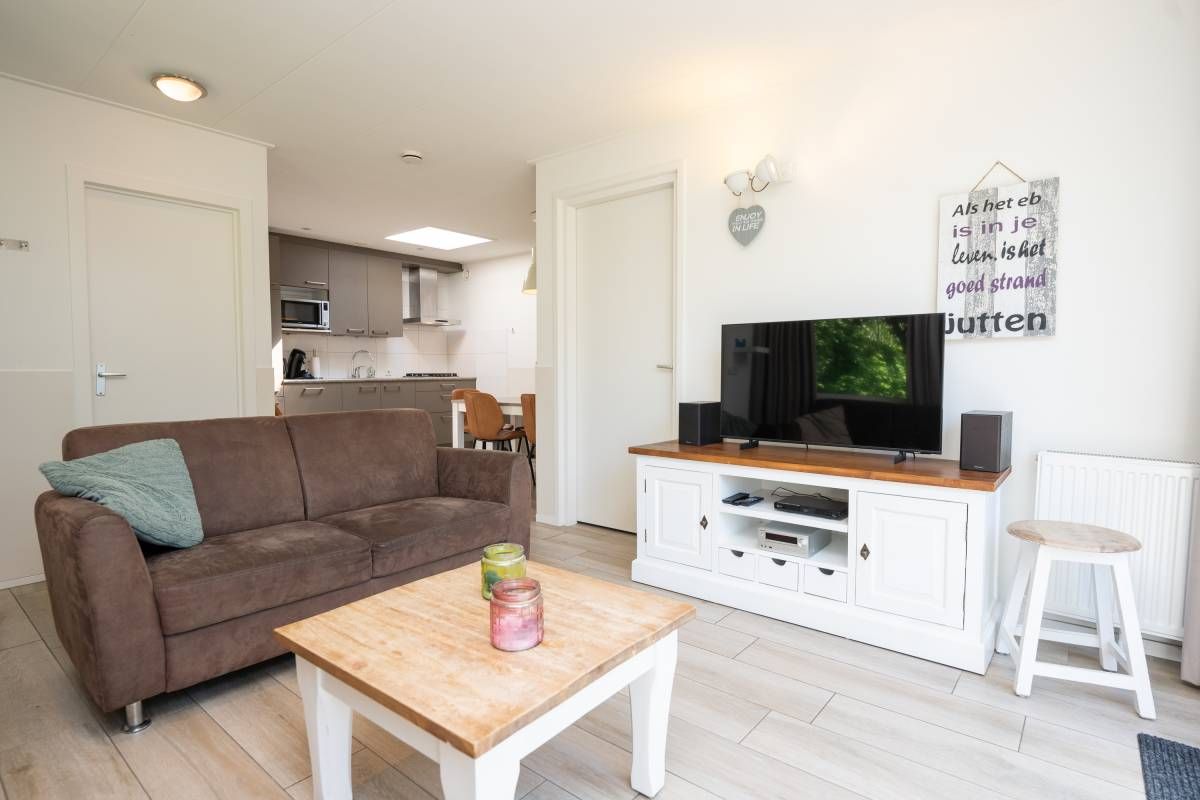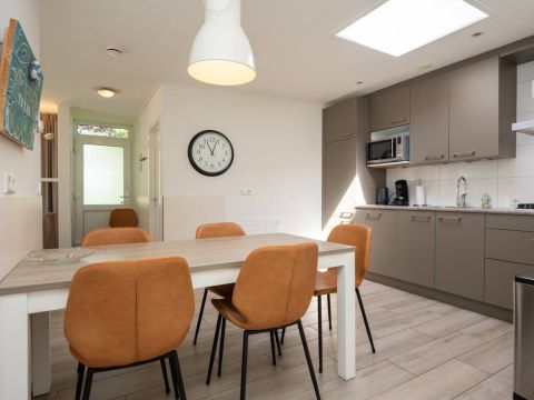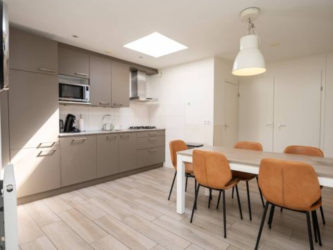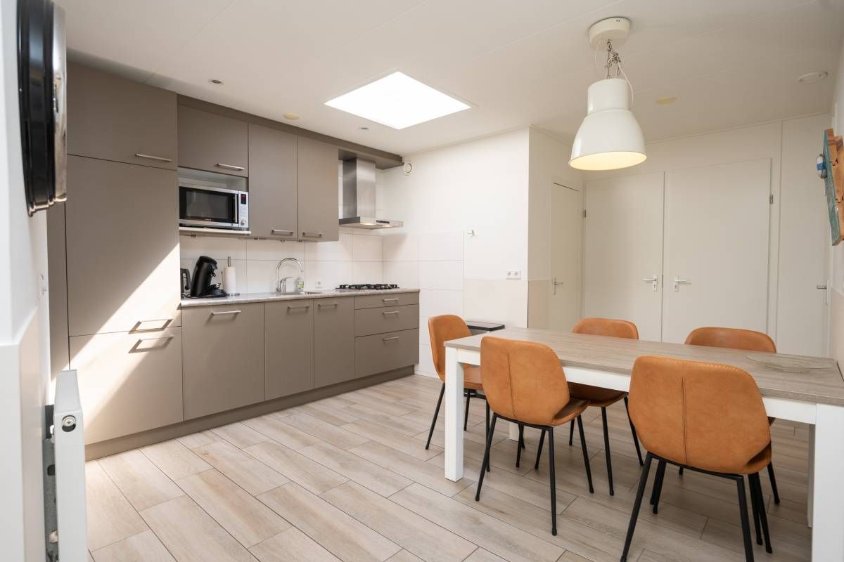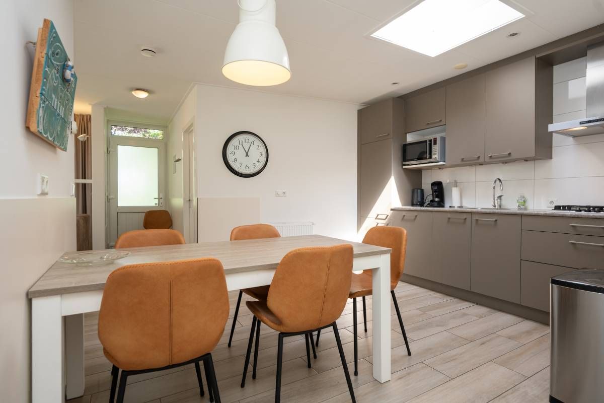De open keuken vormt een echte eyecatcher. De lichtkoepel zorgt voor extra daglicht en versterkt het ruimtelijke gevoel. De keuken is compleet uitgerust met onder andere een gaskookplaat, koelkast en vaatwasser, en biedt alles wat u nodig heeft voor een comfortabel verblijf.