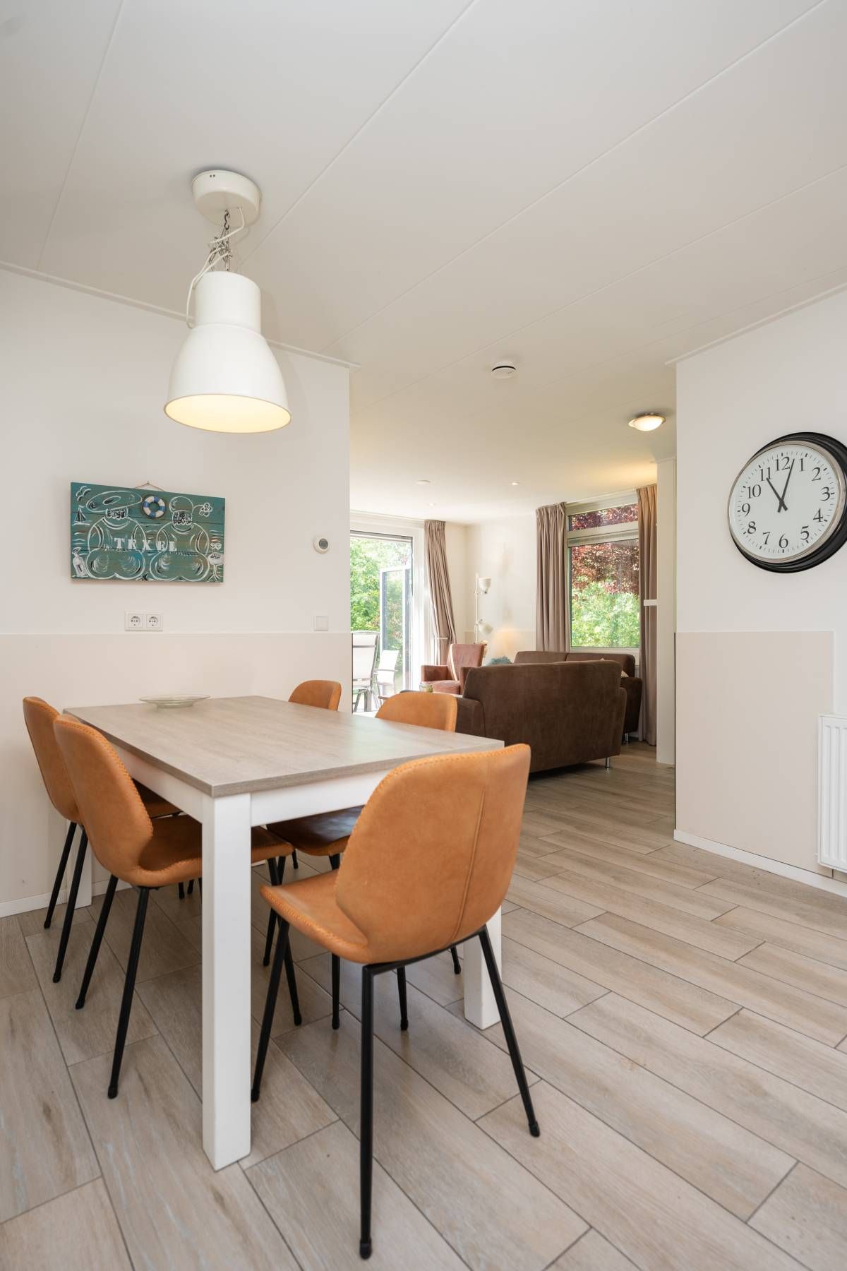 Als je de woonkamer binnenstapt voel je je direct ‘thuis’. Dankzij de grote raampartijen geniet u hier van een prachtige lichtinval. De warme natuurtinten in het interieur zorgen voor een harmonieuze en ontspannen uitstraling.