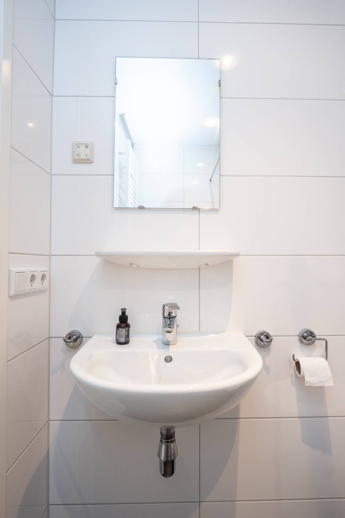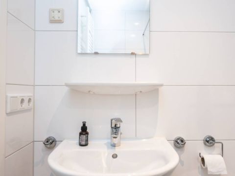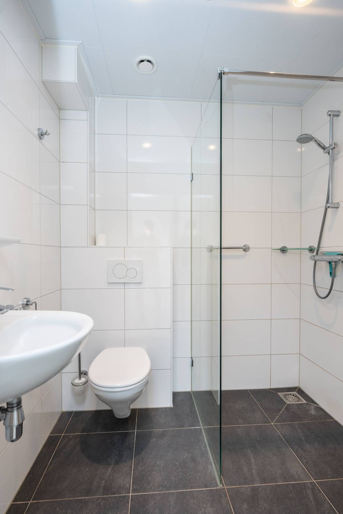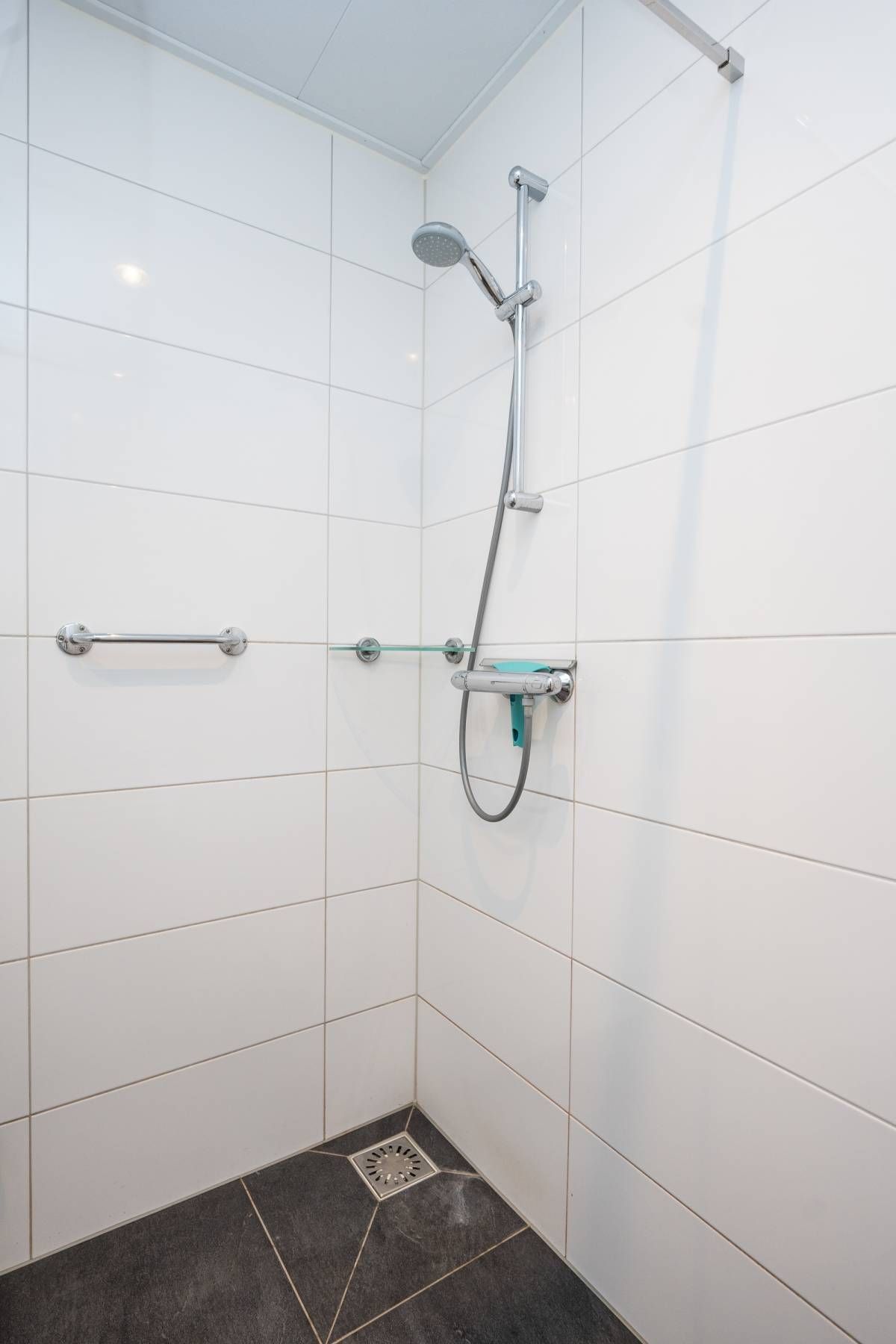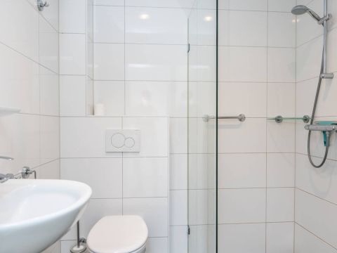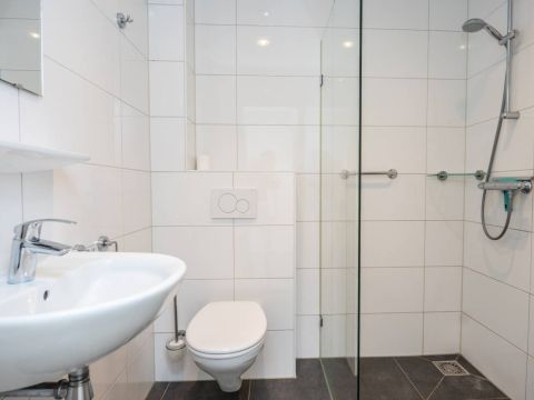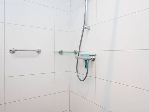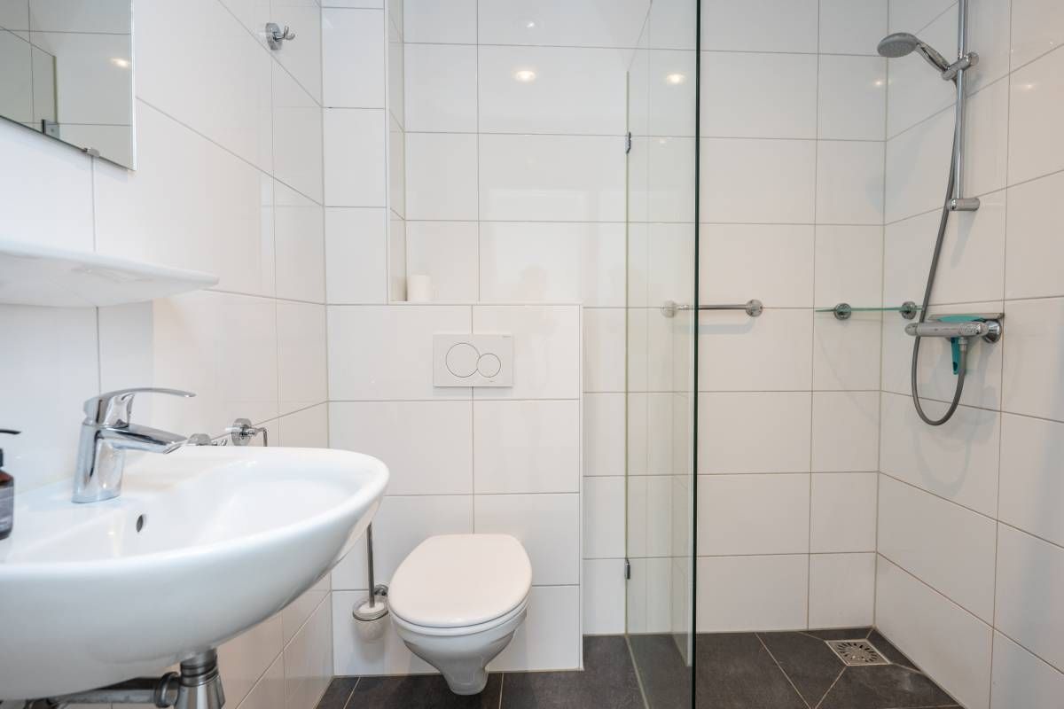 De moderne badkamer is netjes afgewerkt en functioneel ingericht met een inloopdouche, wastafel en toilet. Dankzij de aanwezige wandbeugels is de woning tevens geschikt voor mindervaliden.
