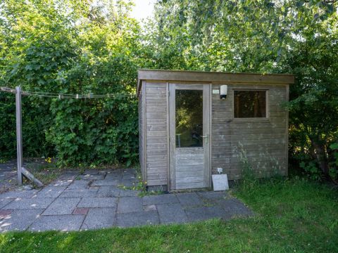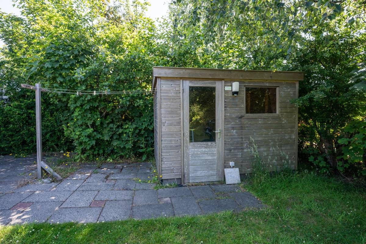 In de tuin bevindt zich bovendien een vrijstaand houten tuinhuis, ideaal voor het opbergen van bijvoorbeeld tuinmeubilair en fietsen.
