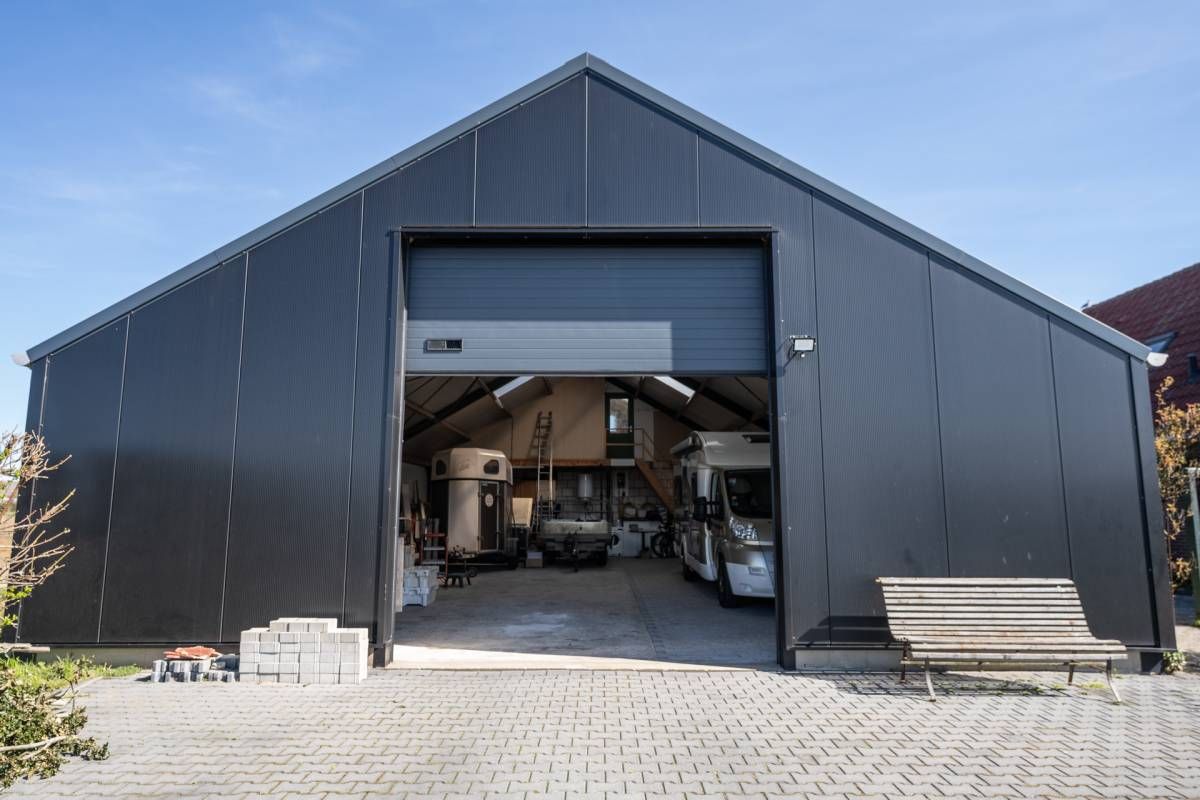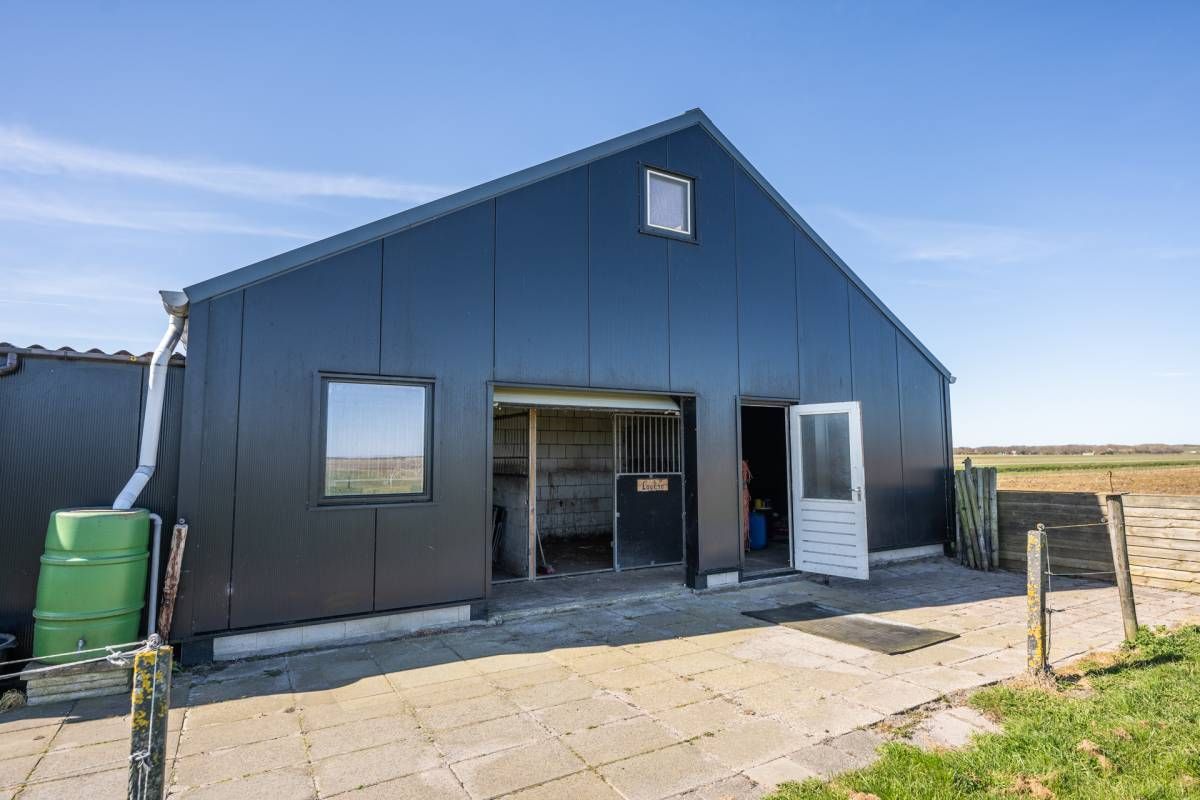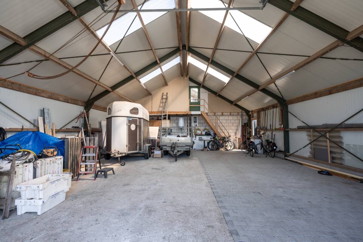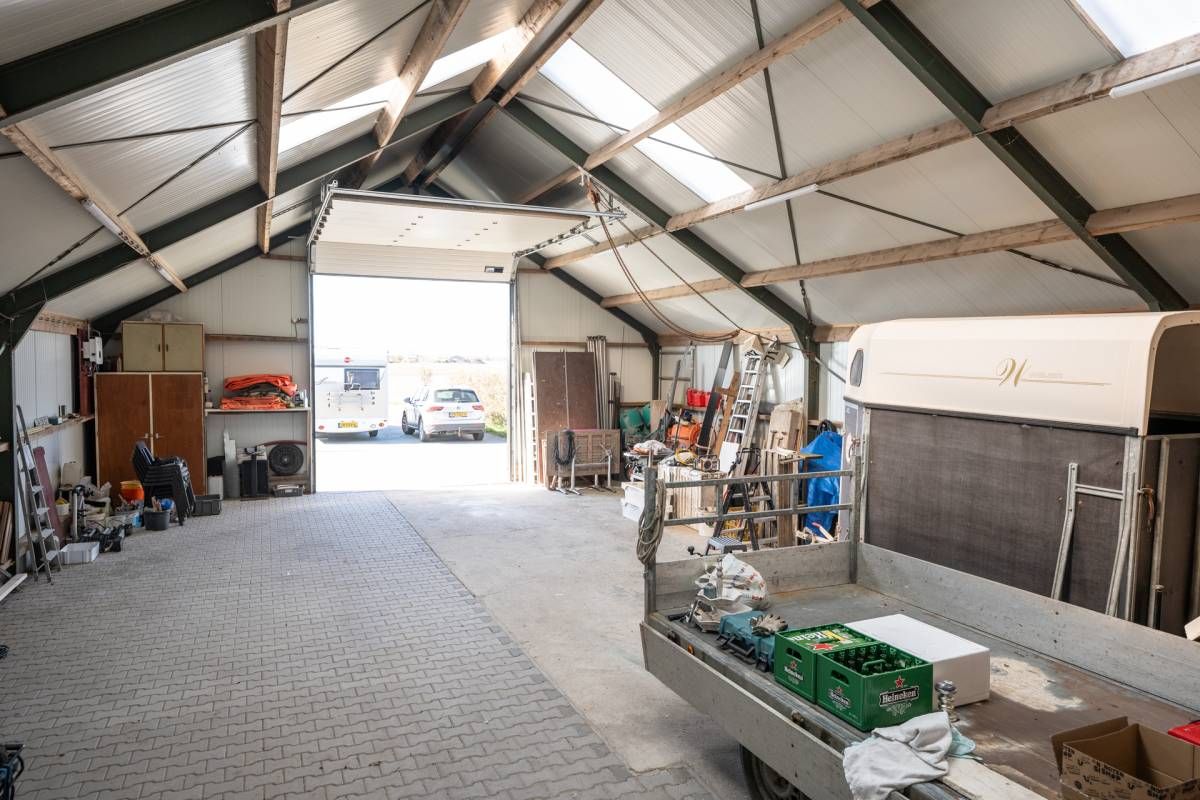 De grote loods van circa 200 m² beschikt over een kantoorruimte en een slaapzolder. Aan de loods grenzen 3 paardenboxen en een overkapping. Voor de loods is volop parkeergelegenheid.