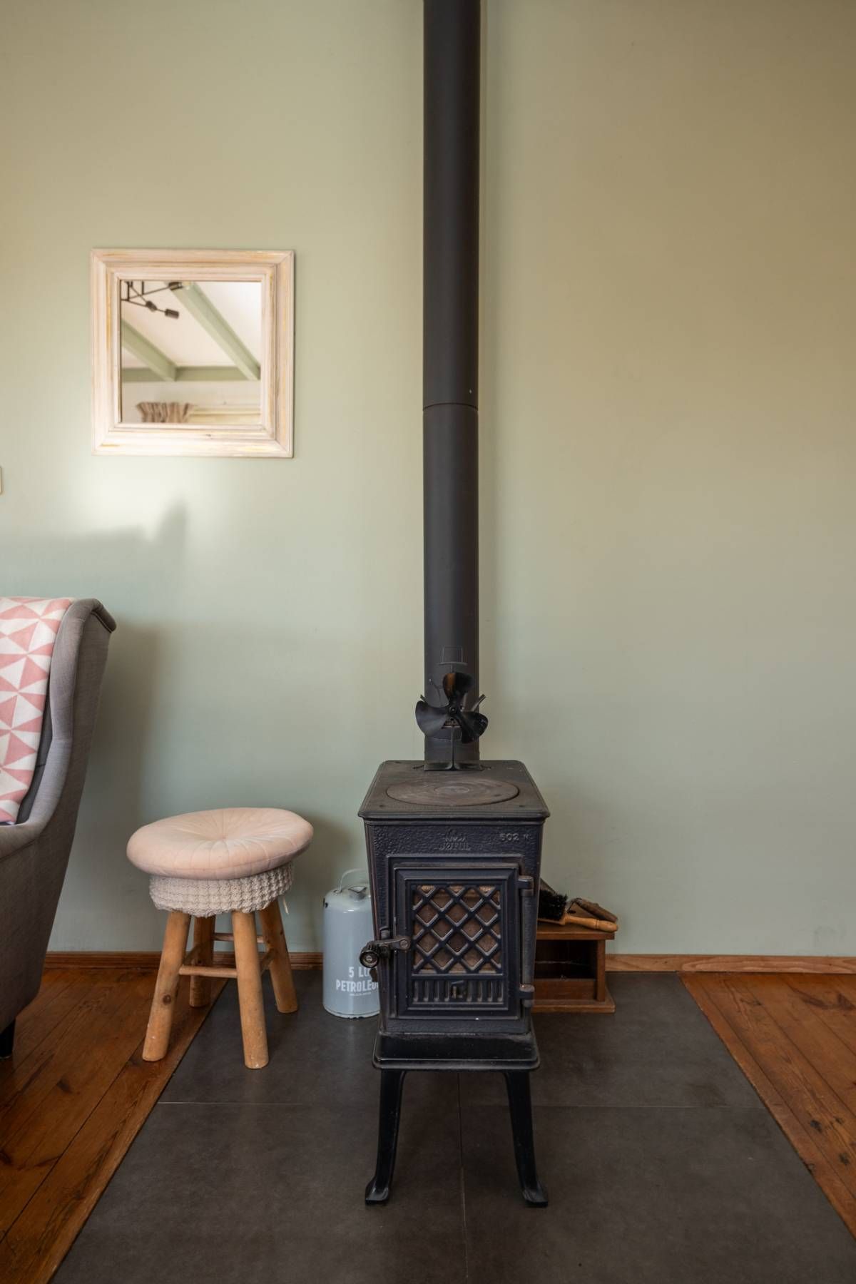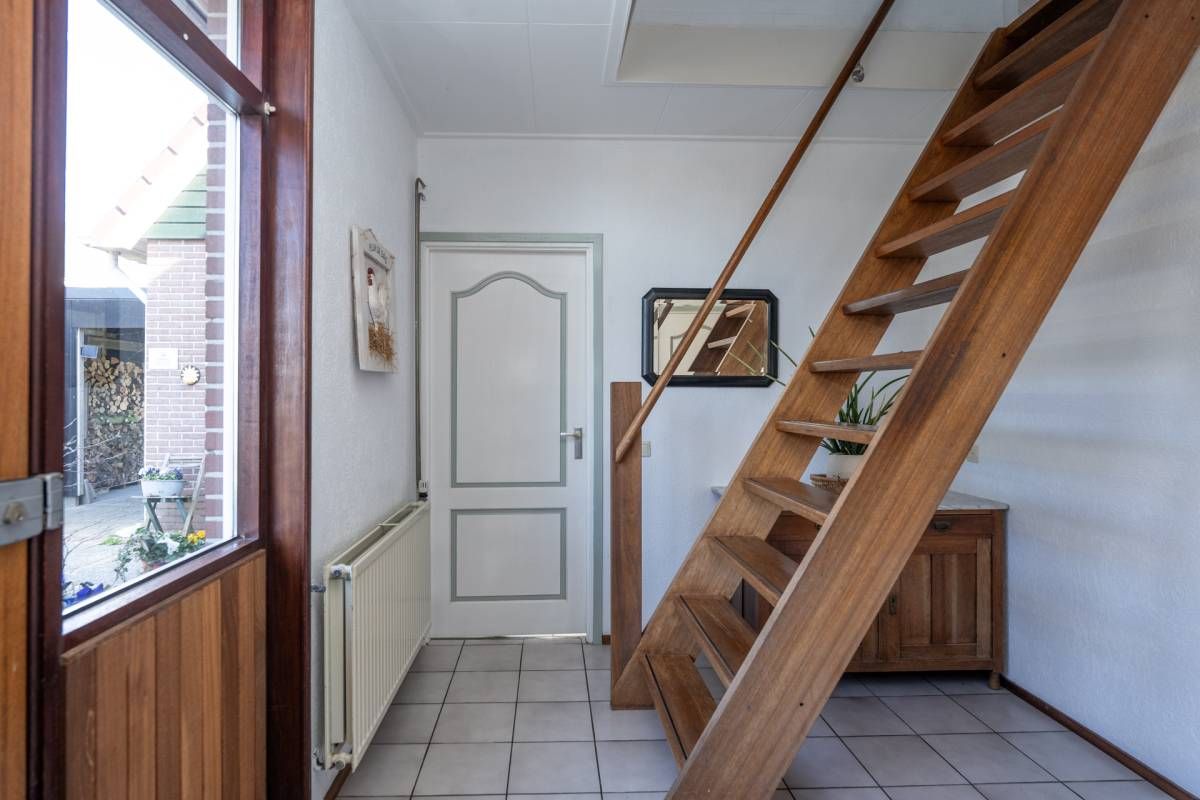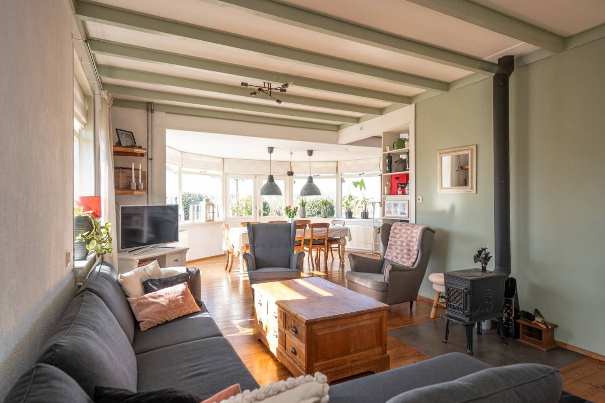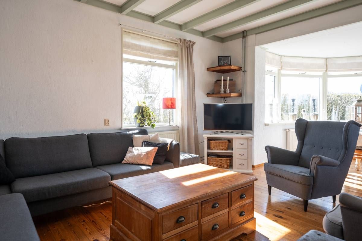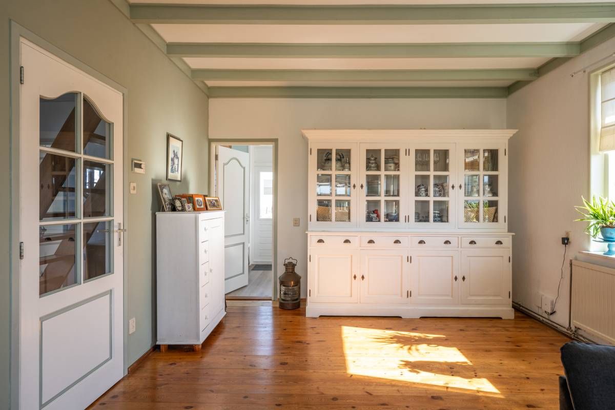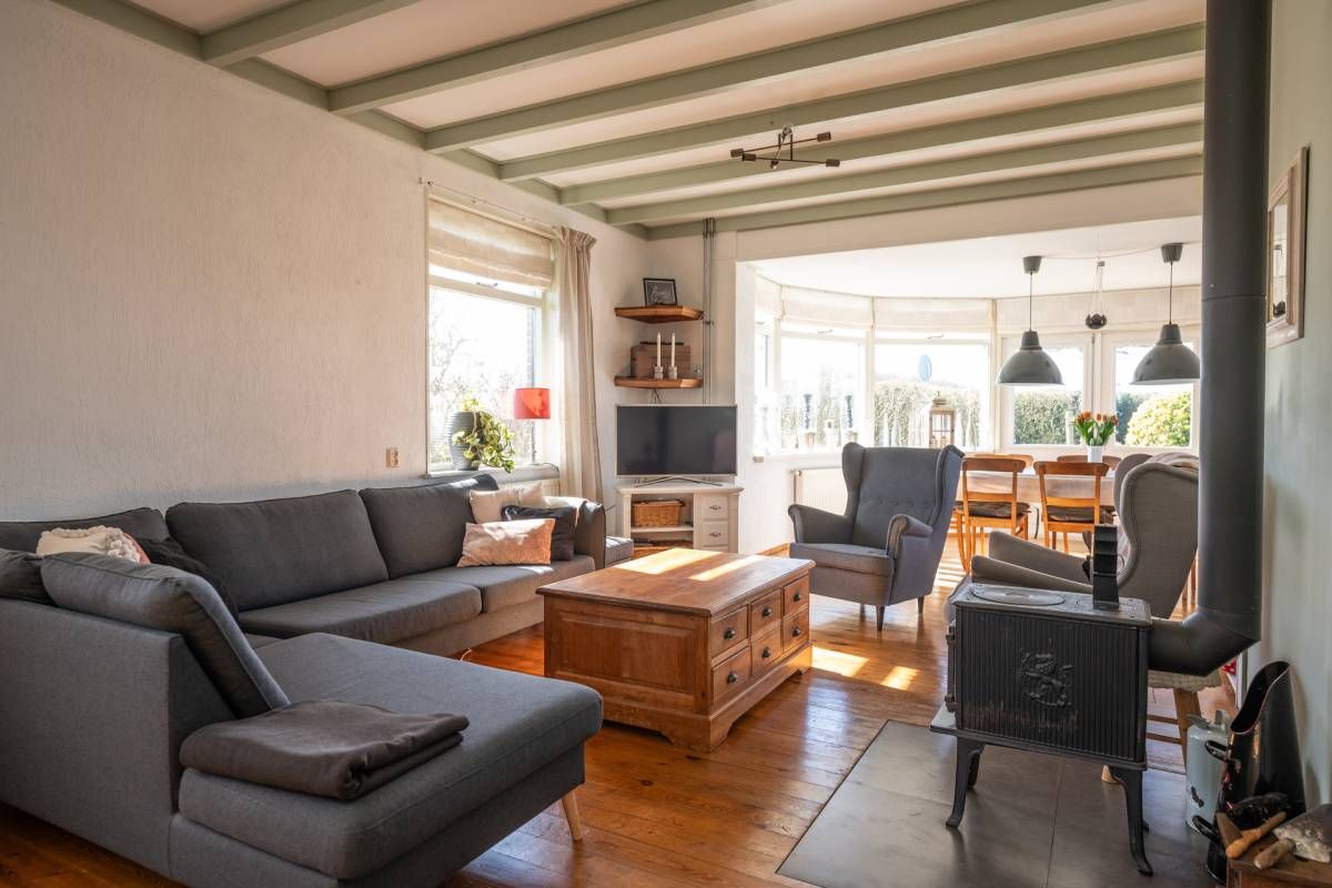 Bij binnenkomst kom je in de ruime hal met toilet, die toegang geeft tot zowel de sfeervolle woonkamer als de praktische bijkeuken. De woonkamer is warm en stijlvol ingericht en voorzien van een houtkachel, perfect voor gezellige avonden. De erker aan de voorzijde zorgt voor veel licht en een prachtig uitzicht over de landerijen.