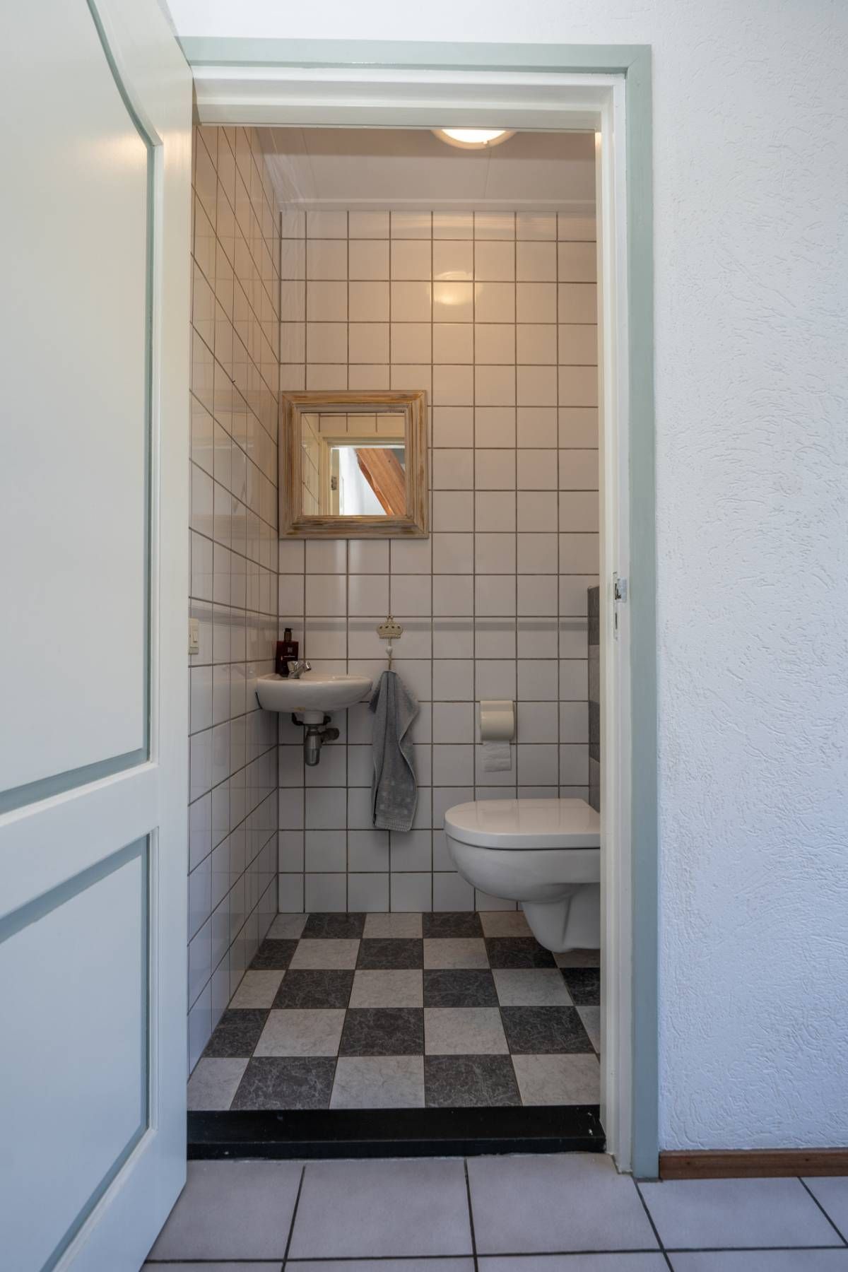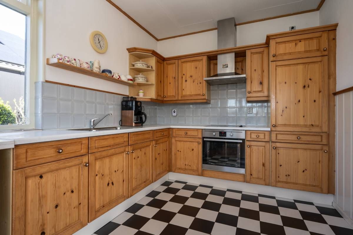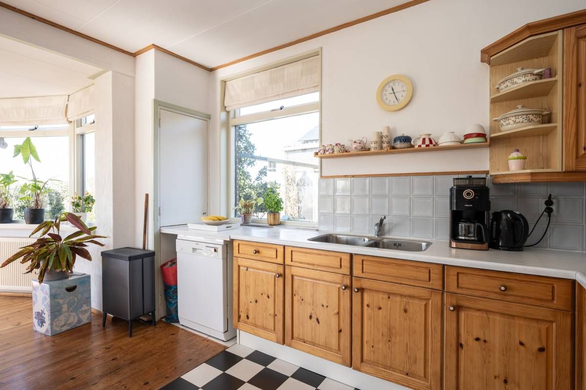 De landelijke keuken is compleet uitgerust met onder andere een inductiekookplaat, oven, dubbele spoelbak en vaatwasseraansluiting. De karakteristieke zwart-witte vloer geeft de ruimte extra sfeer.