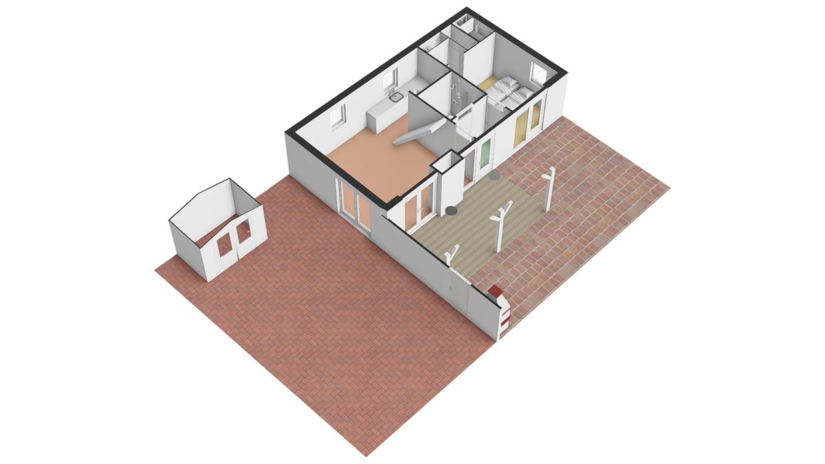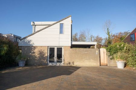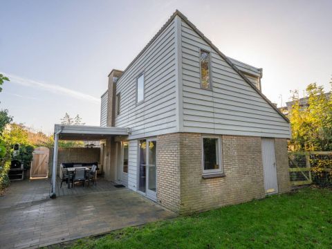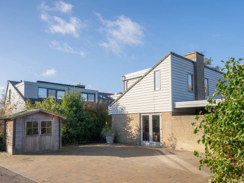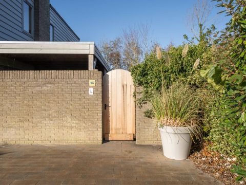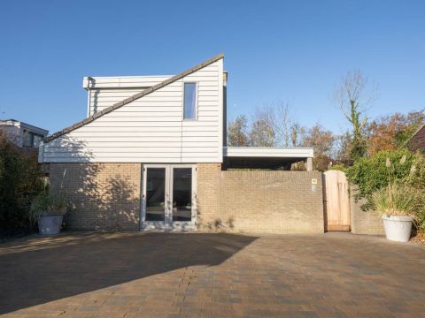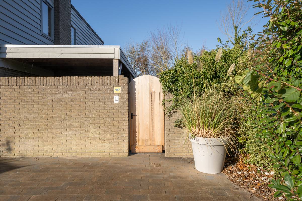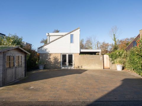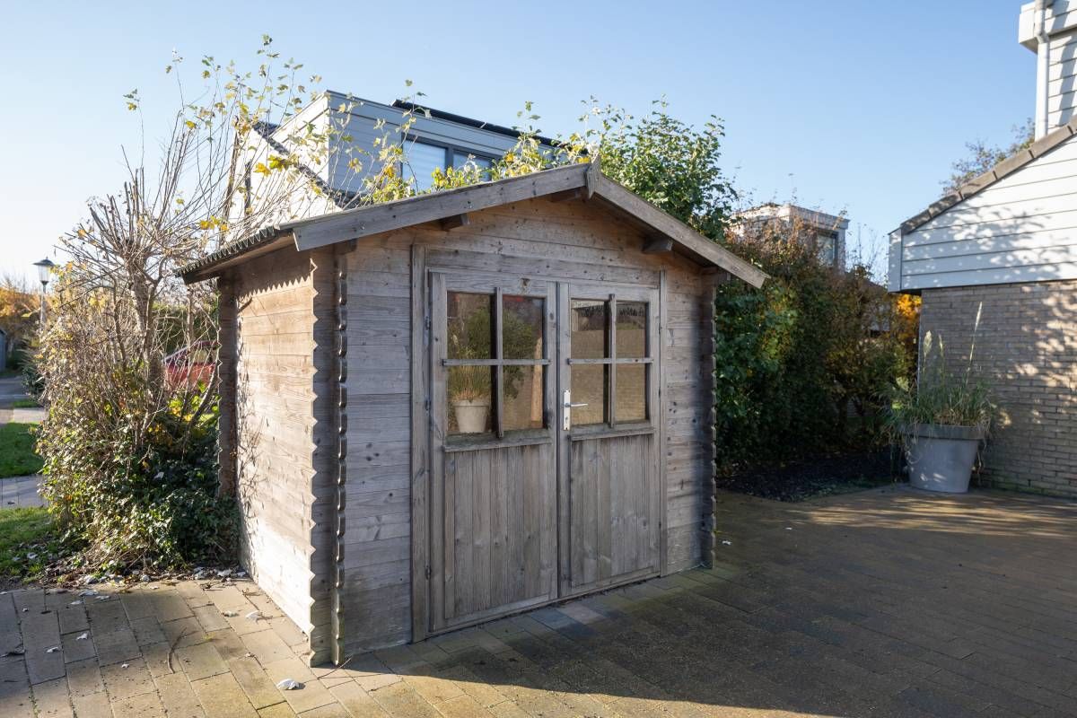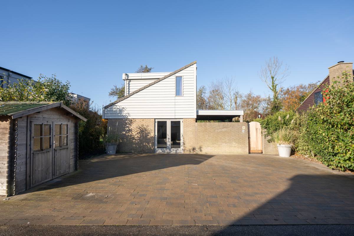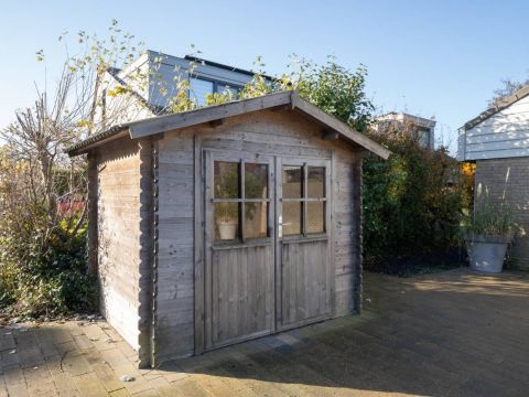 Aan de voorzijde van de woning vindt u een strak bestraat erf met meer dan voldoende parkeerruimte voor meerdere auto’s. Daarnaast staat er een houten berging: ideaal voor fietsen, strandspullen of tuinmeubilair.