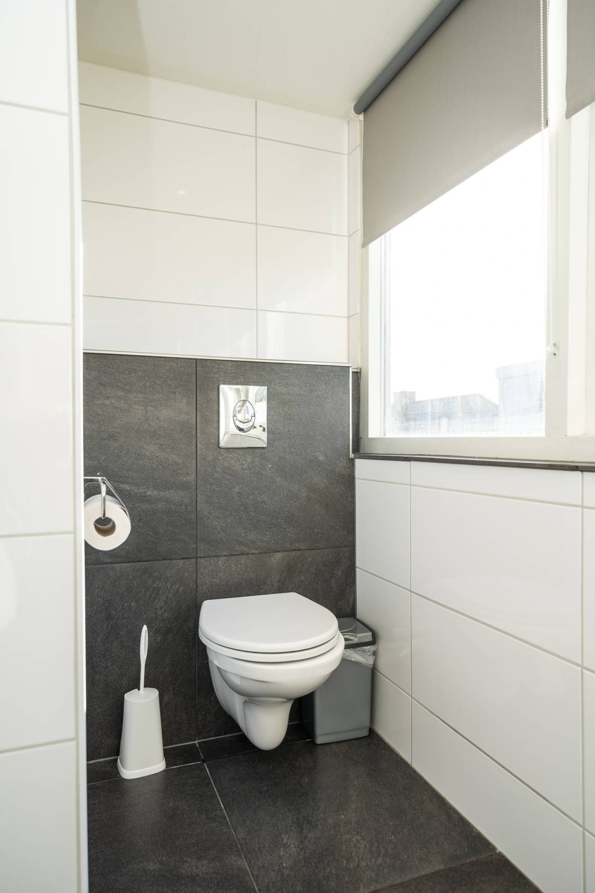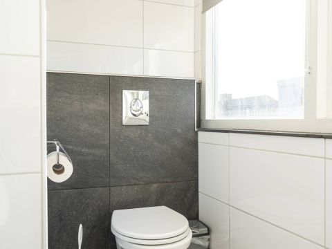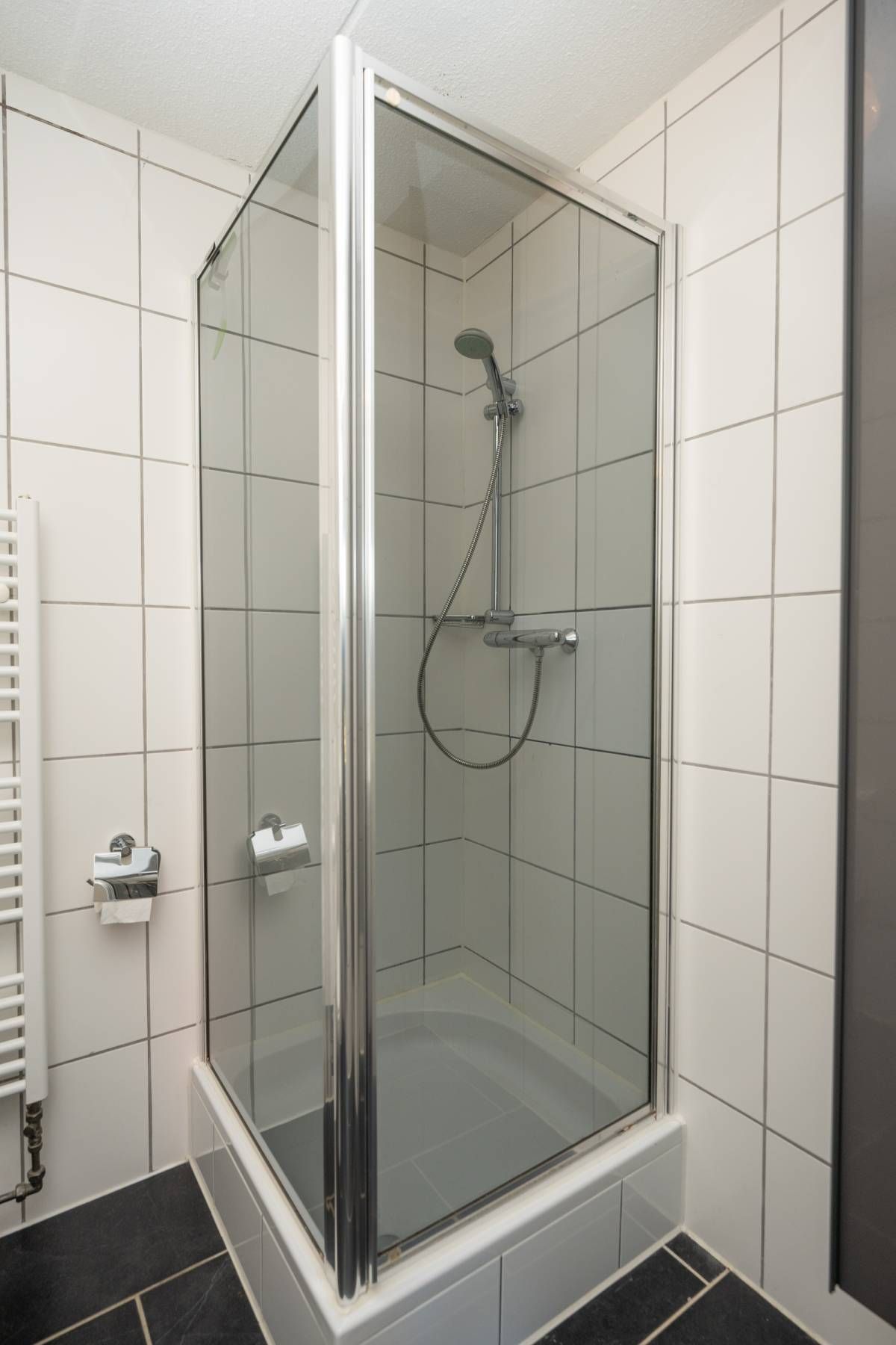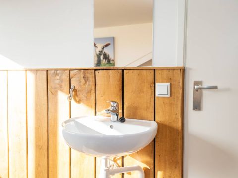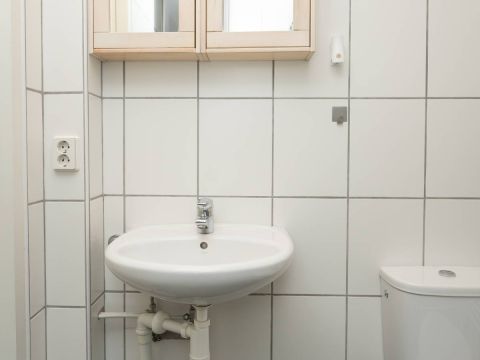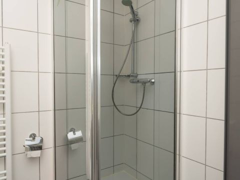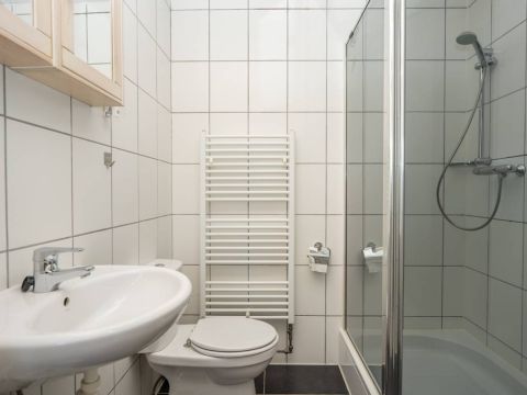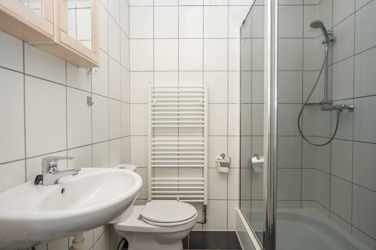 De badkamer is voorzien van een douche, wastafel en toilet. Praktisch en verzorgd.