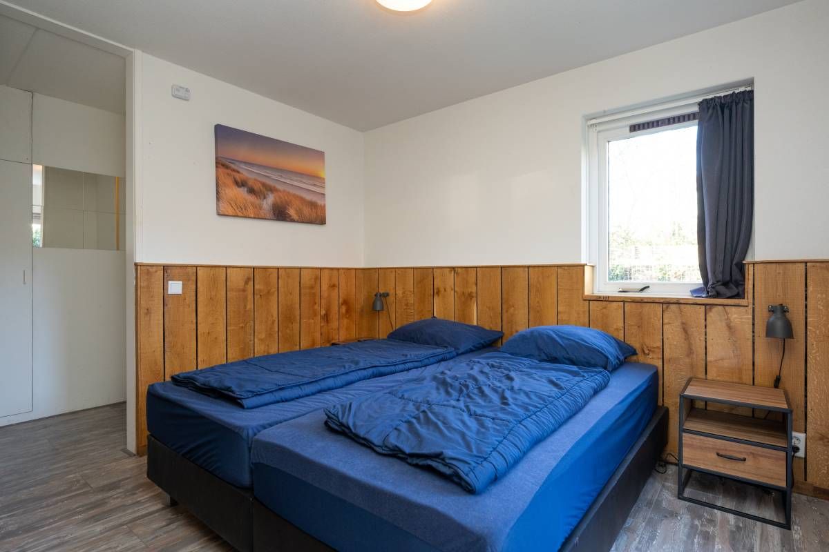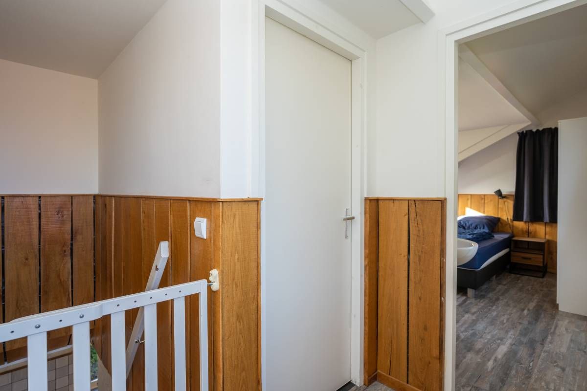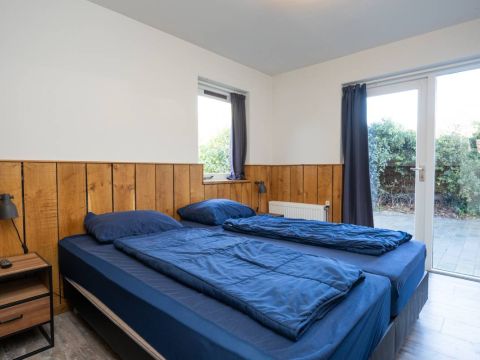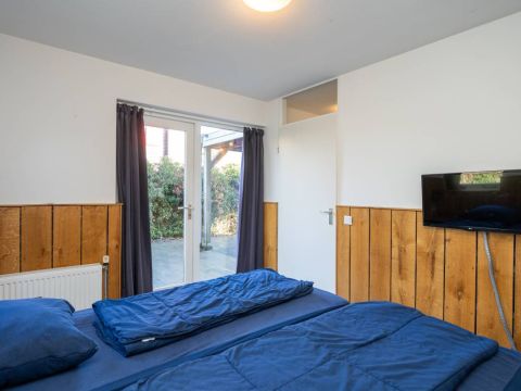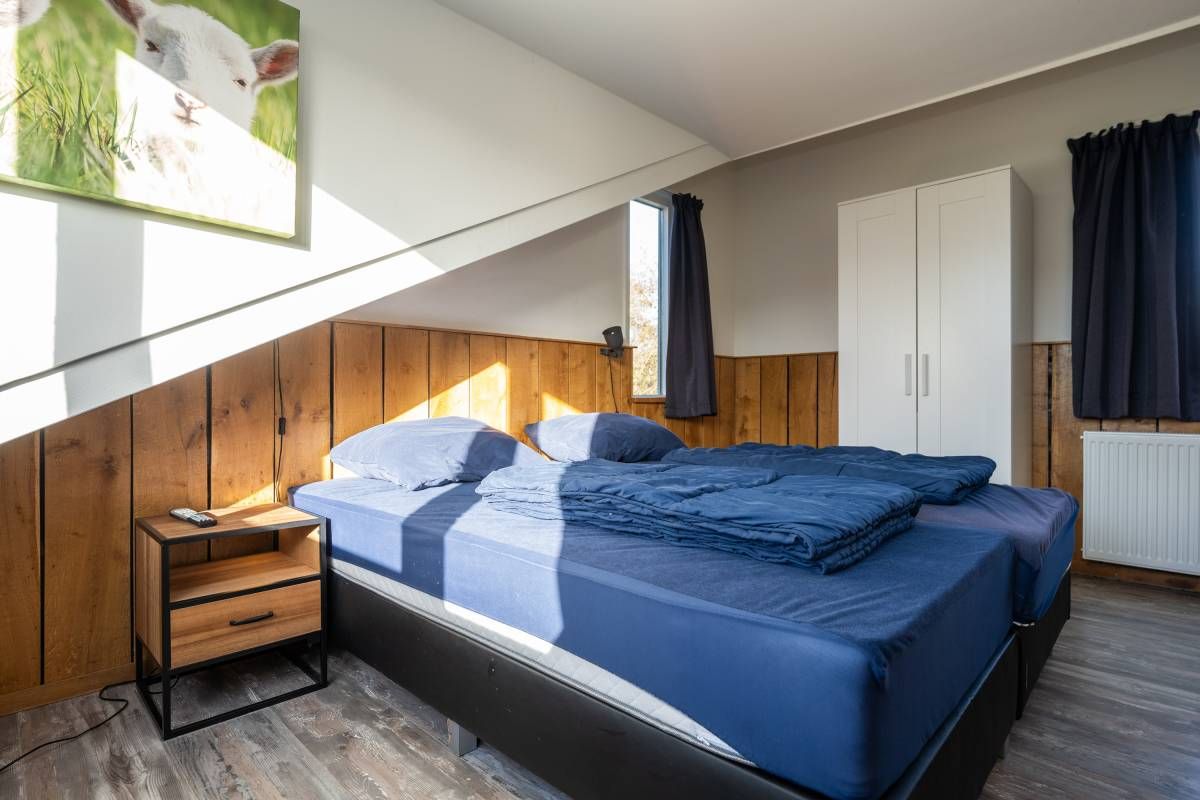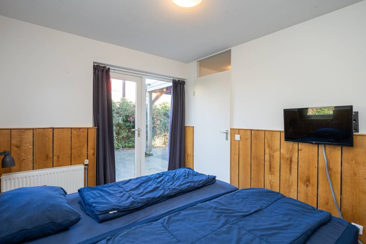 Op de begane grond bevindt zich een ruime slaapkamer met directe toegang tot het terras. De openslaande deuren maken het extra bijzonder: wakker worden, gordijnen open en zo de buitenlucht in stappen.