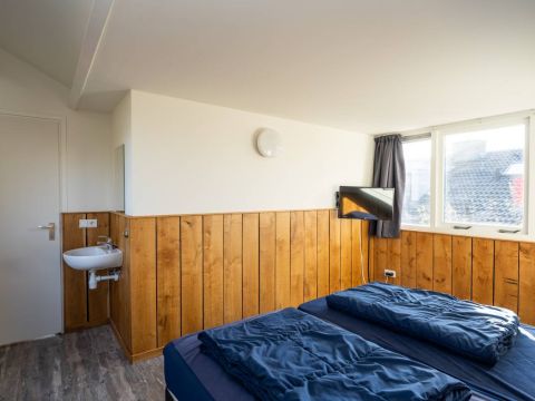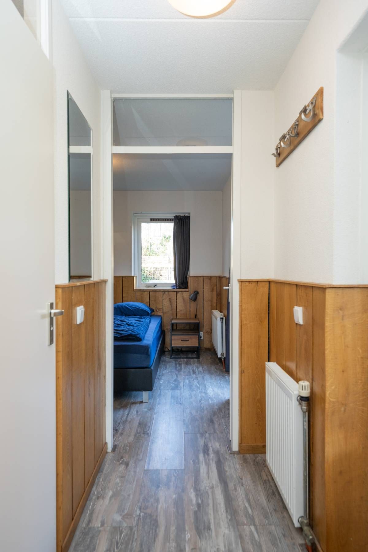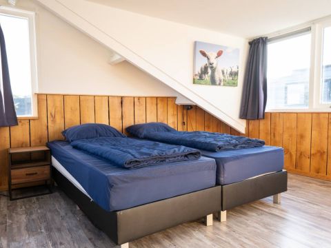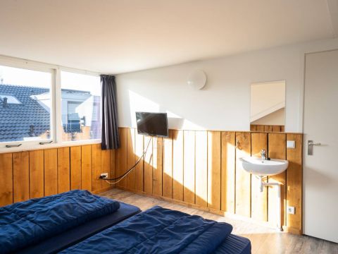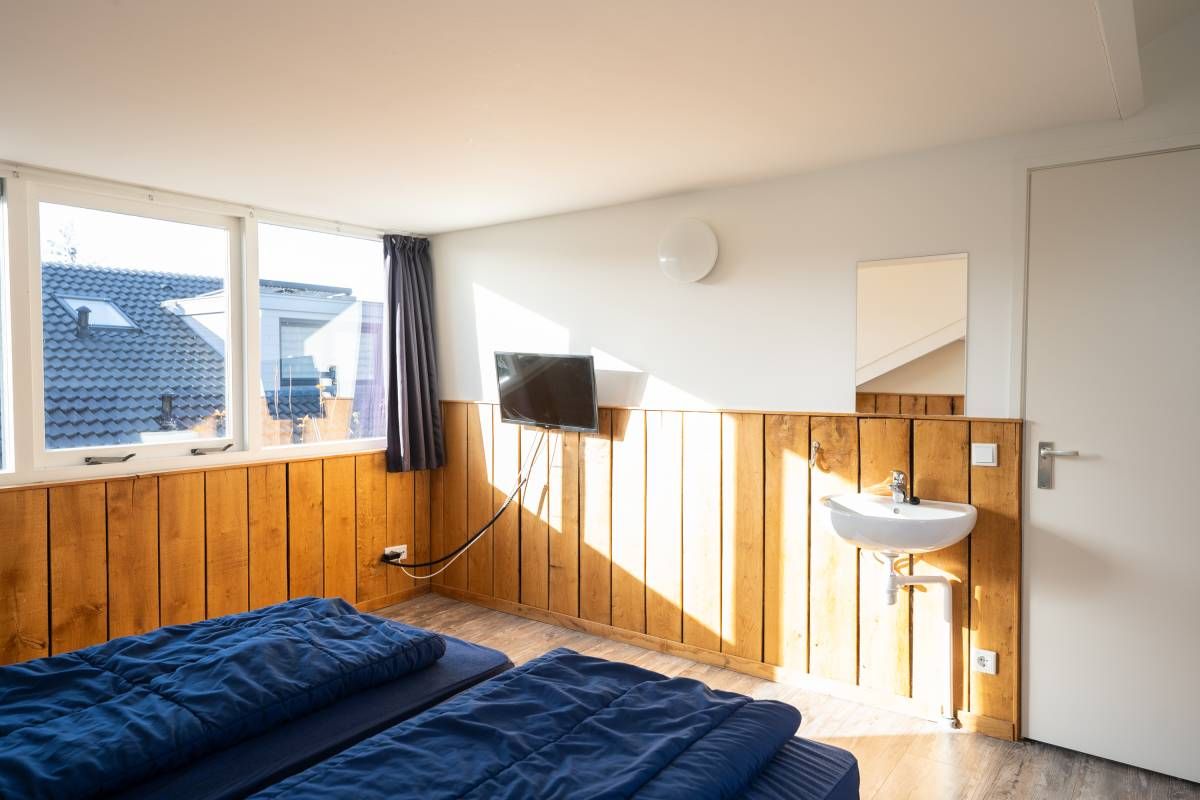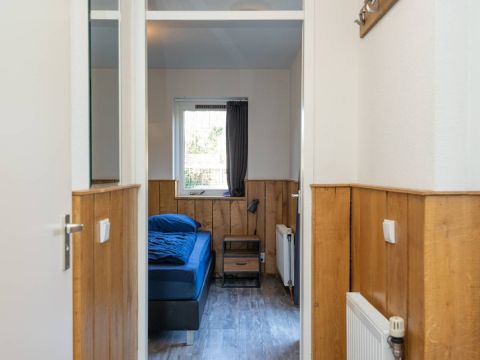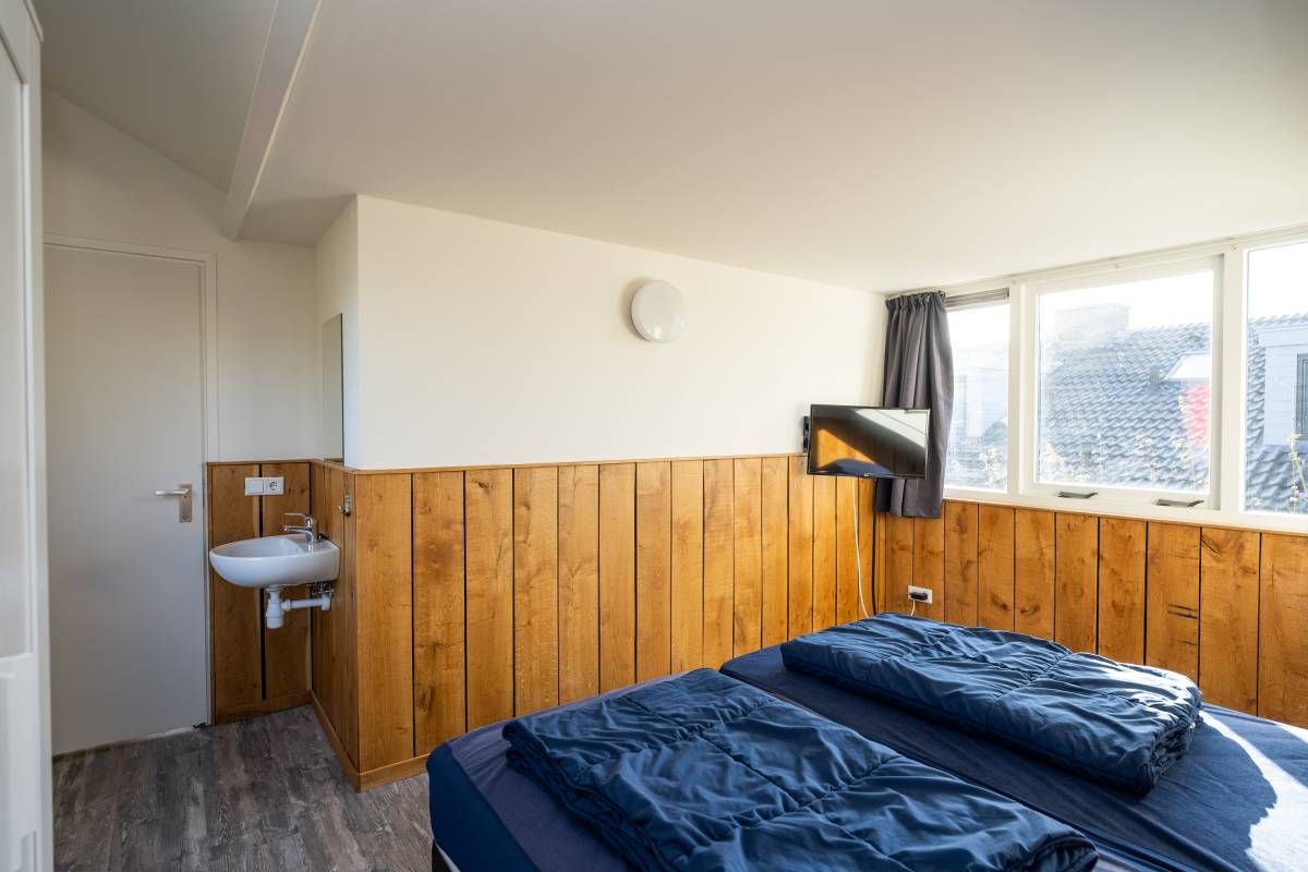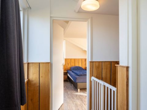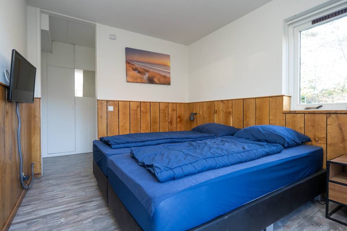 Op de begane grond bevindt zich een ruime slaapkamer met directe toegang tot het terras. De openslaande deuren maken het extra bijzonder: wakker worden, gordijnen open en zo de buitenlucht in stappen.