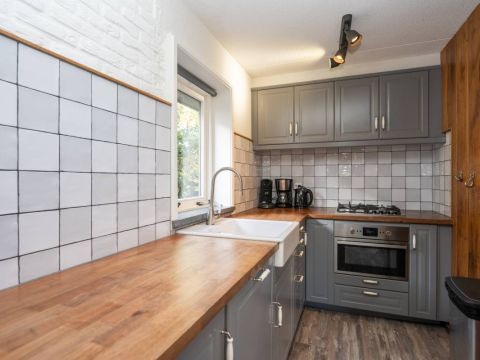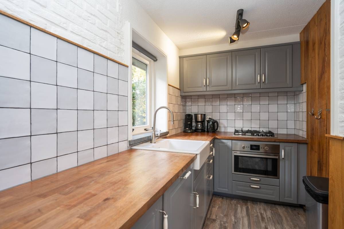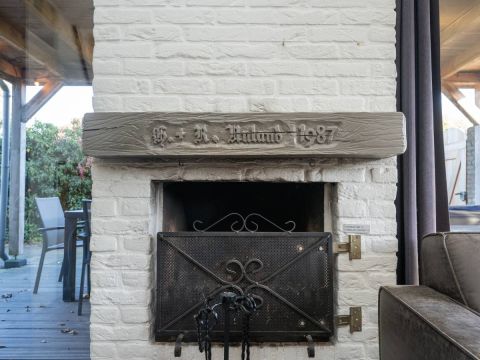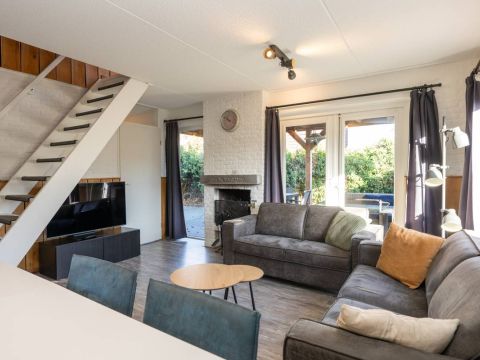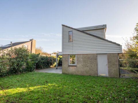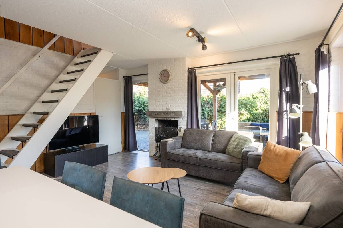 Binnen ervaart u een warme, rustgevende sfeer. De woonkamer voorzien van open haard is licht dankzij de grote raampartijen die uitkijken op de tuin en het overdekte terras.