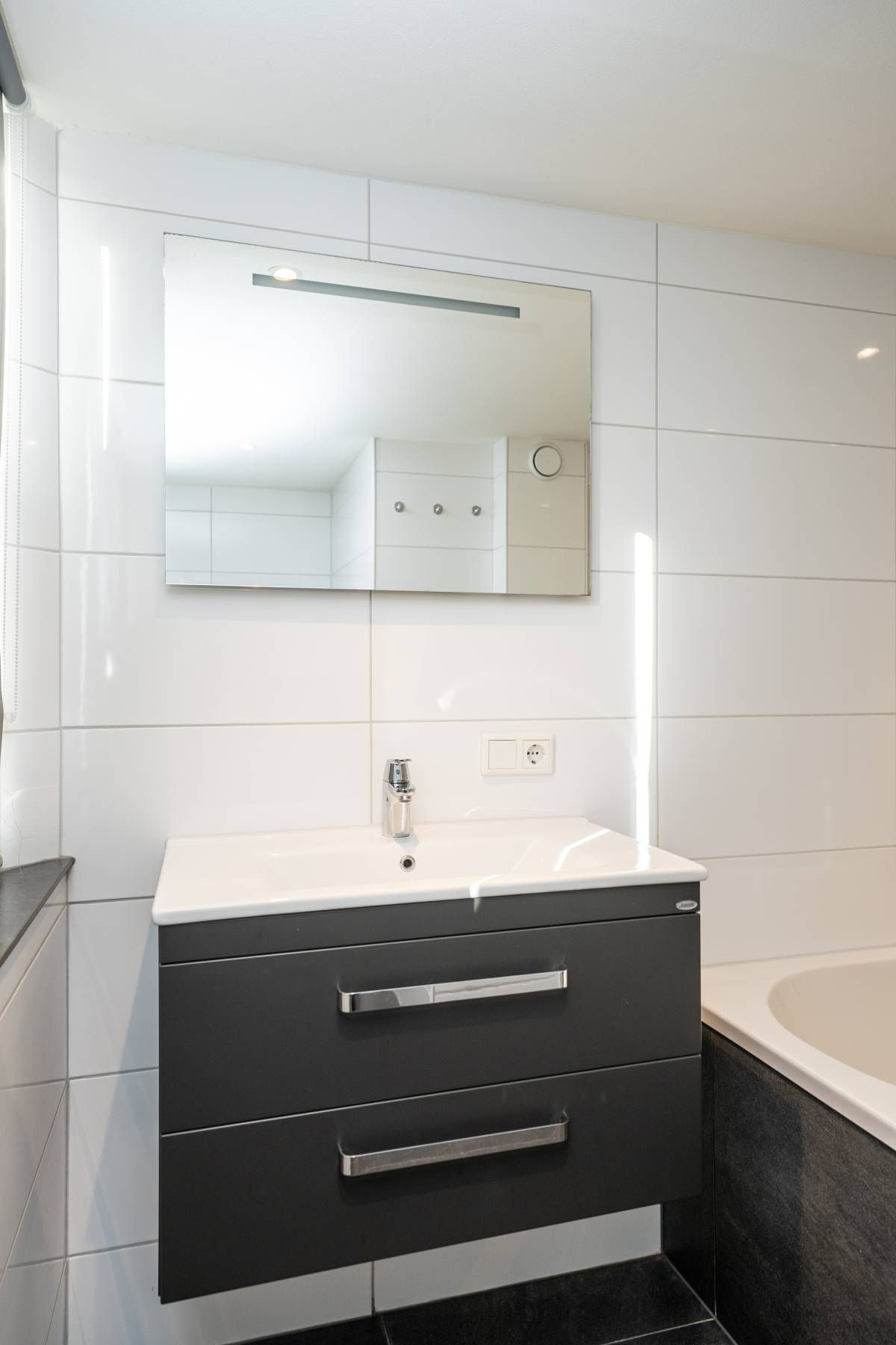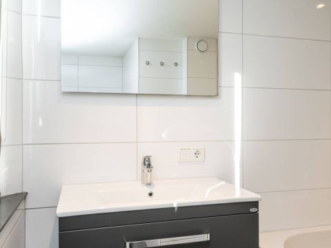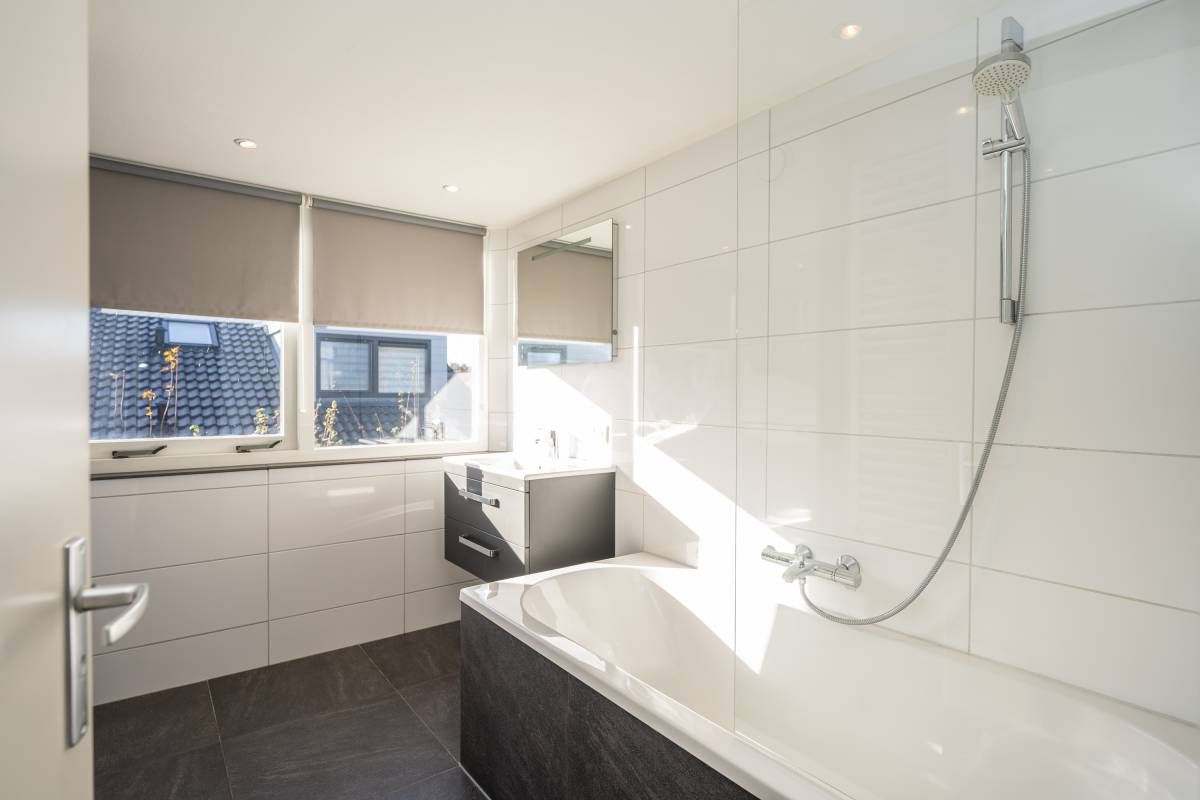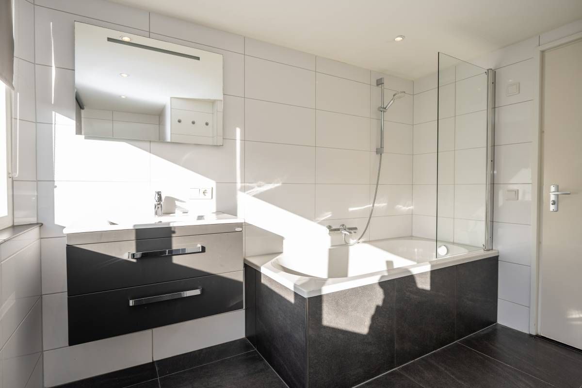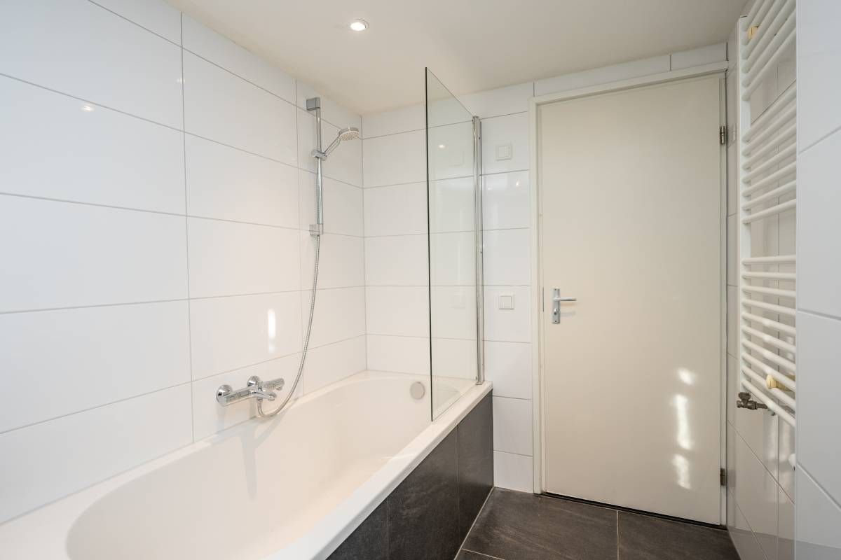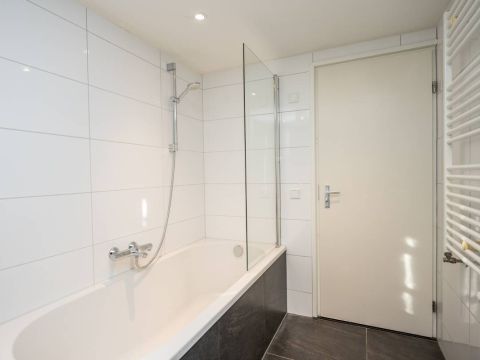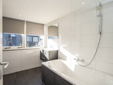 De moderne badkamer op deze verdieping is een fijne bonus: een ligbad met douche, een toilet en een stijlvol wastafelmeubel maken het geheel compleet.