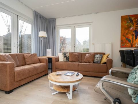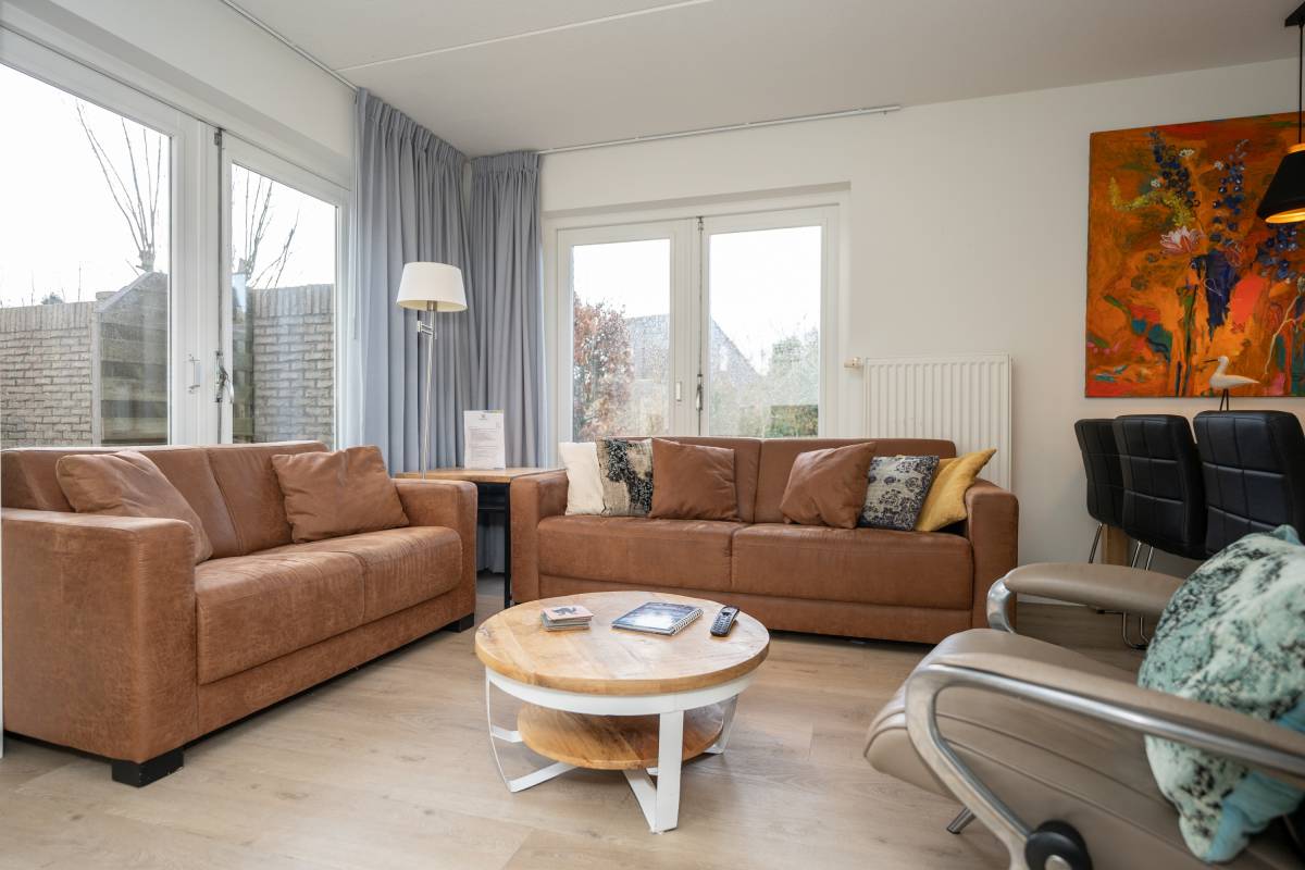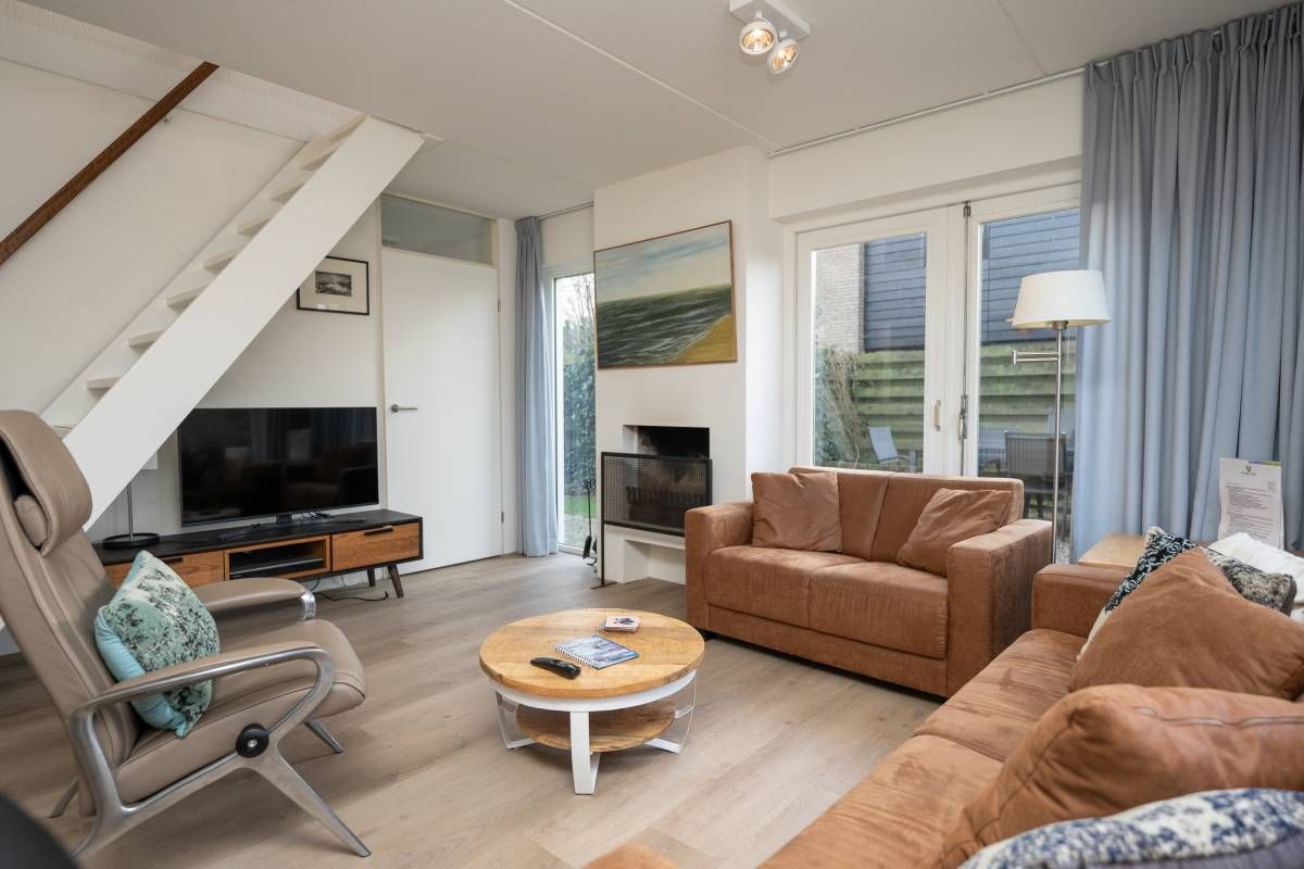 De woonkamer is heerlijk licht dankzij de openslaande deuren aan weerszijden, die de woonkamer verbindt met de omliggende tuin. De gezellige openhaard zorgt voor een knusse sfeer op de koudere dagen.