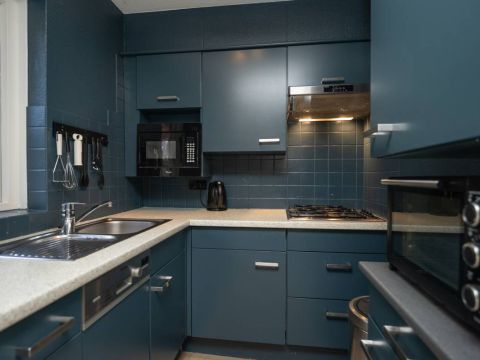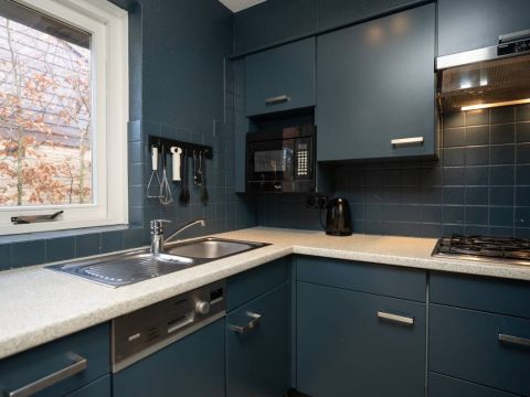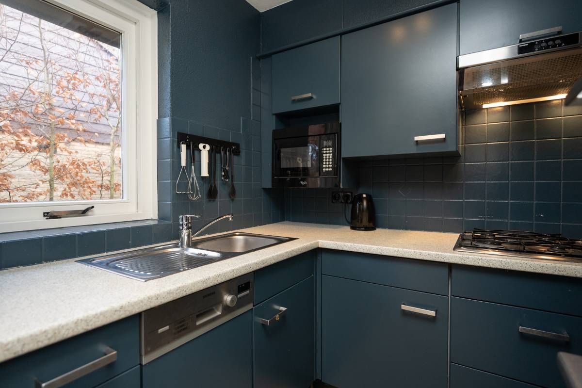 De stijlvolle keuken is uitgerust met alle benodigde apparatuur en heeft een nette afwerking.