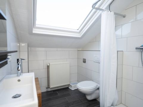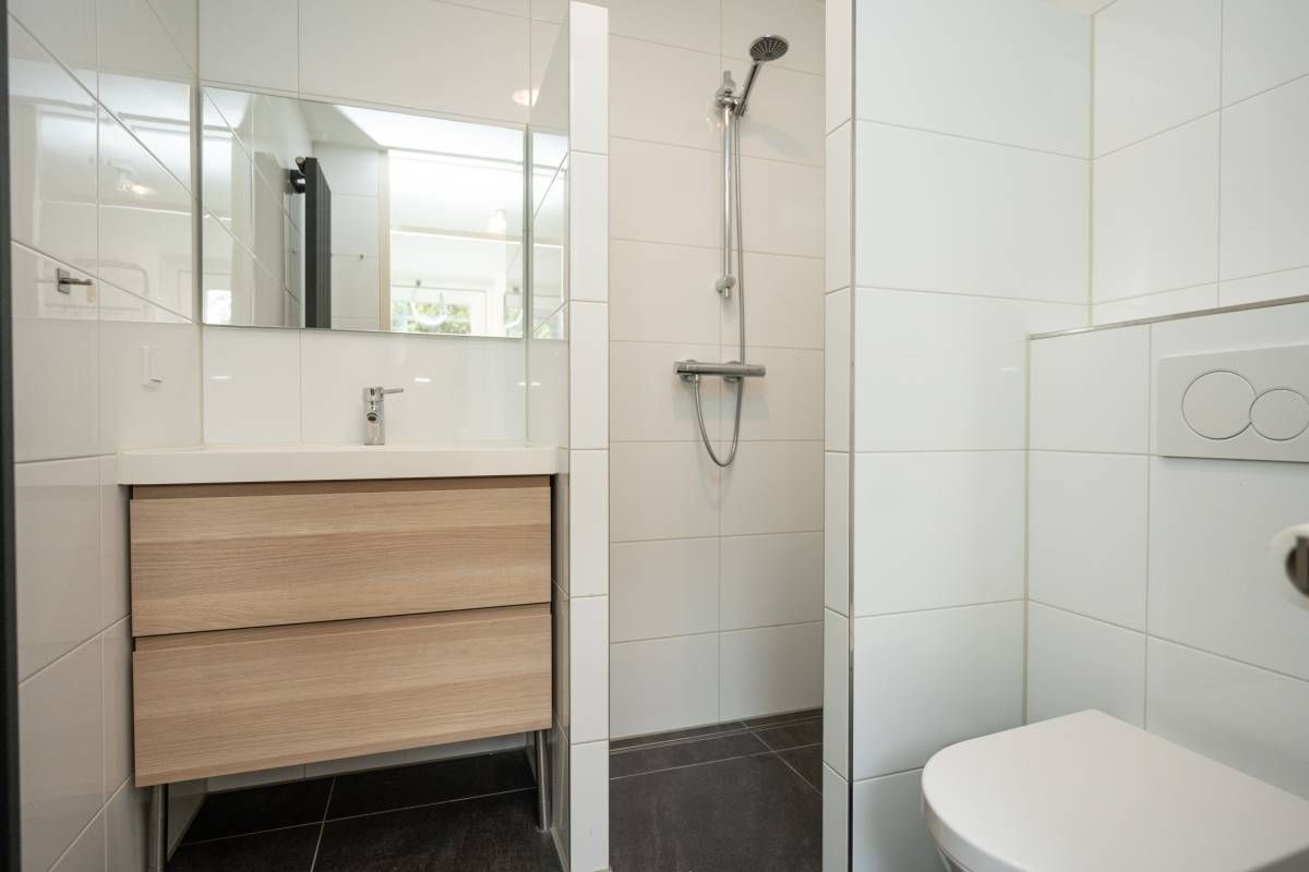 Via de trapopgang komt u op de verdieping. Hier bevinden zich twee prettige slaapkamers en een royale nette 2e badkamer met douche, wastafelmeubel, toilet en een groot Veluxdakraam.