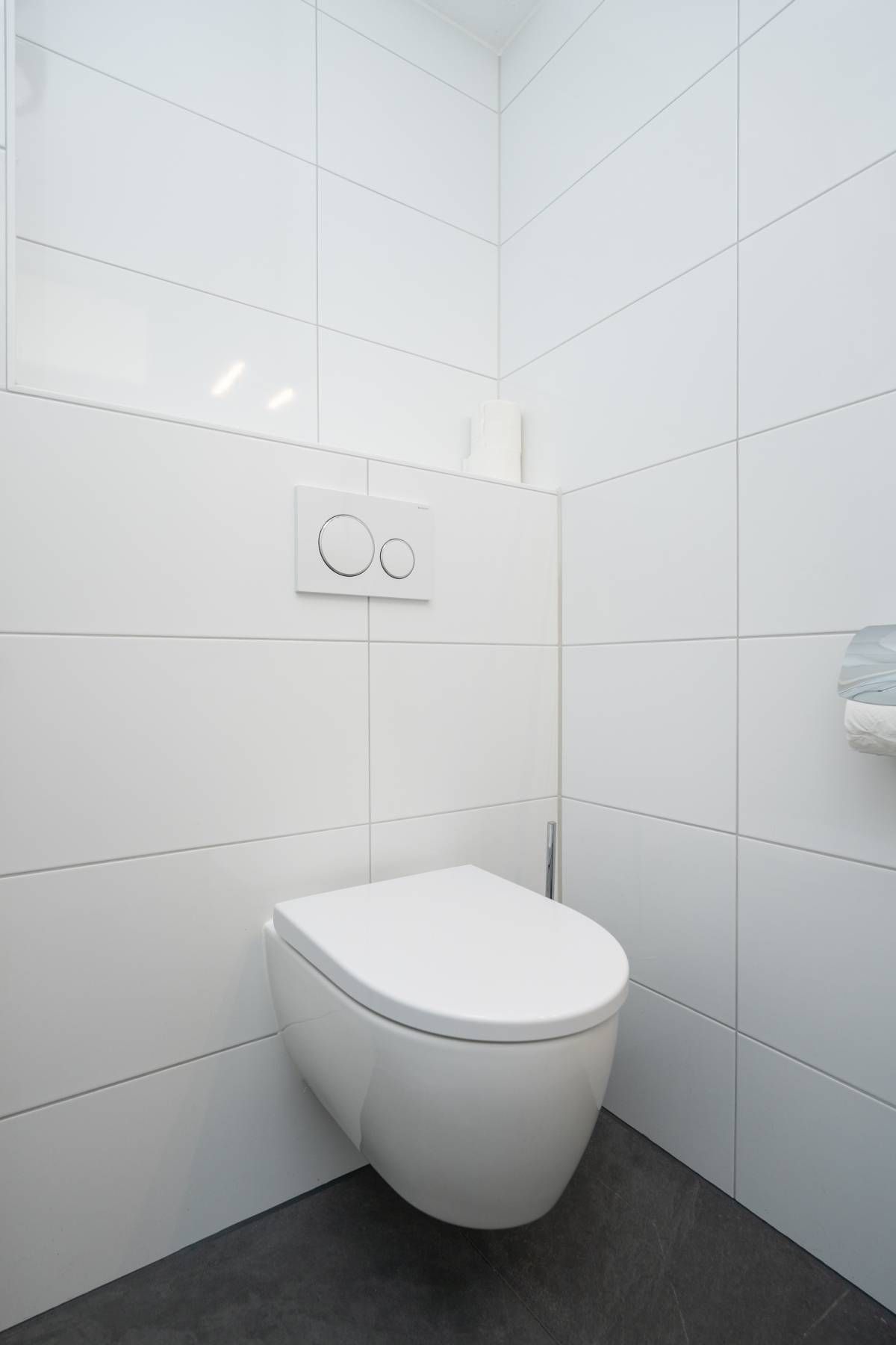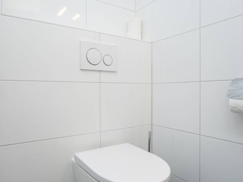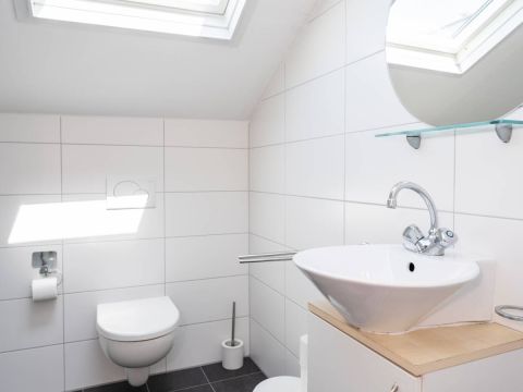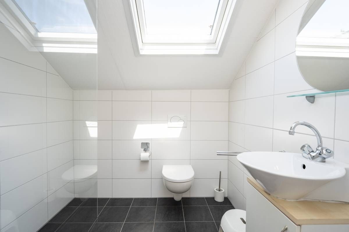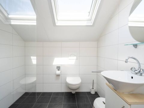 Ook op de verdieping is een moderne tweede badkamer aanwezig, voorzien van een zwevend toilet, een wastafelmeubel en een doucheruimte. Het grote dakraam zorgt voor een prachtige lichtinval en biedt extra ventilatie.