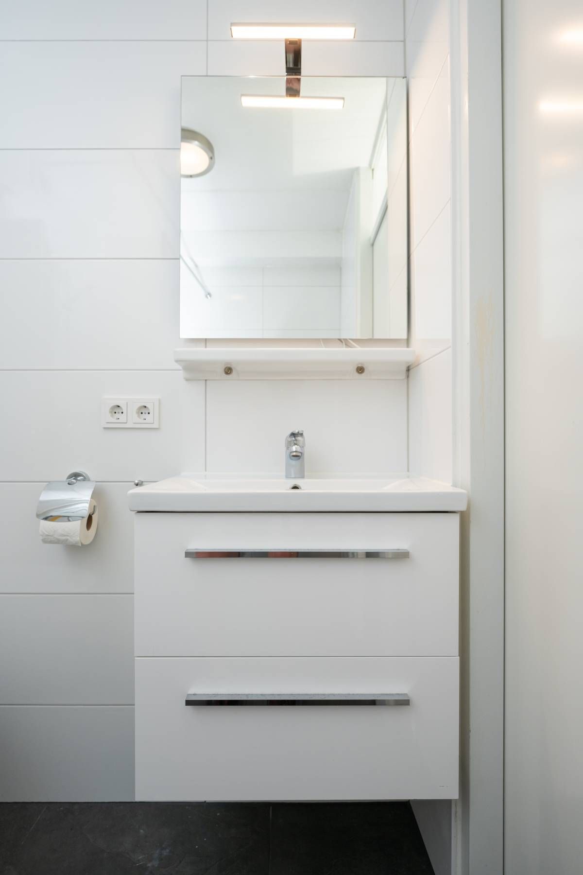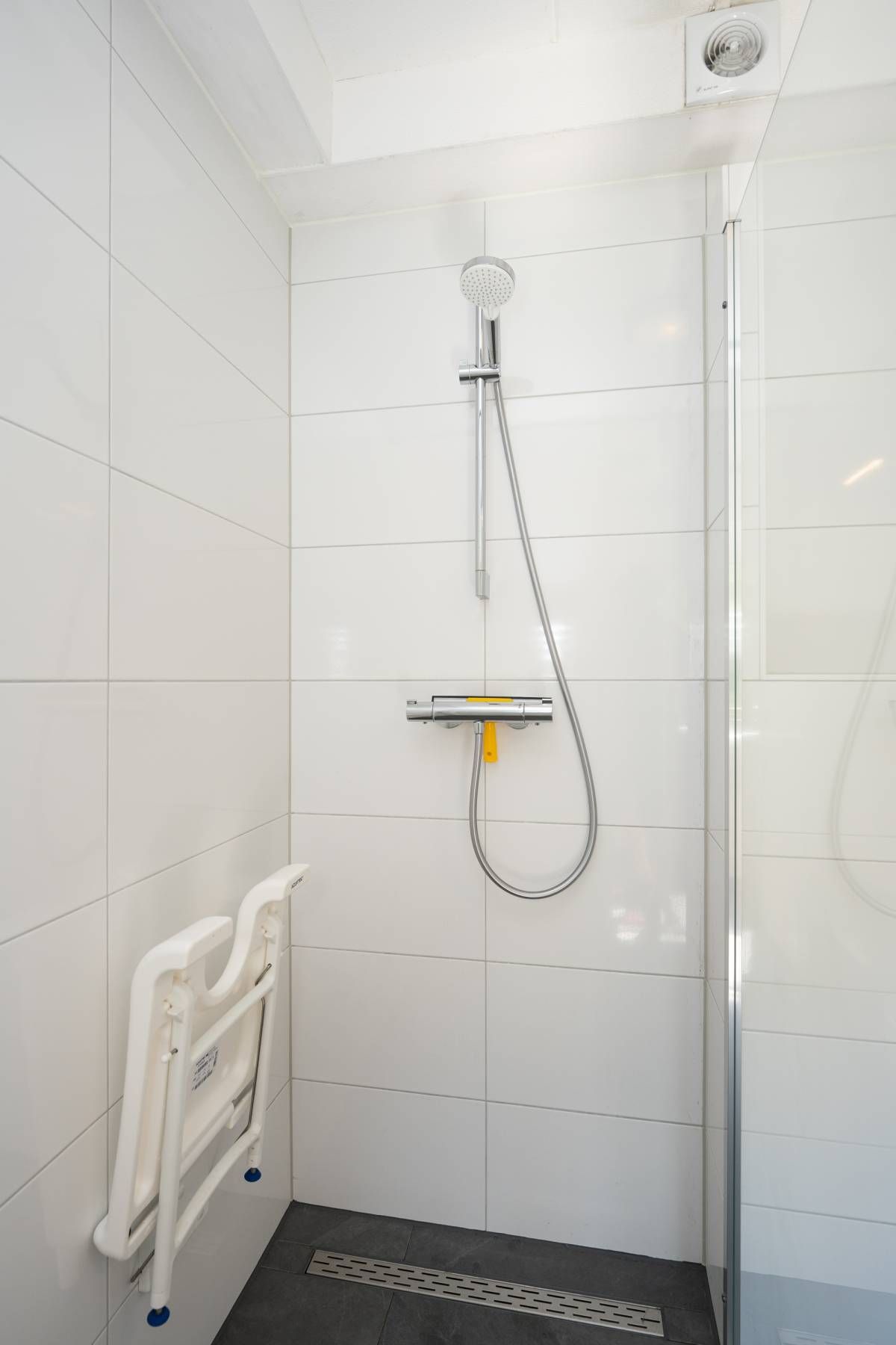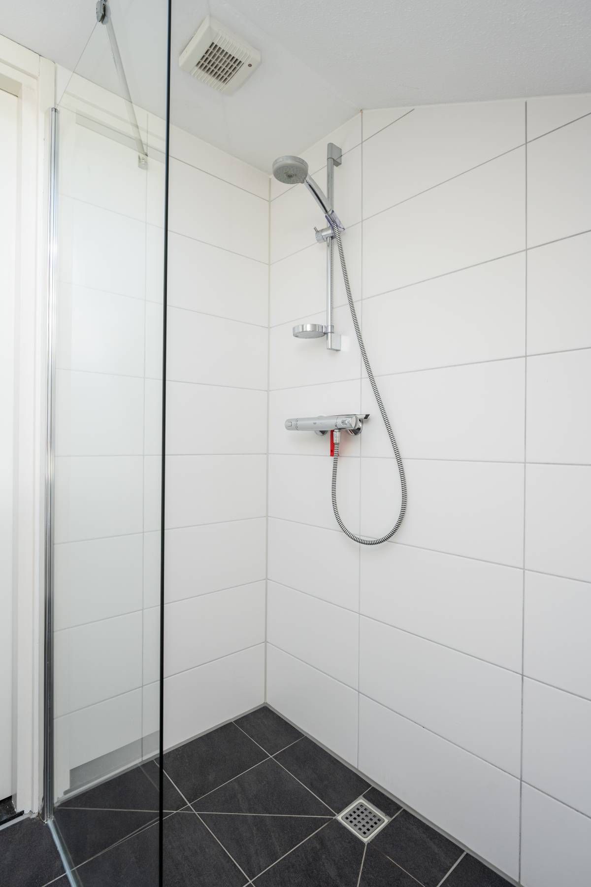 Ook op de verdieping is een moderne tweede badkamer aanwezig, voorzien van een zwevend toilet, een wastafelmeubel en een doucheruimte. Het grote dakraam zorgt voor een prachtige lichtinval en biedt extra ventilatie.