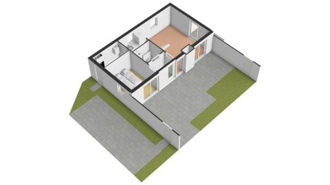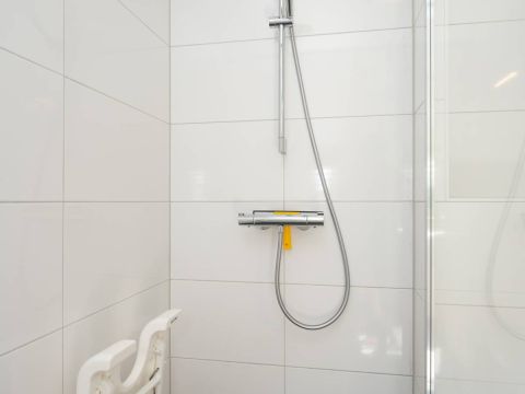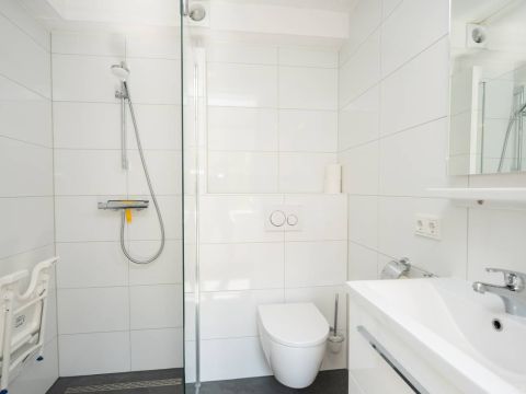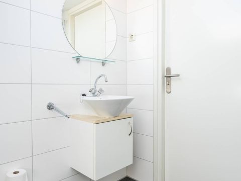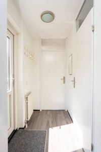 In de hal bevindt zich de nette badkamer. Deze is voorzien van toilet, wastafelmeubel en een doucheruimte. De slaapkamer op de begane grond heeft uitzicht op de omsloten tuin.