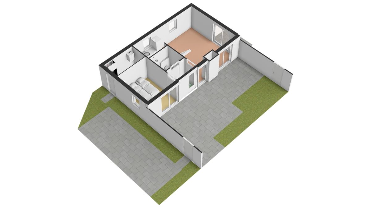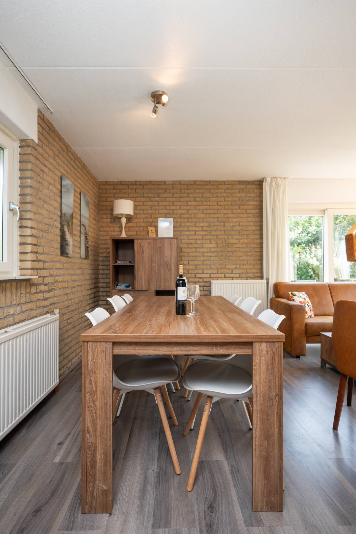 De schuifpui naar het terras zorgt voor een vloeiende overgang tussen binnen- en buitenruimte, wat het wooncomfort vergroot.