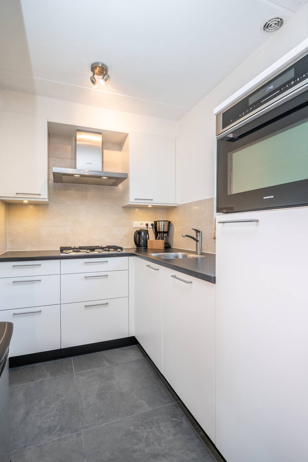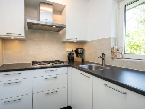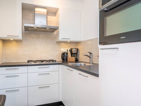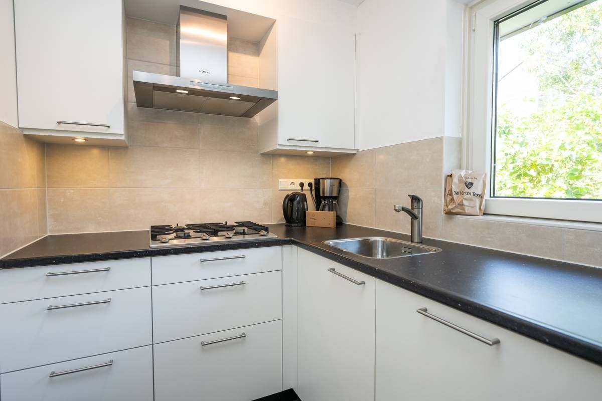 Aansluitend de half open keuken. De keuken beschikt over diverse moderne inbouwapparatuur, en biedt voldoende werk- en opbergruimte.