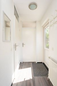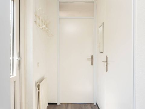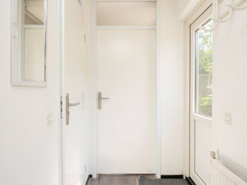 Entree in de hal met toegang tot de badkamer en doorloop naar de woonkamer. De woonkamer is verzorgd afgewerkt en profiteert van veel daglicht dankzij de grote raampartijen. De open haard draagt bij aan een aangename sfeer, ideaal voor ontspannen gebruik tijdens de koudere dagen.