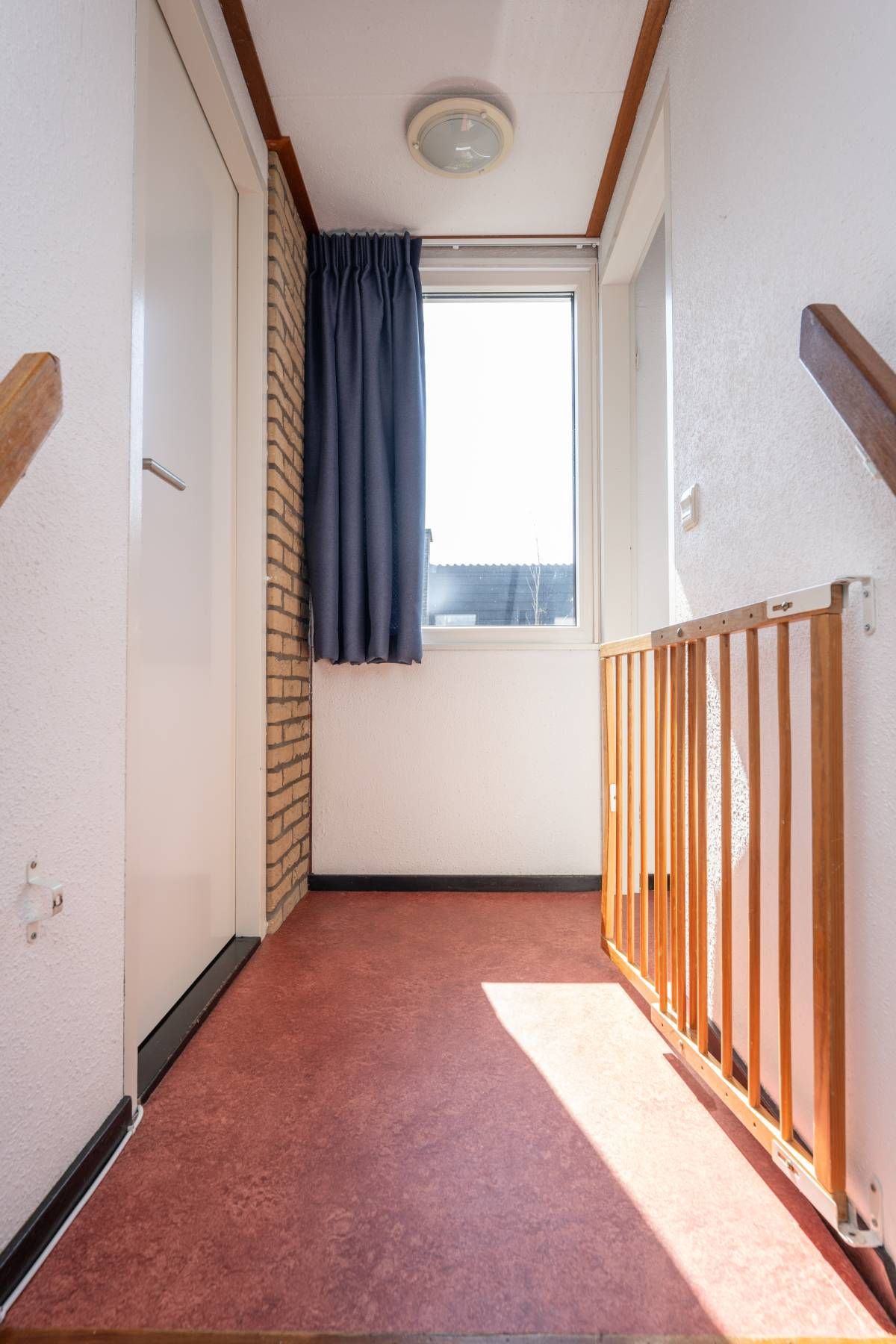 De onverwoestbare linoleum vloer op de gehele verdieping is in een warme roodtint.