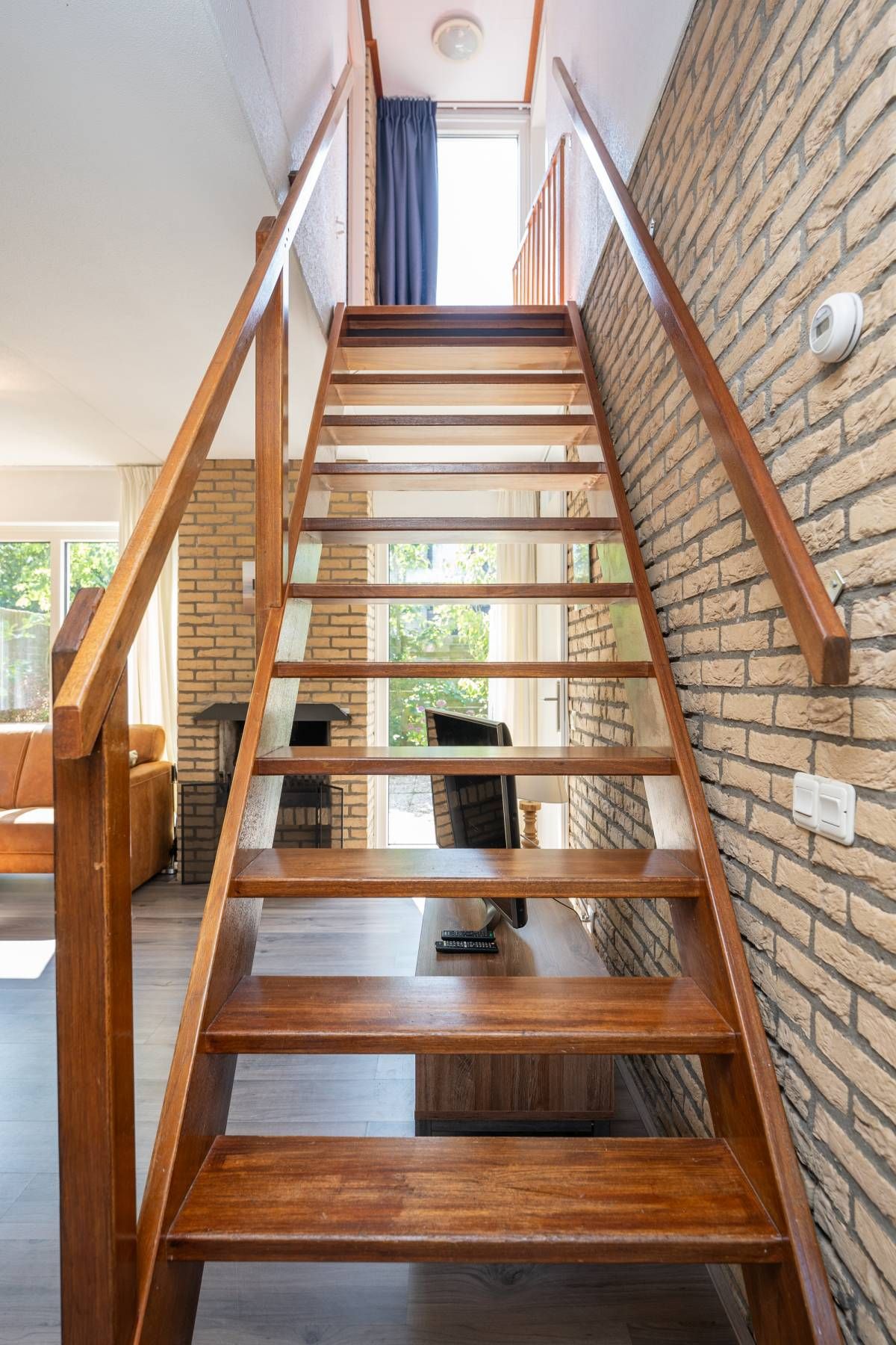 Middels de open trap in de woonkamer bereikt u de verdieping met toegang tot twee slaapkamers en een badkamer.