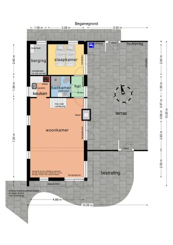 Via de voordeur komt u de woning binnen. De hal biedt u toegang tot de woonkamer, de slaapkamer op de begane grond en de badkamer.