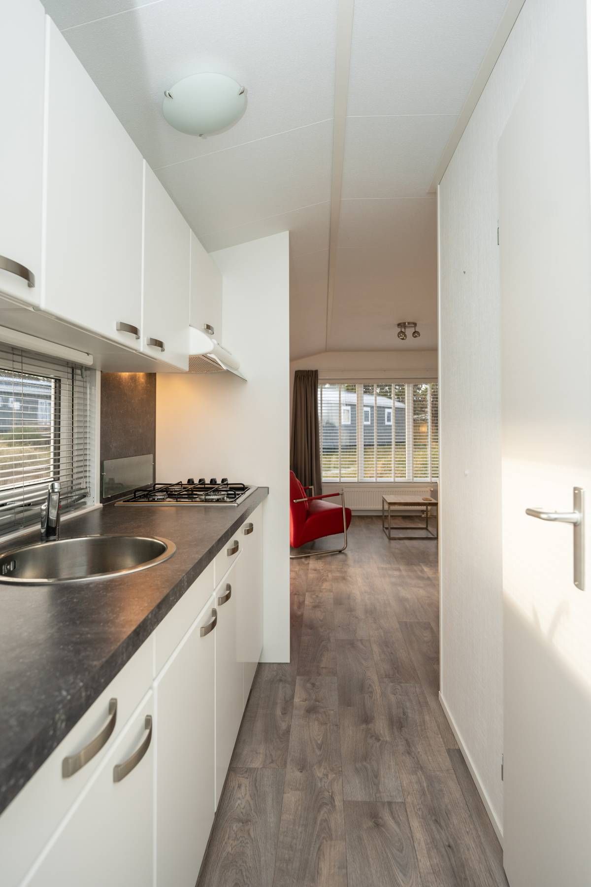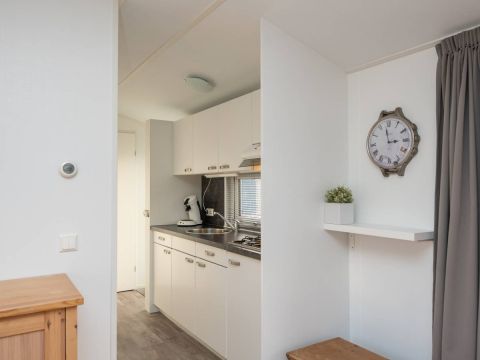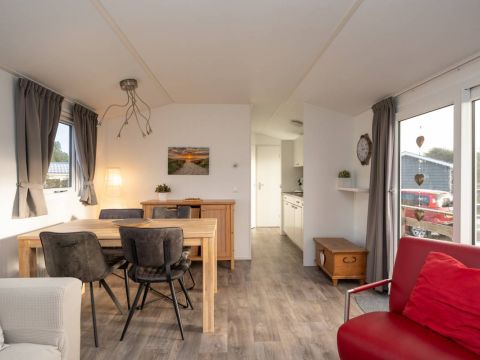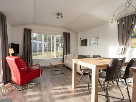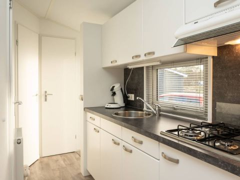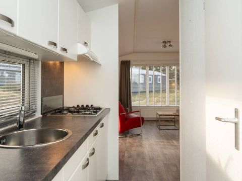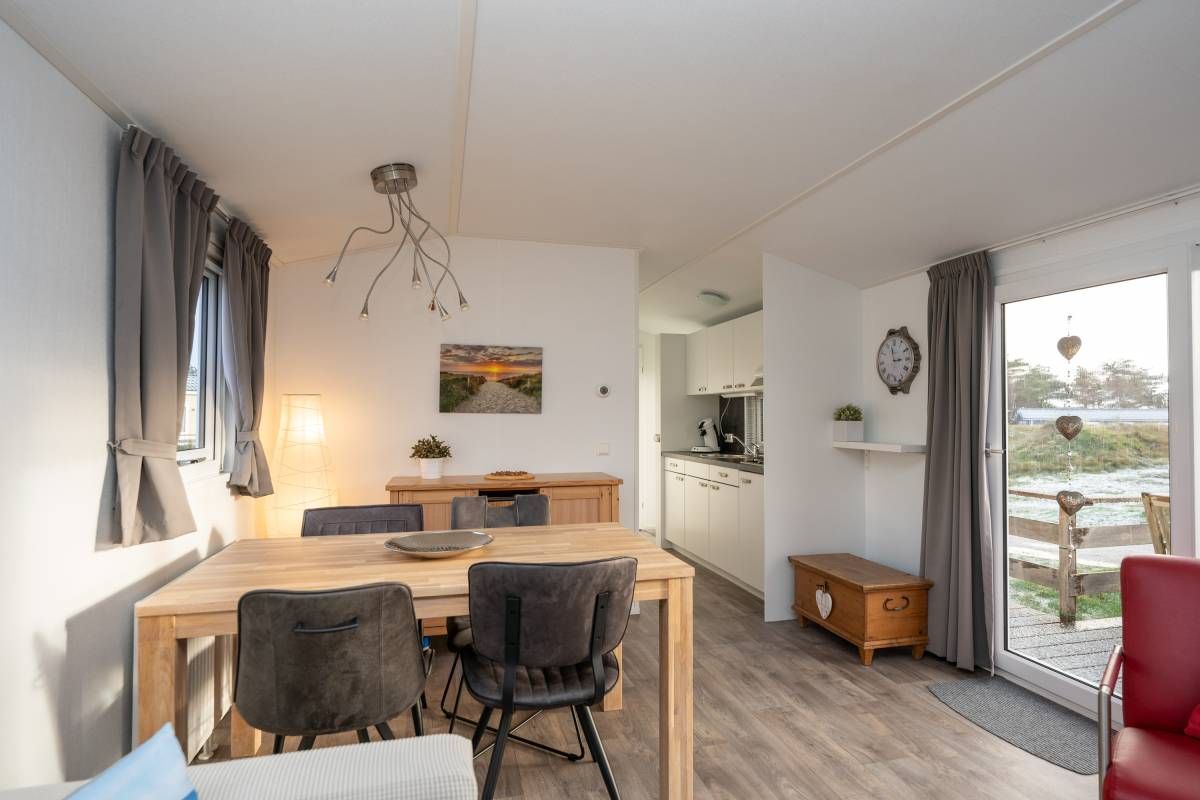 De woonkamer staat in open verbinding met de moderne keuken. Deze is praktisch ingedeeld en voorzien van diverse voorzieningen die je van een comfortabel chalet mag verwachten, met voldoende werk- en opbergruimte. Een fijne plek om een ontbijt te bereiden of uitgebreid te koken.