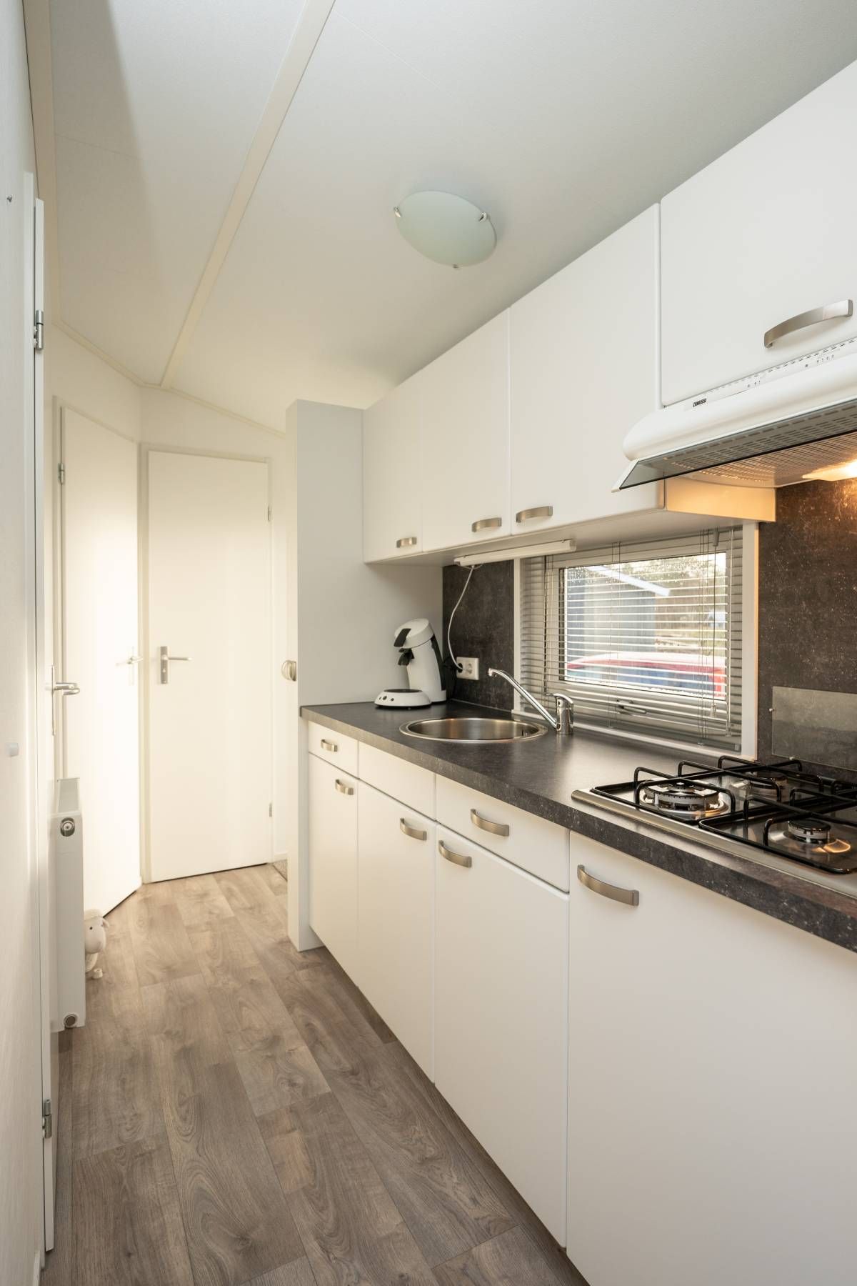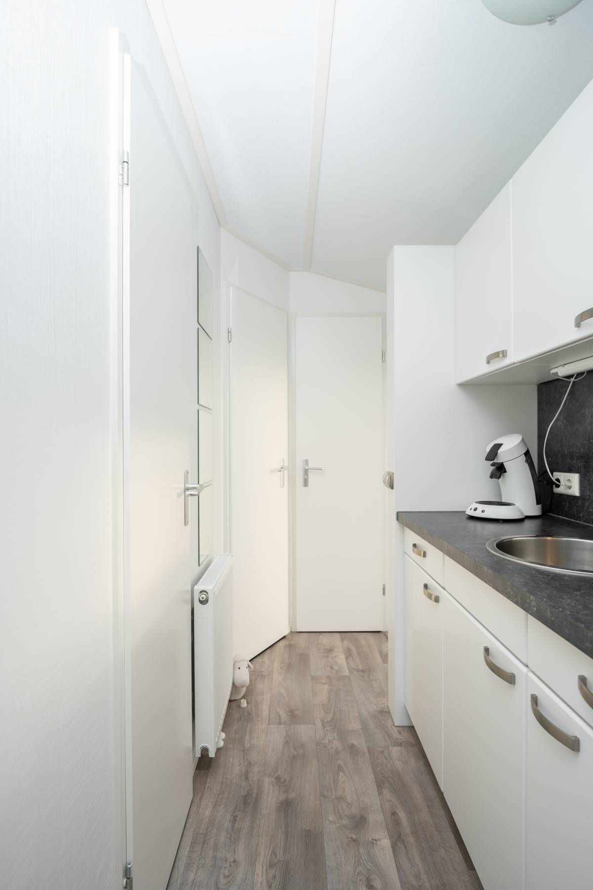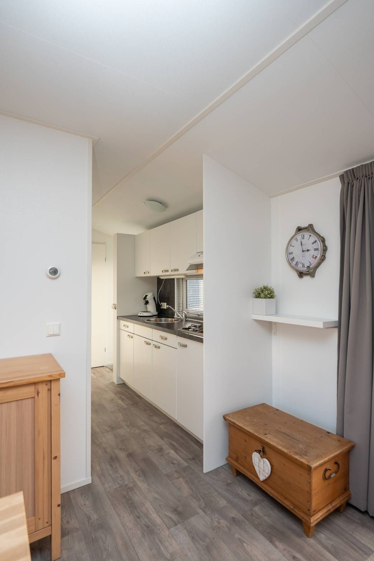 De woonkamer staat in open verbinding met de moderne keuken. Deze is praktisch ingedeeld en voorzien van diverse voorzieningen die je van een comfortabel chalet mag verwachten, met voldoende werk- en opbergruimte. Een fijne plek om een ontbijt te bereiden of uitgebreid te koken.