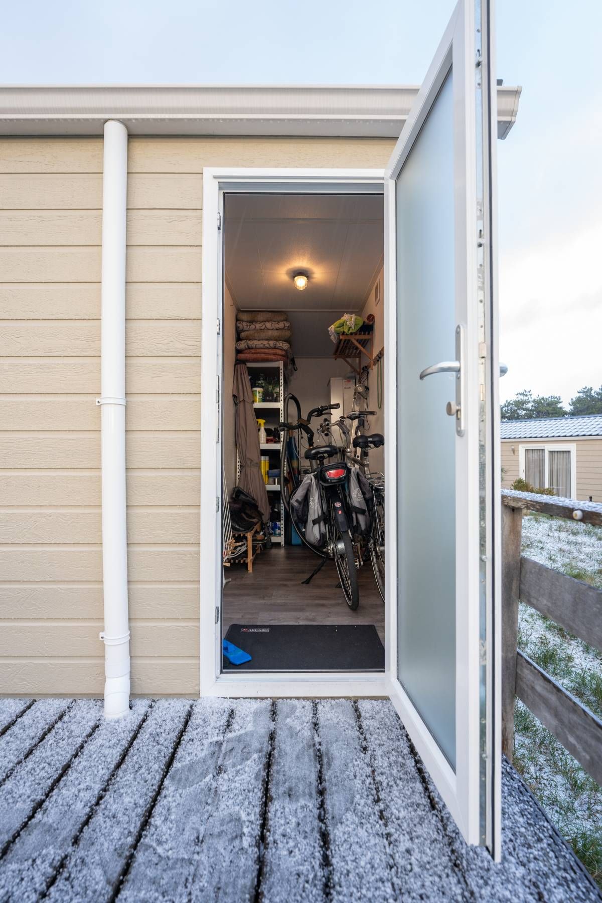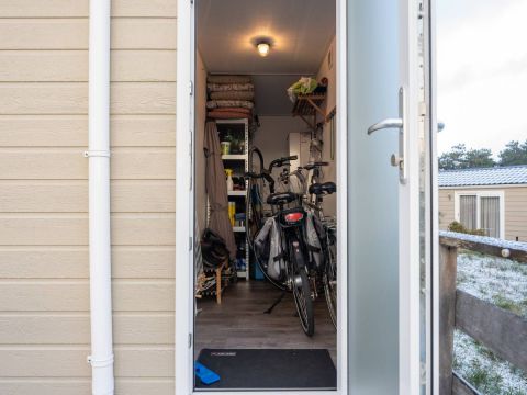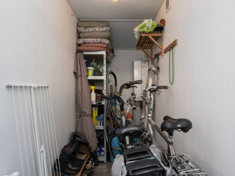 De berging is buitenom bereikbaar. Hier treft u de aansluitingen voor de wasmachine en droger, de opstelplaats van de cv-ketel én voldoende ruimte voor fietsen of extra opslag. Perfect om alle strandspullen, buitenmeubilair of voorraad op te slaan.