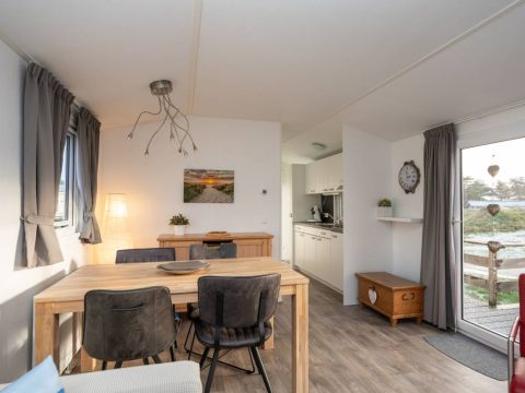 Bij binnenkomst valt direct de lichte en prettige woonkamer op. Vanaf de zit– of eethoek kijkt u heerlijk weg over de omliggende natuur. Via de schuifpui loopt u zo het royale houten vlonderterras op.