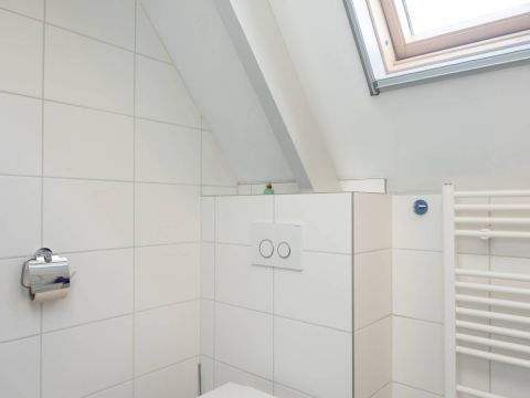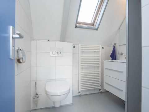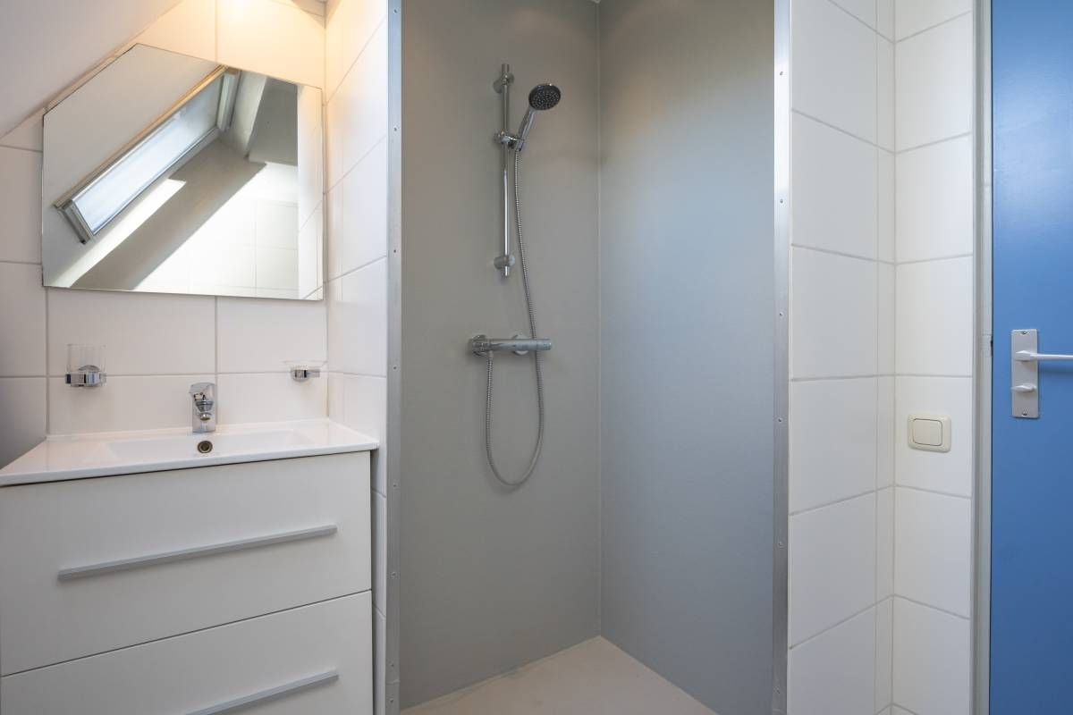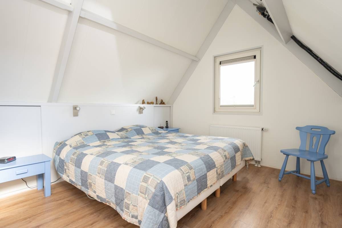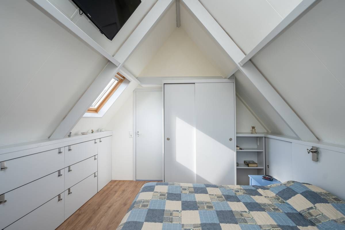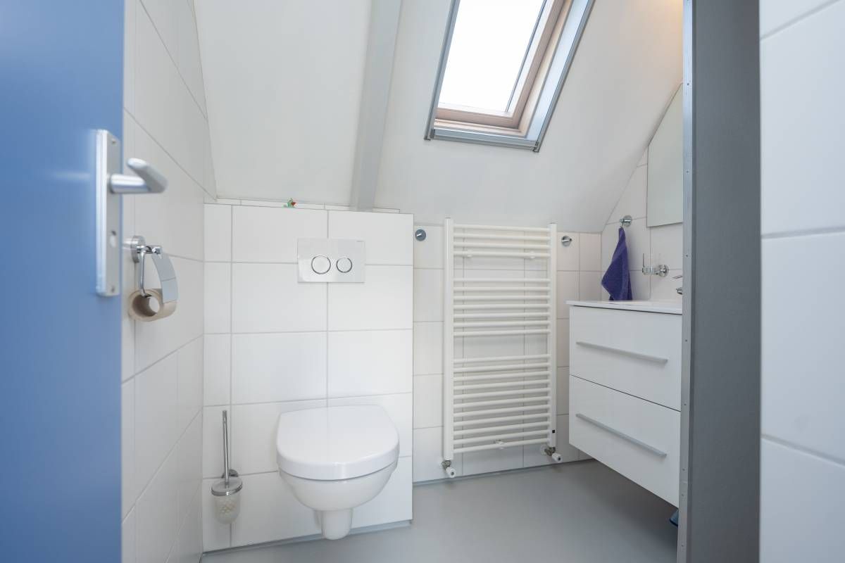 Verdieping: Overloop, 2 royale slaapkamers en een moderne badkamer met groot dakraam, een inloop douche, een 2e toilet en een design radiator. De royale slaapkamers op de verdieping bieden voldoende bergruimte en middels een luik in de wand heeft u toegang tot de vliering.