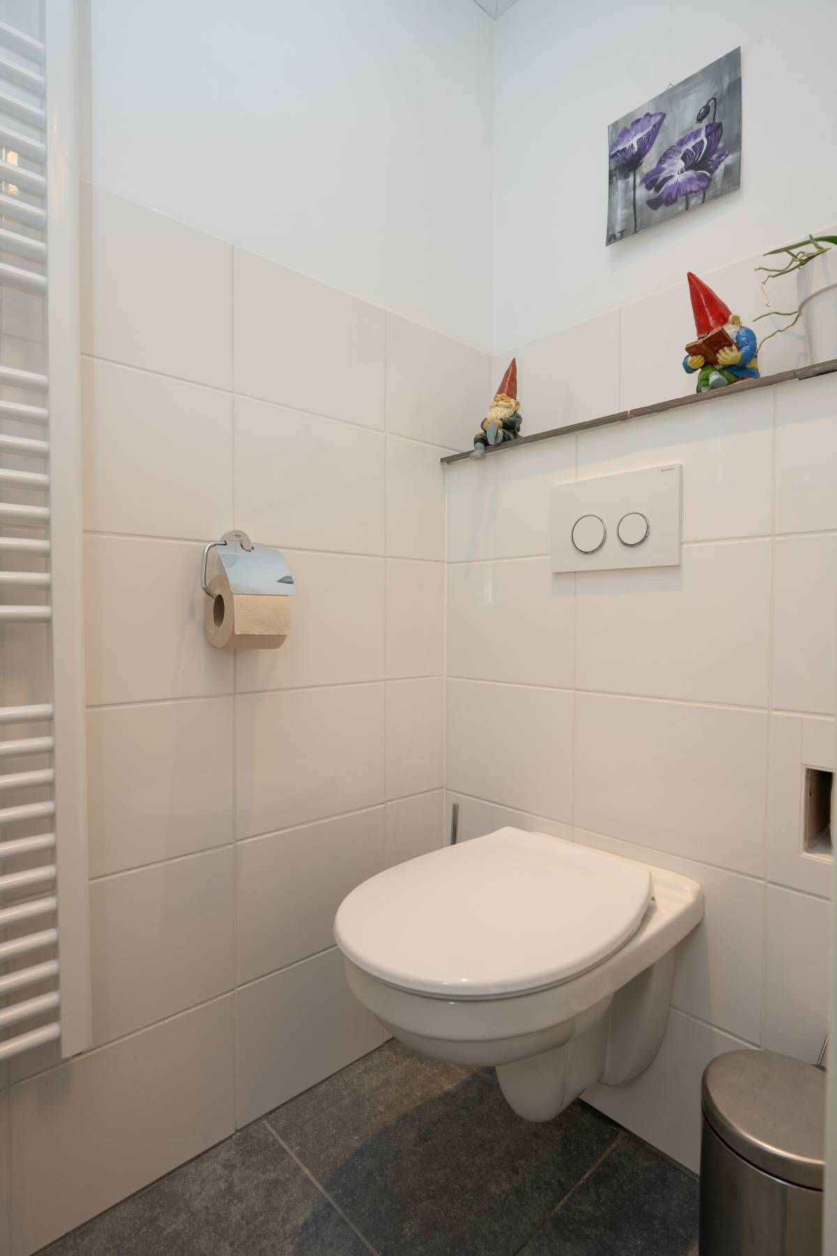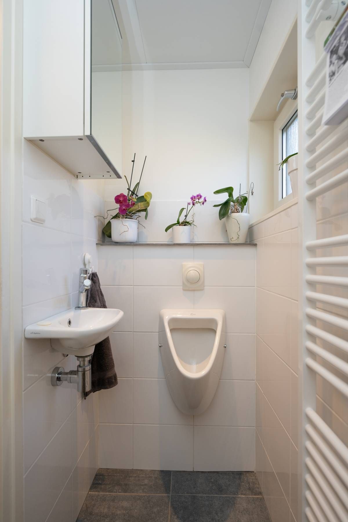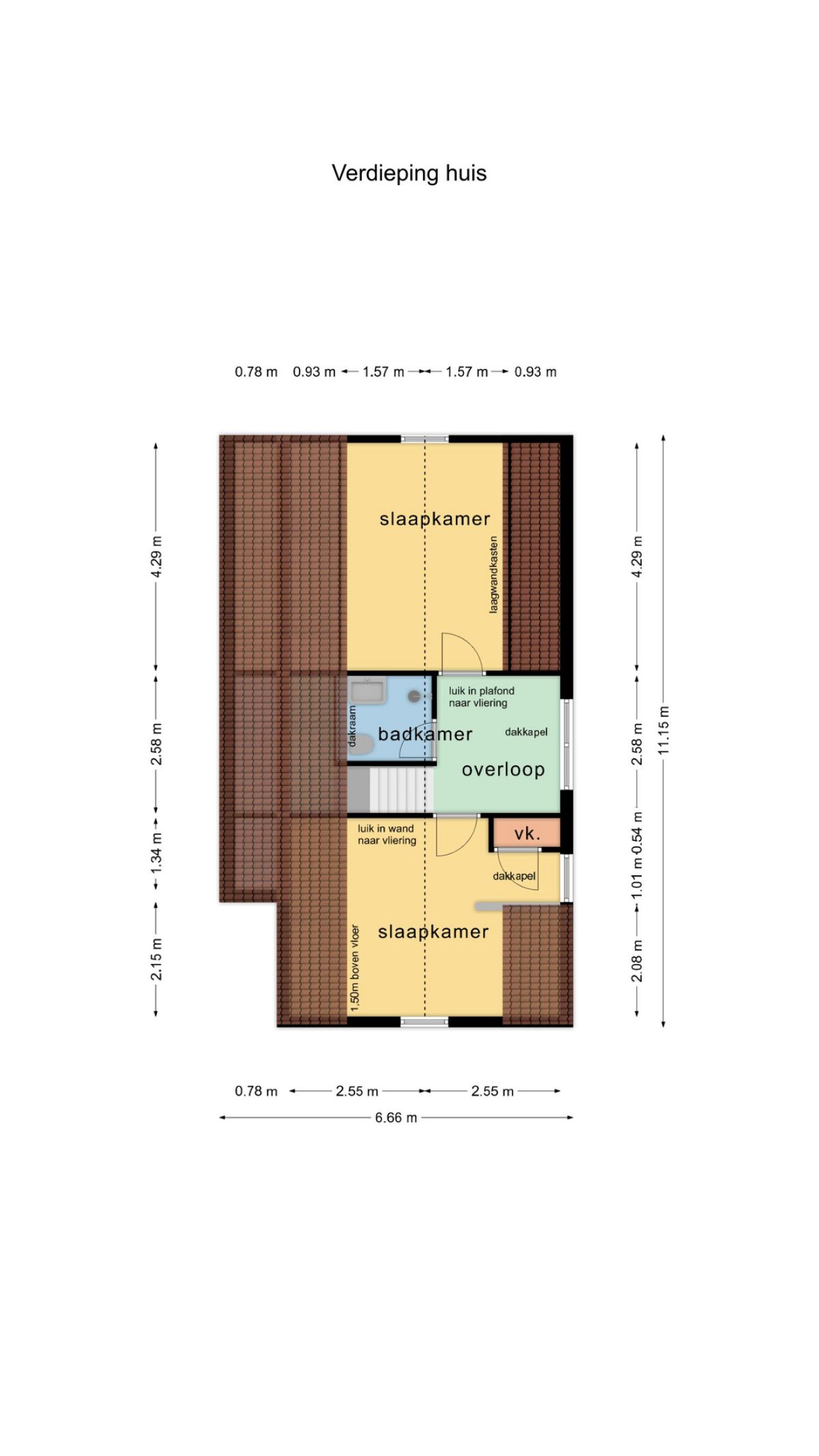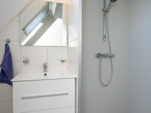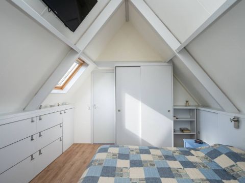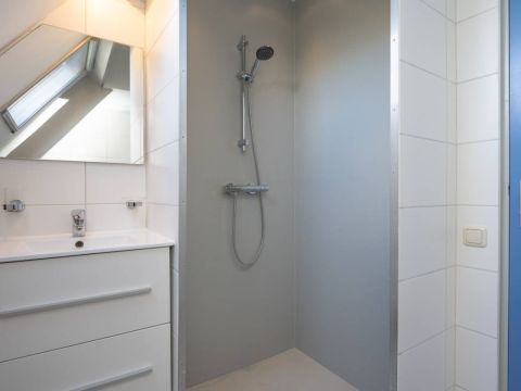 Verdieping: Overloop, 2 royale slaapkamers en een moderne badkamer met groot dakraam, een inloop douche, een 2e toilet en een design radiator. De royale slaapkamers op de verdieping bieden voldoende bergruimte en middels een luik in de wand heeft u toegang tot de vliering.