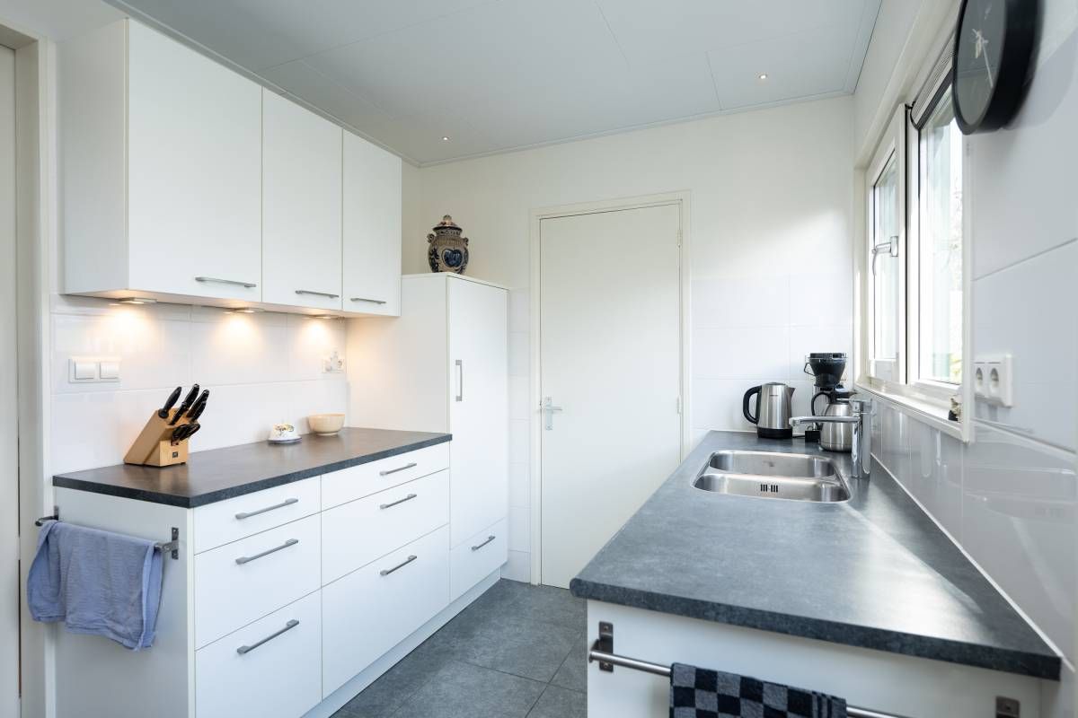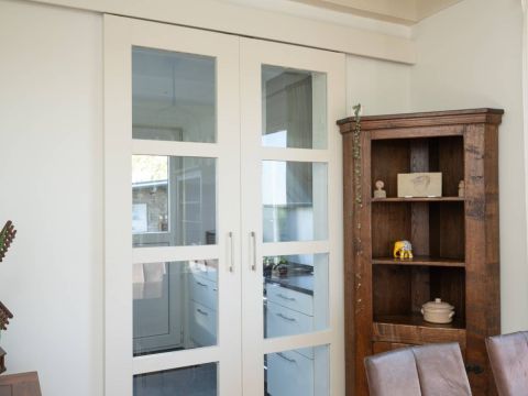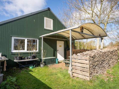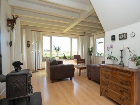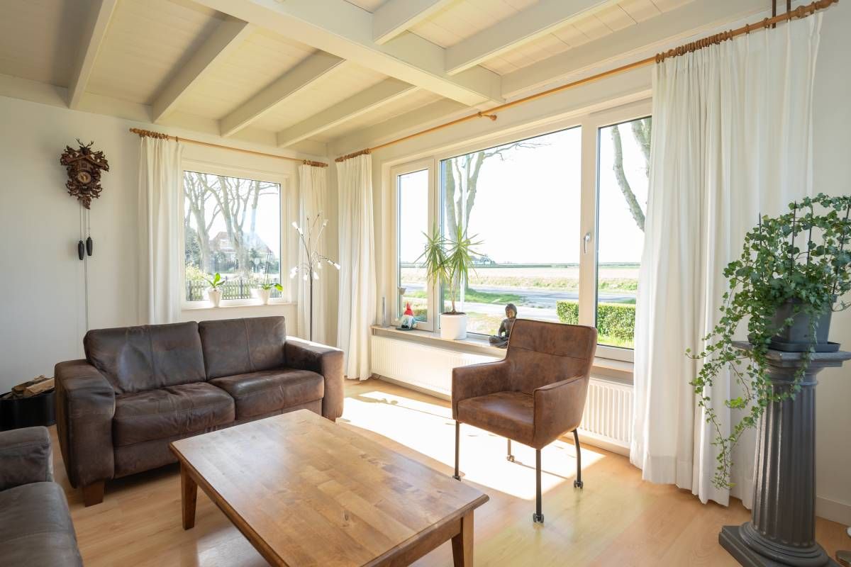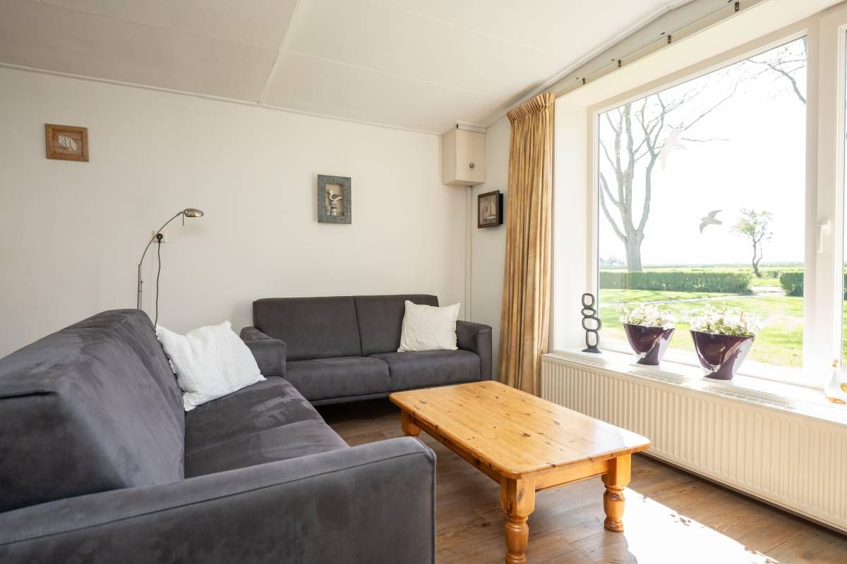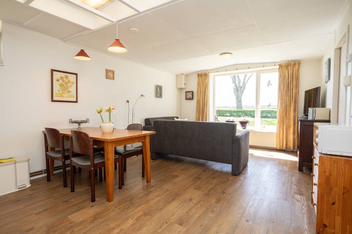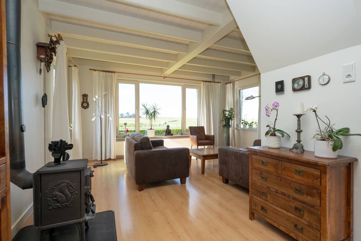 Het woonhuis: Hal/entree met toegang tot de slaapkamer/kantoor en tot de woonkamer met een heerlijk weids uitzicht over het landschap. Vanuit de woonkamer (en eveneens vanuit de hal) is de slaapkamer bereikbaar. Aan de achterzijde van de woonkamer bevinden zich de schuifdeuren. Deze geven toegang tot de uitgebreide keuken (compleet en netjes uitgevoerd), vervolgens de berging/bijkeuken en aansluitend het dubbele toilet.
