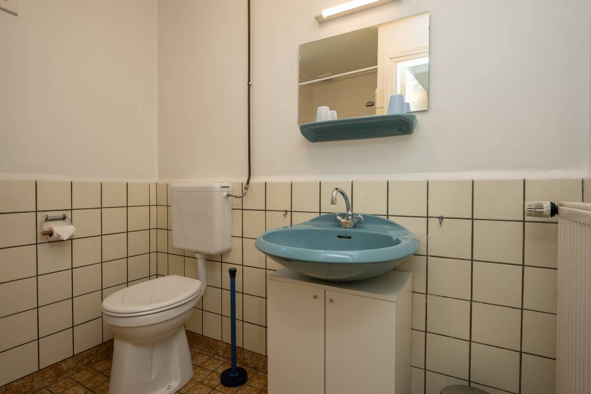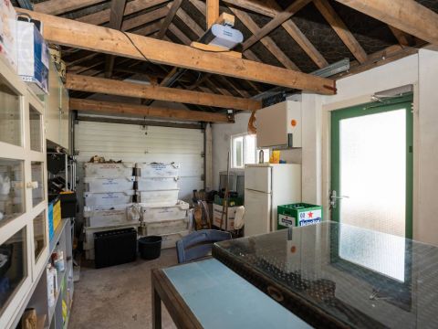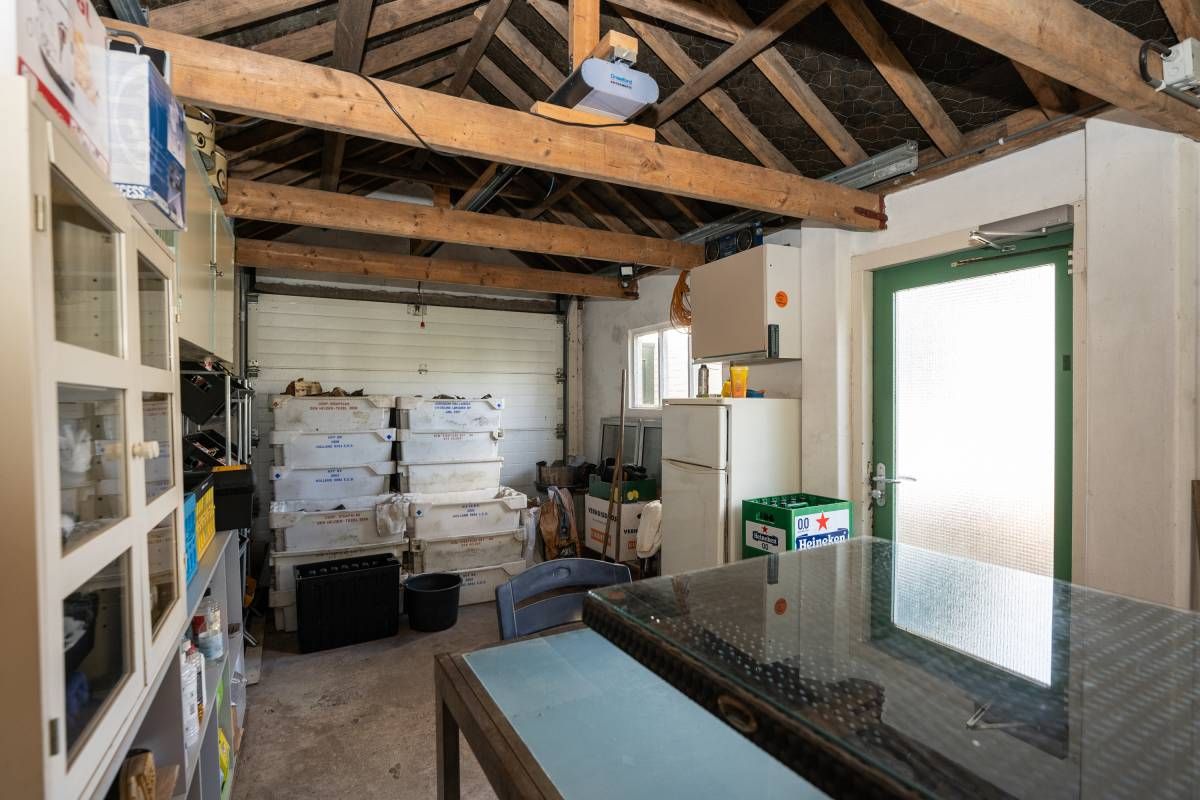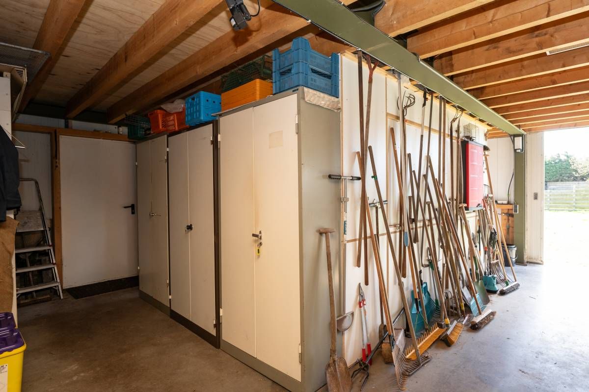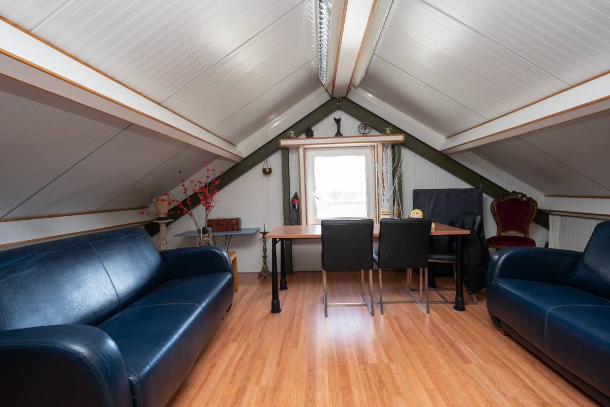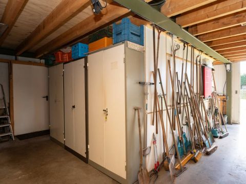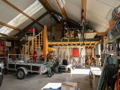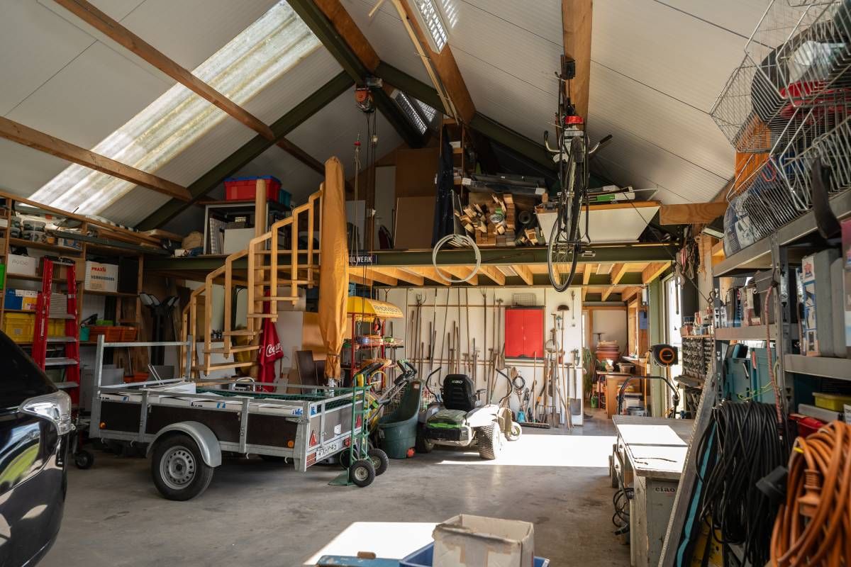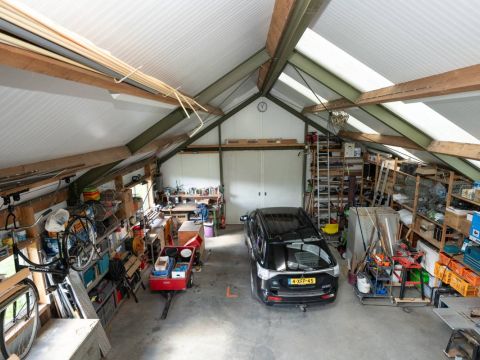 Meer naar achter op het perceel staat een grote multifunctionele loods (ca 8x17 meter) voorzien van een loopkat. Wat een rijkdom! Hierin bevindt zich een dubbele toiletgroep en een spiltrap naar de verdieping. Deze zolder beslaat bijna de helft van de oppervlakte begane grond. Hier is thans een comfortabele verblijfsruimte gerealiseerd.