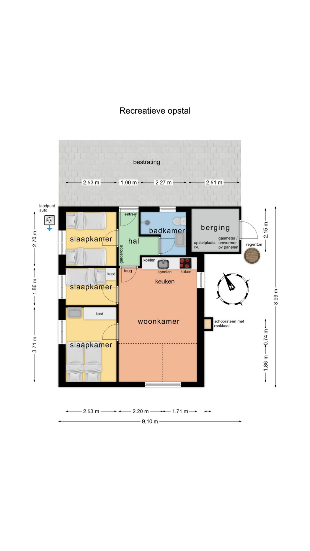 Aan de linkerzijde van de woning bevindt zich een recreatief opstal: Hal/entree, badkamer, woonkamer en 3 slaapkamers. Aangebouwde berging. Alles keurig netjes en eenvoudig van opzet en voorzien van een eigen cv-installatie.