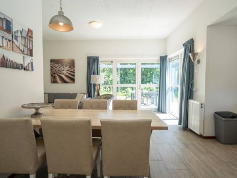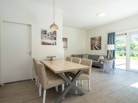 De living beschikt over een sfeervolle zit– en eethoek. Middels de openslaande deuren betreed u het beschutte terras.
