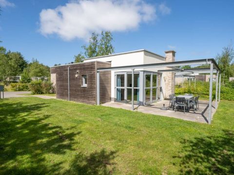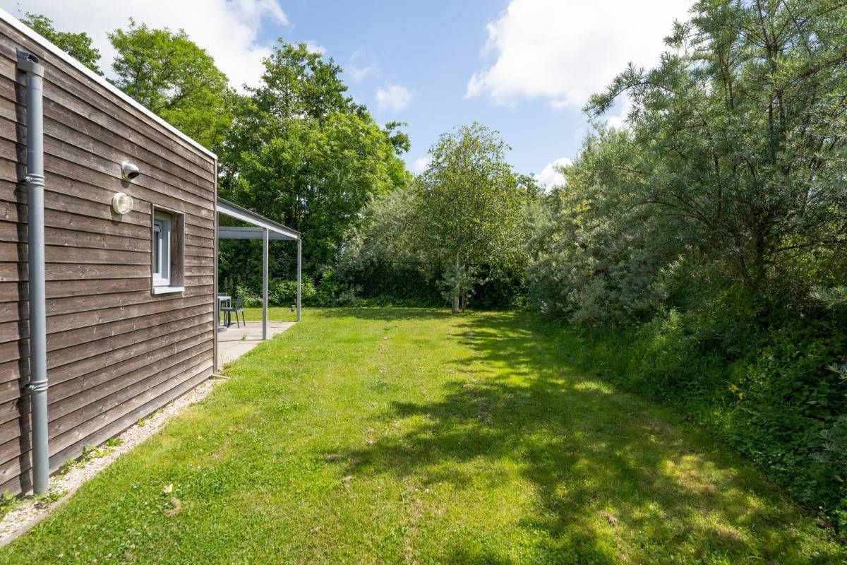 Gelegen op Kustpark Texel, nabij het dennenbos en de toeristische badplaats De Koog, staat deze moderne recreatiewoning (2015) op een hoekperceel eigen grond van 566 m².
