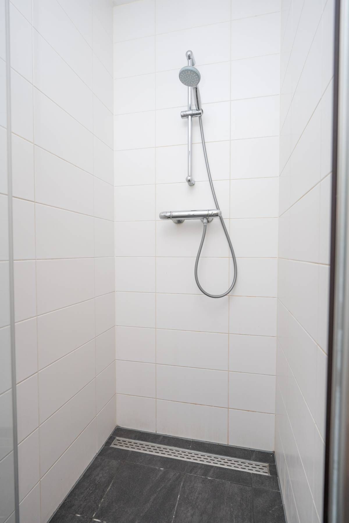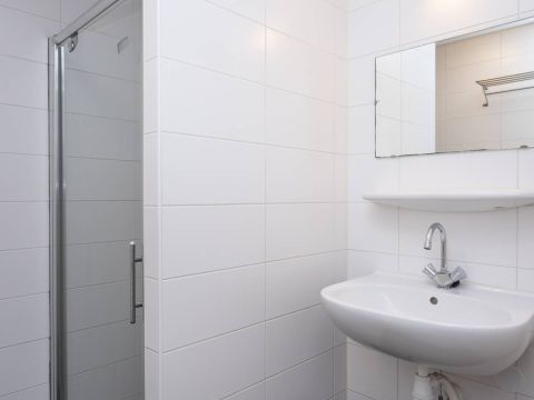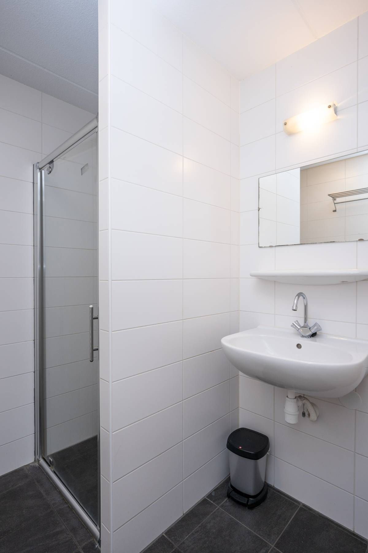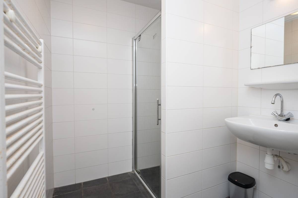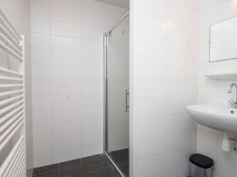 De verzorgde badkamer heeft een inloopdouche met glazen deur en een wastafel. Alles is netjes afgewerkt en functioneel ingericht.
