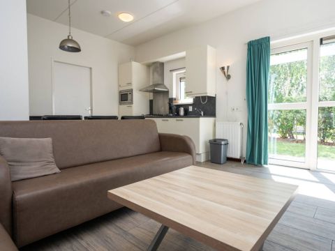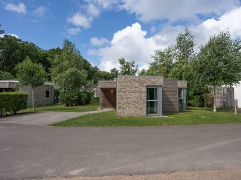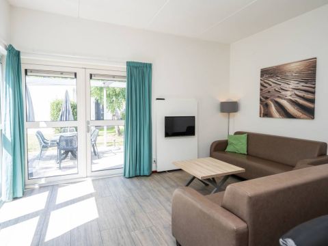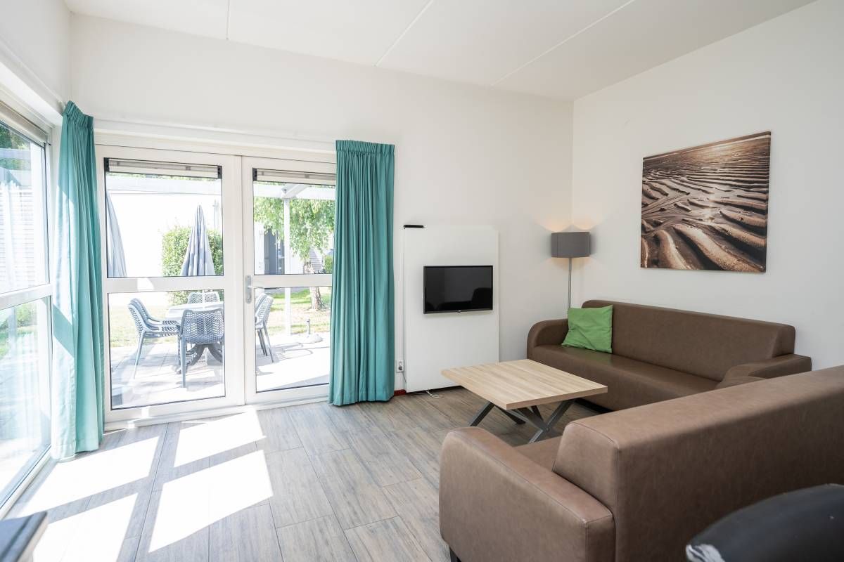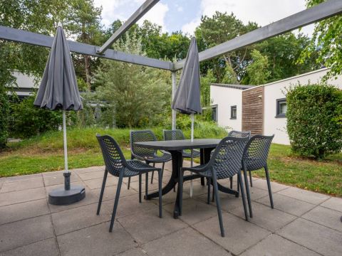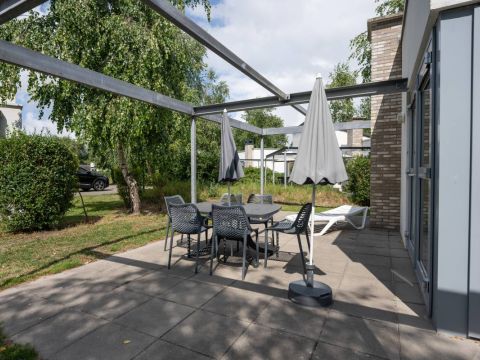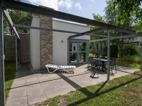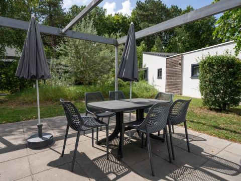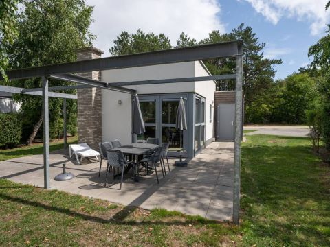 Rondom de bungalow is een keurig verzorgde tuin gesitueerd op het zuidwesten. Het ruime terras is ideaal om te genieten van lange zomeravonden, een goed boek in de zon of een gezellig etentje met familie en vrienden.