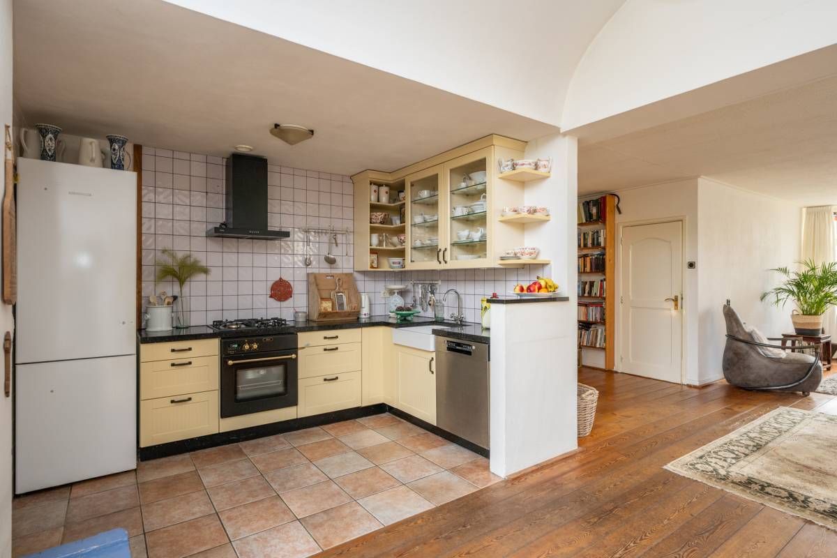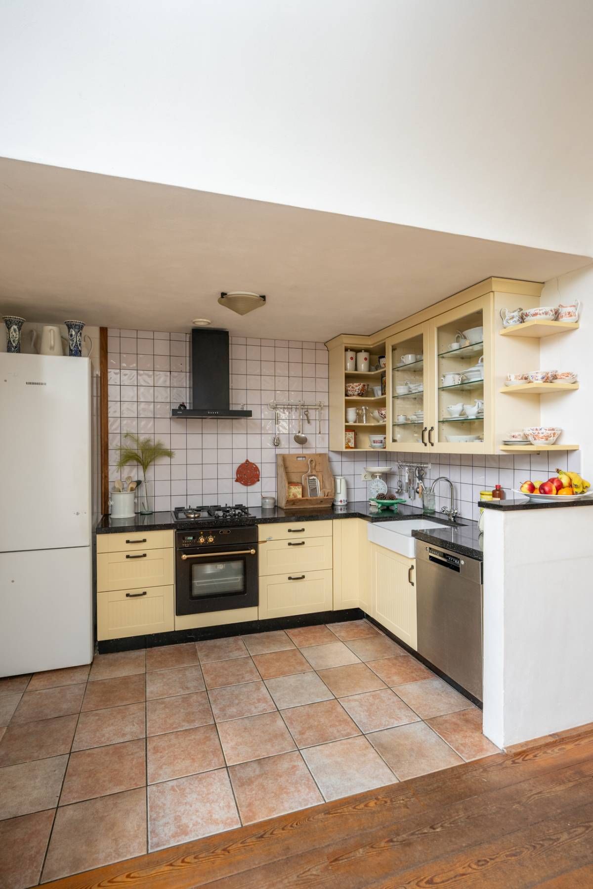De gezellige keuken in hoekopstelling is uitgerust met een gasfornuis, afzuigkap, oven, vaatwasser en een vrijstaande koelvriescombinatie, en biedt voldoende opbergruimte door middel van meerdere lades en kastruimte.